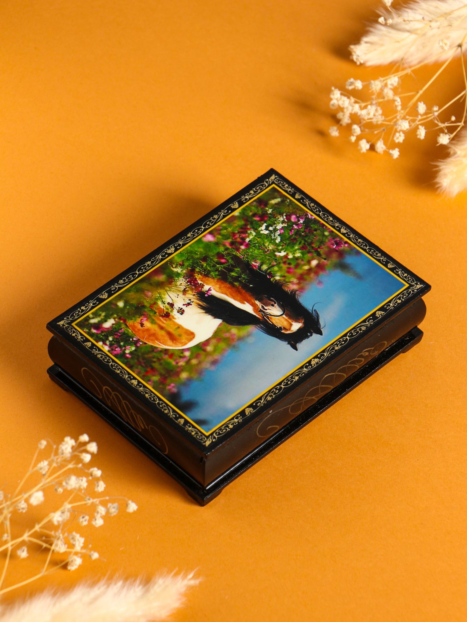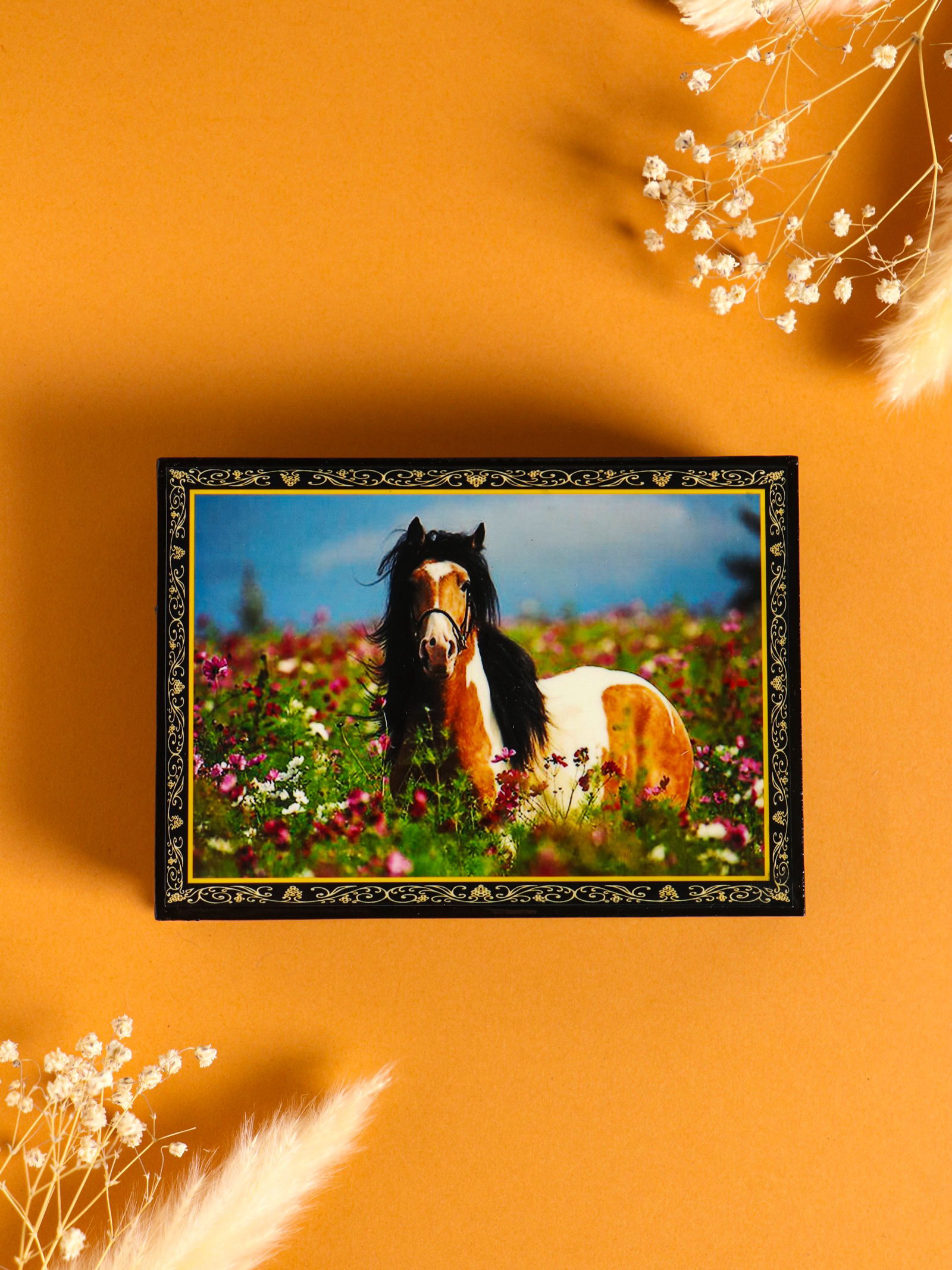 Шкатулка "Конь на лугу", 10x14 см, лаковая миниатюра, Россия