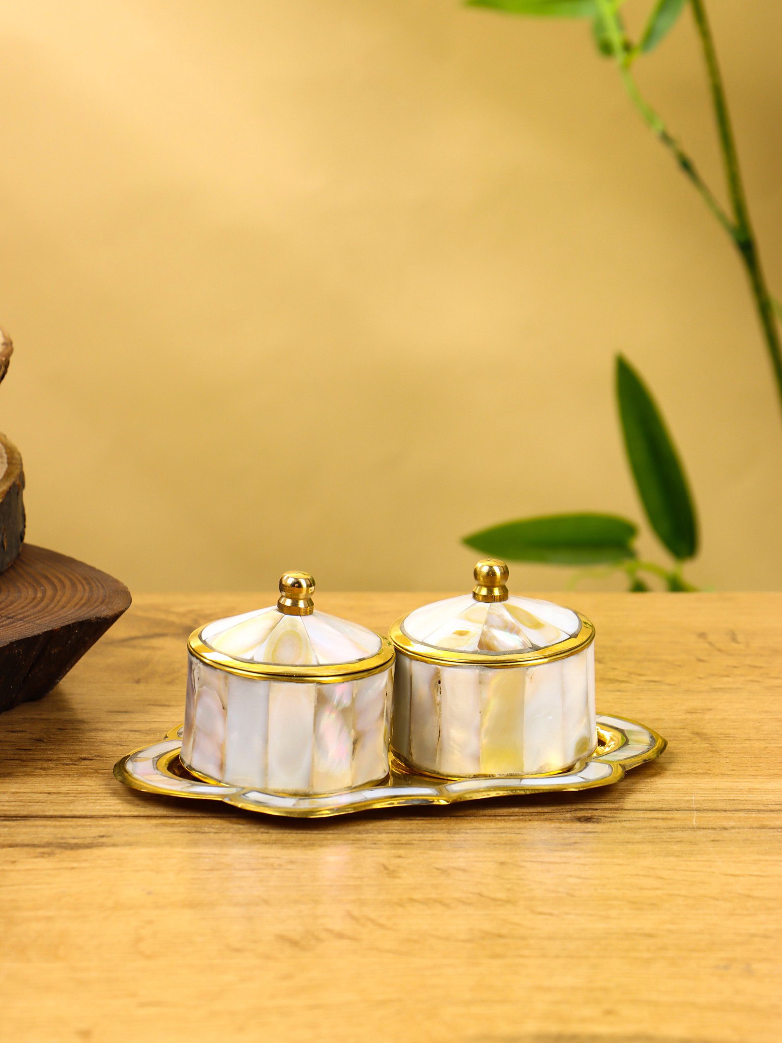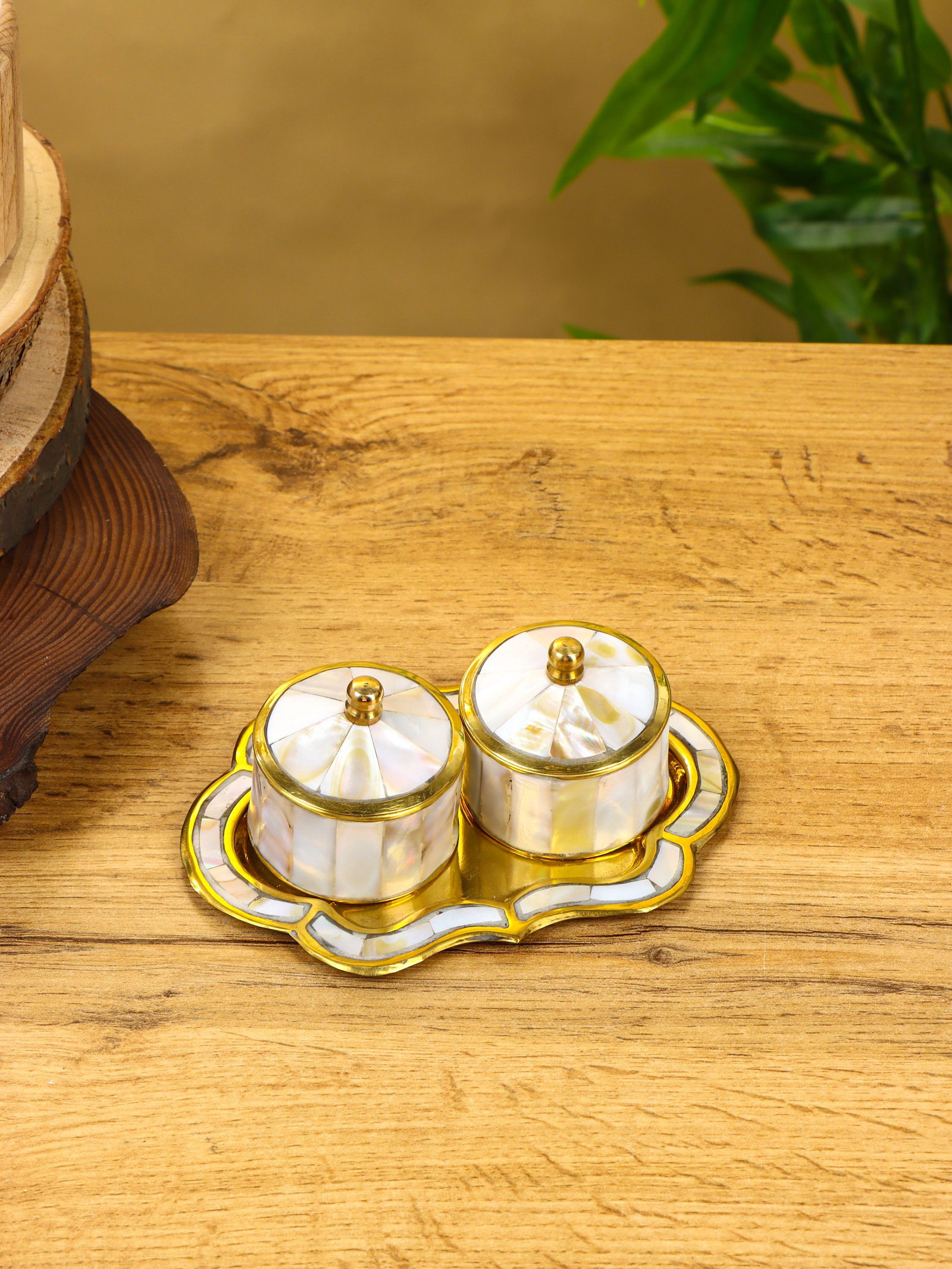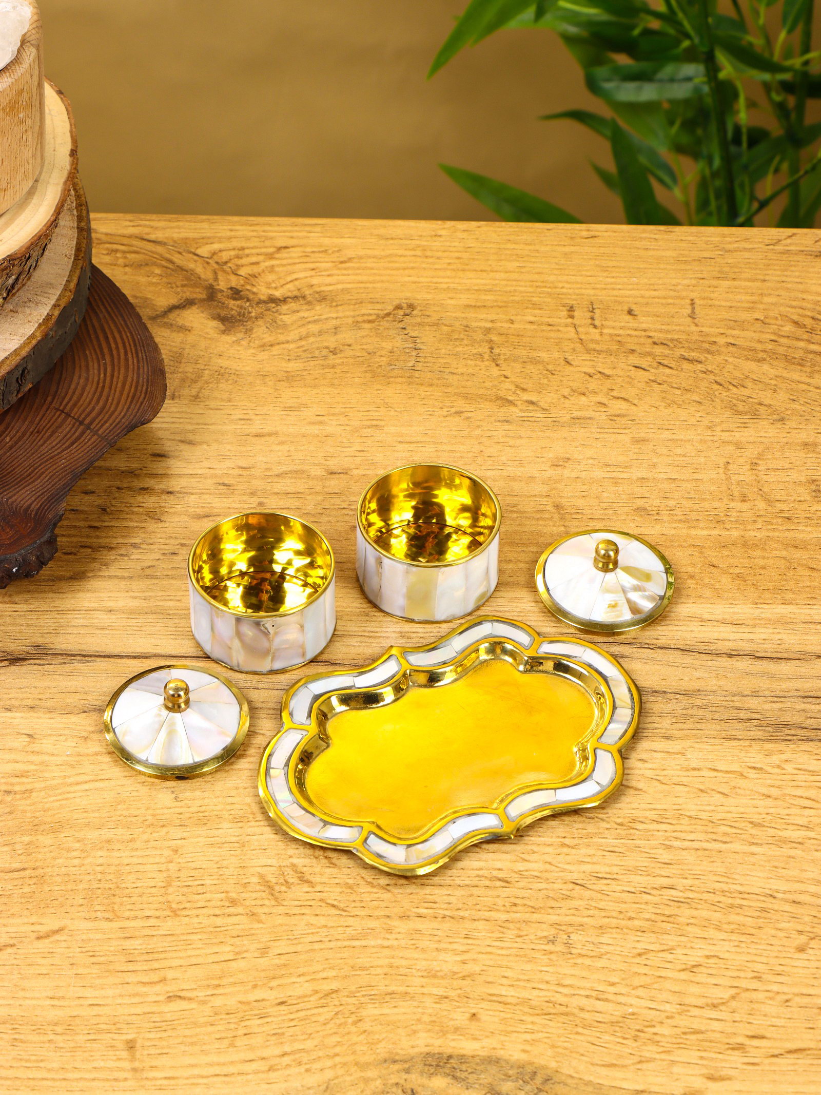 Набор шкатулок на тарелочке "Сокровища Агры", 9x13x5 см, латунь с перламутром, 13x8x5 см., Индия