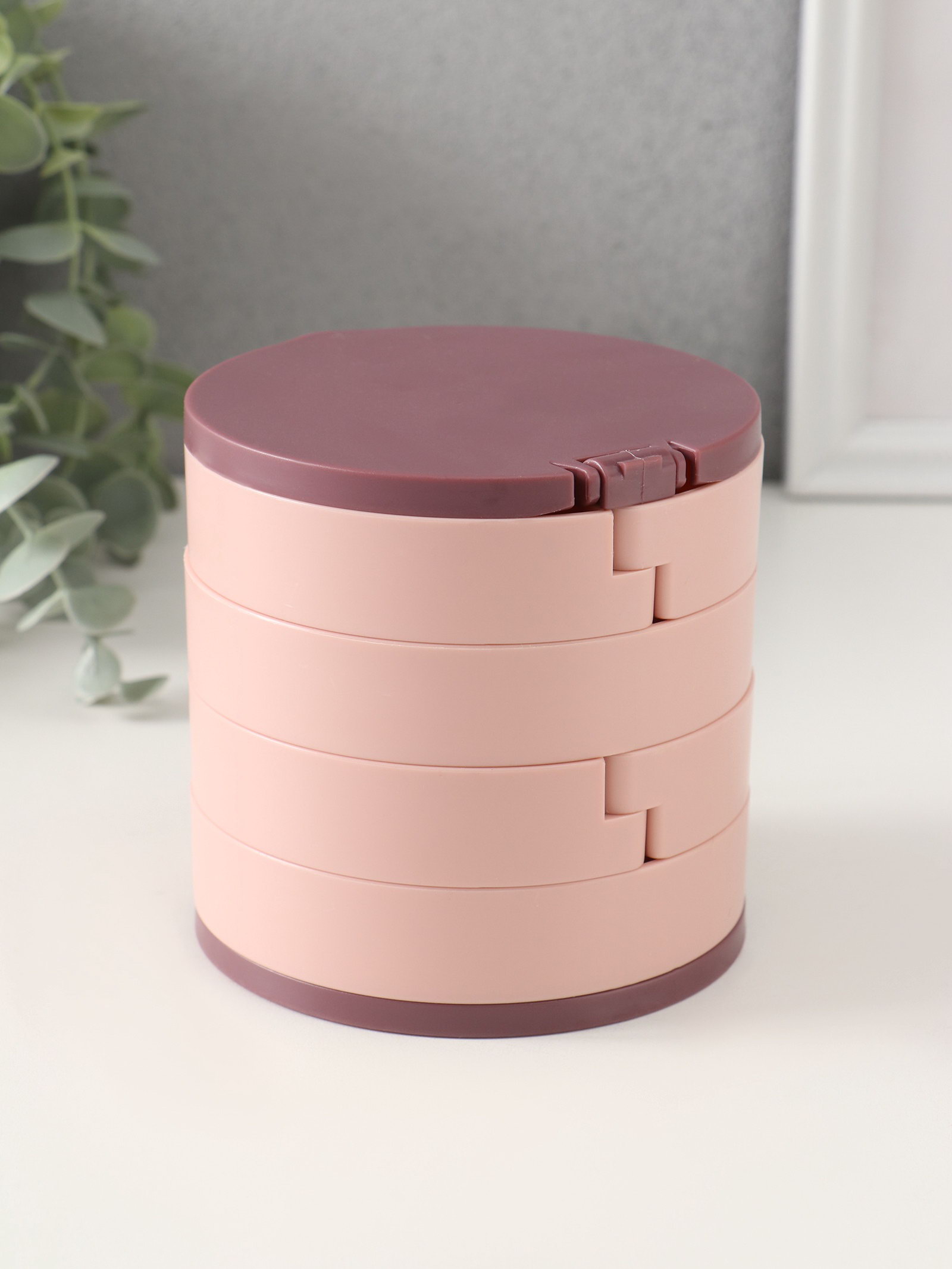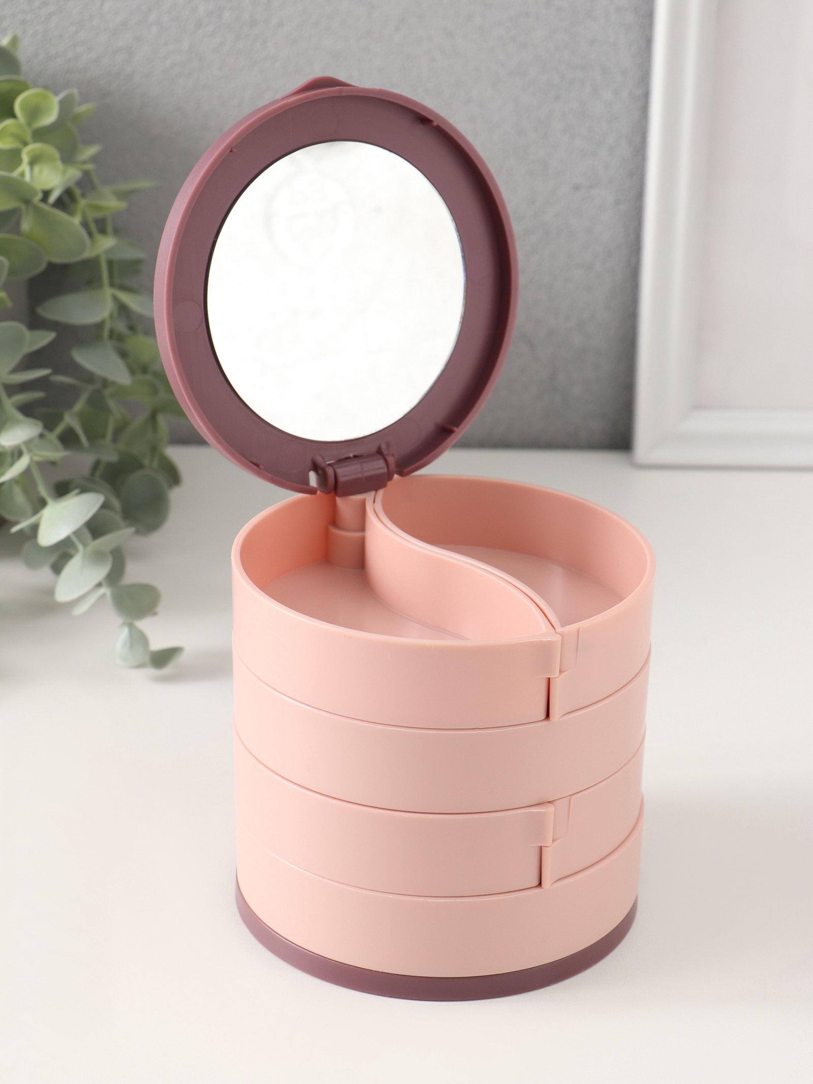 Шкатулка-органайзер для хранения украшений "Круглая. 4 уровня", пластик, зеркало, розовая, 10x10x10 см, 10x10x10 см., Китай
