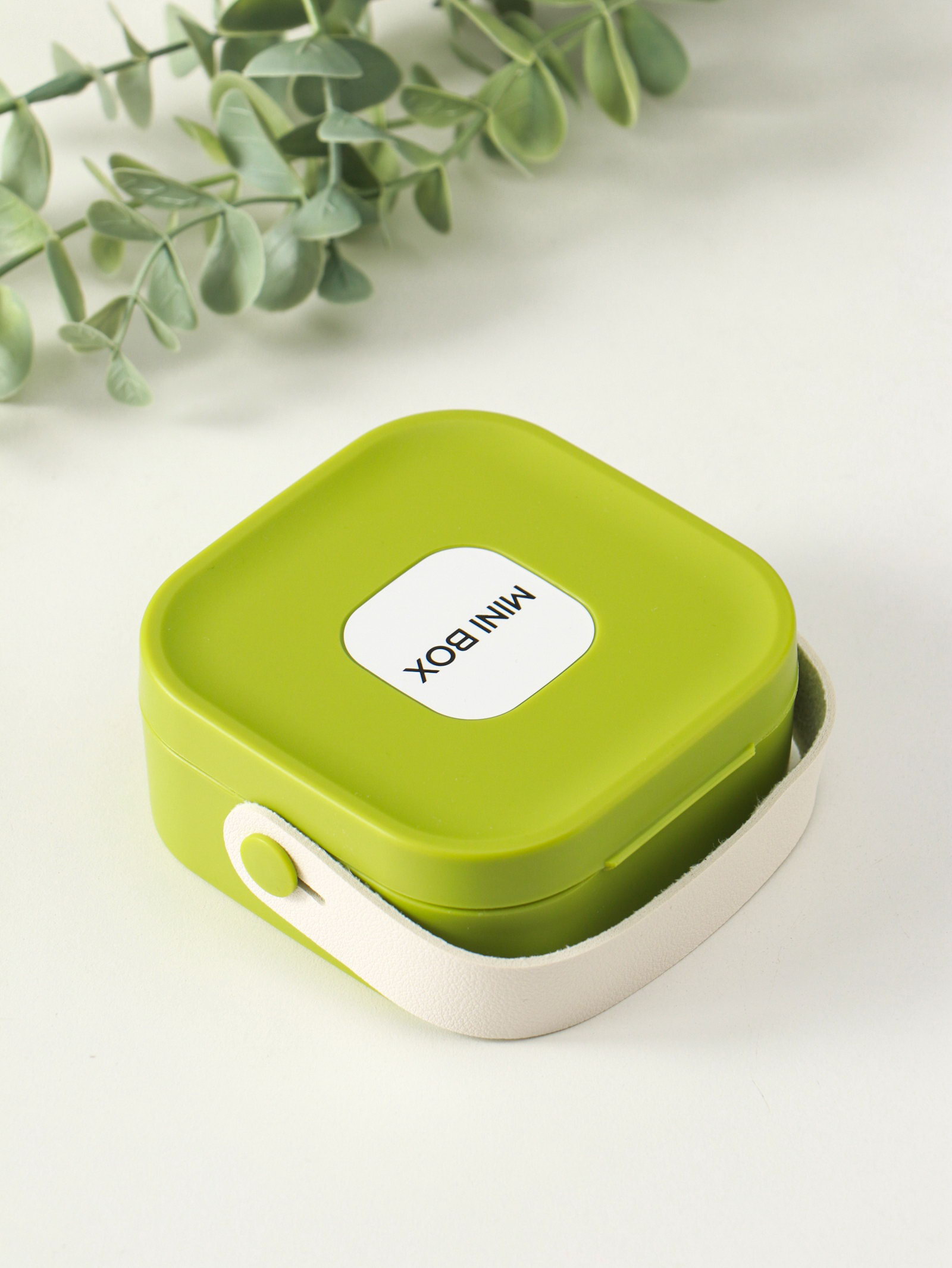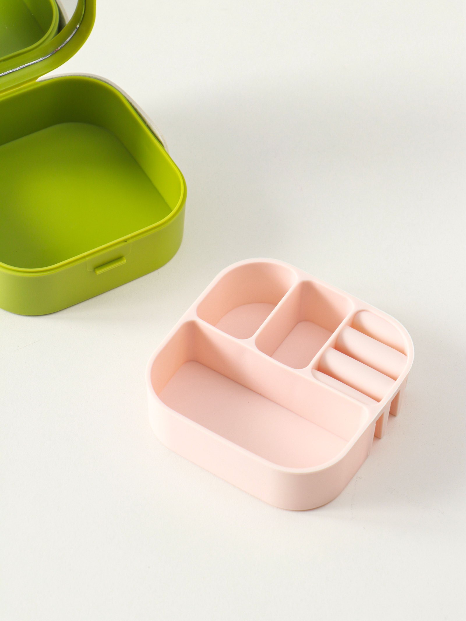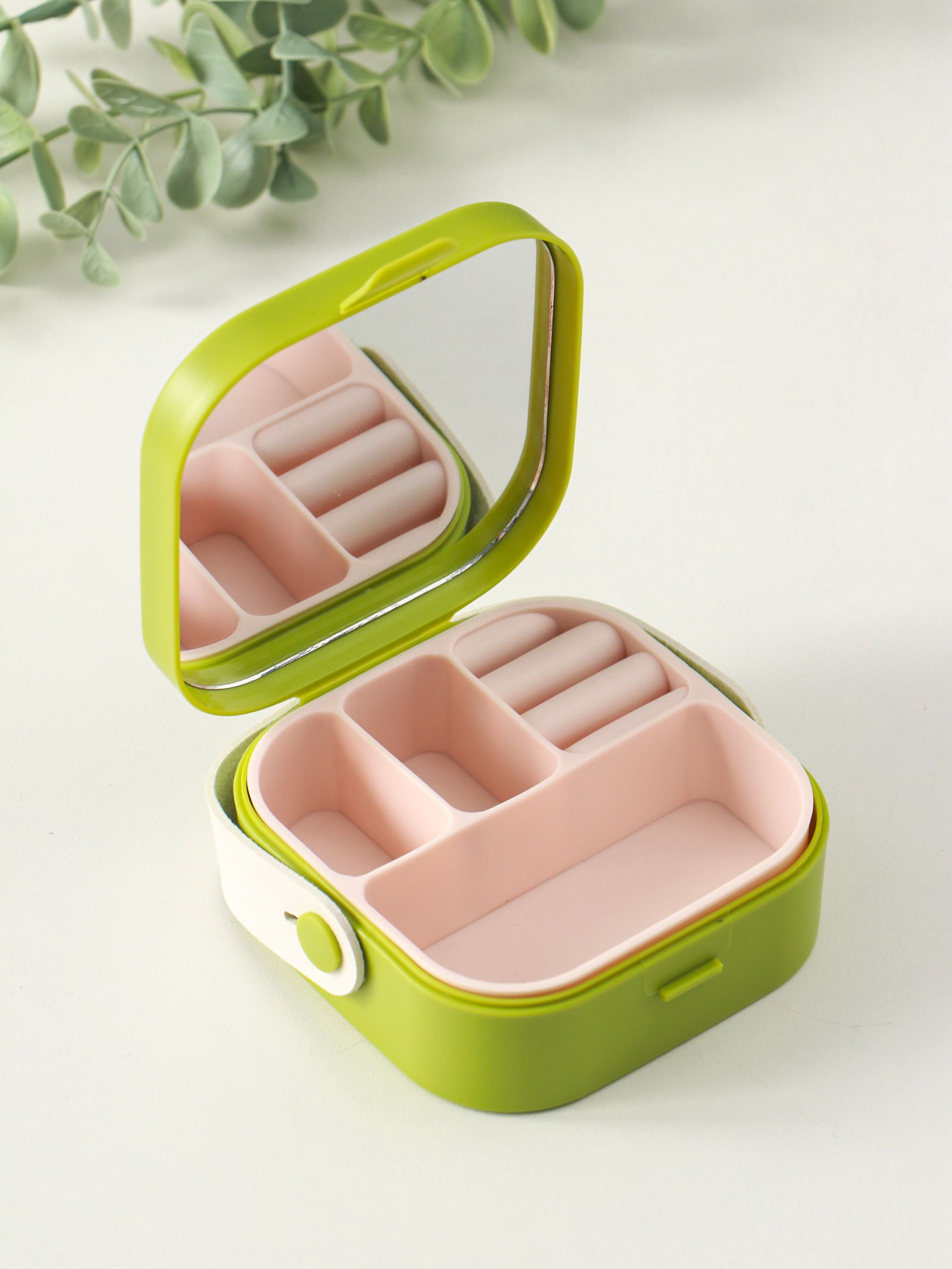 Шкатулка для украшений с зеркалом, с ручкой 3 ячейки, 3 полосы, зелёный, пластик, 9x9x3.8 см, 9x9x3.8 см., Китай