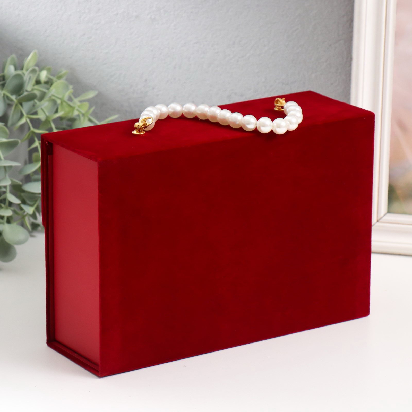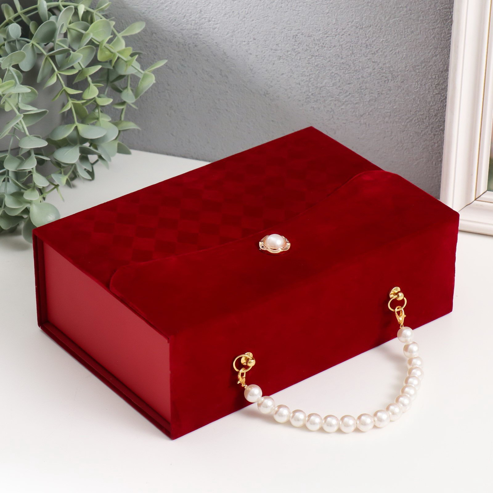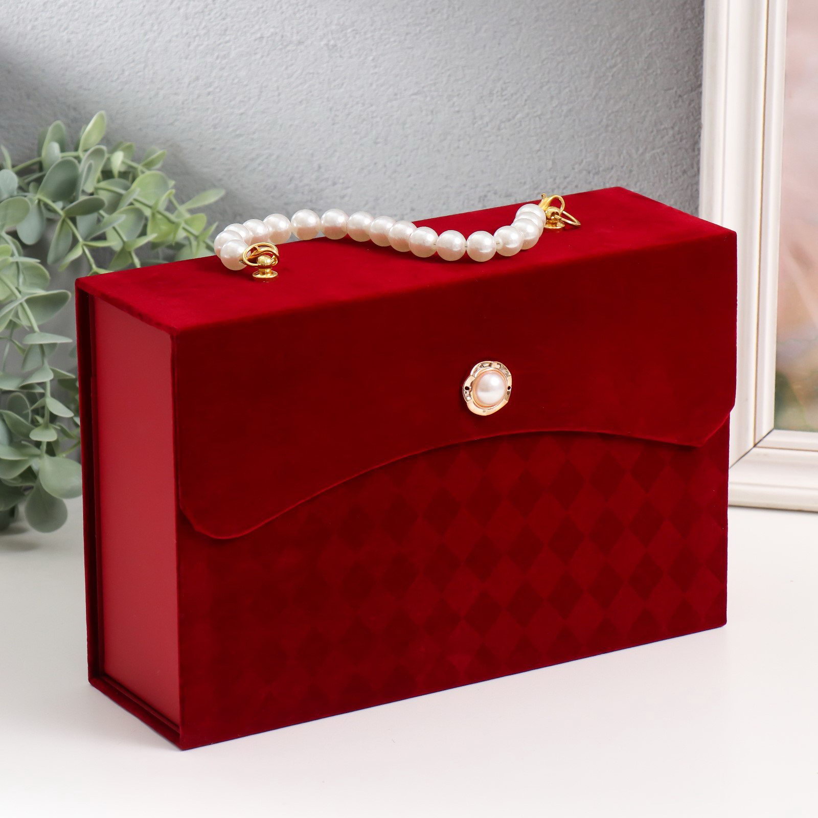 Шкатулка для украшений "Ромбы. Бордо", ручка из жемчужин, картон под бархат, 8x24x16.5 см, 24x8x15.5 см., Китай