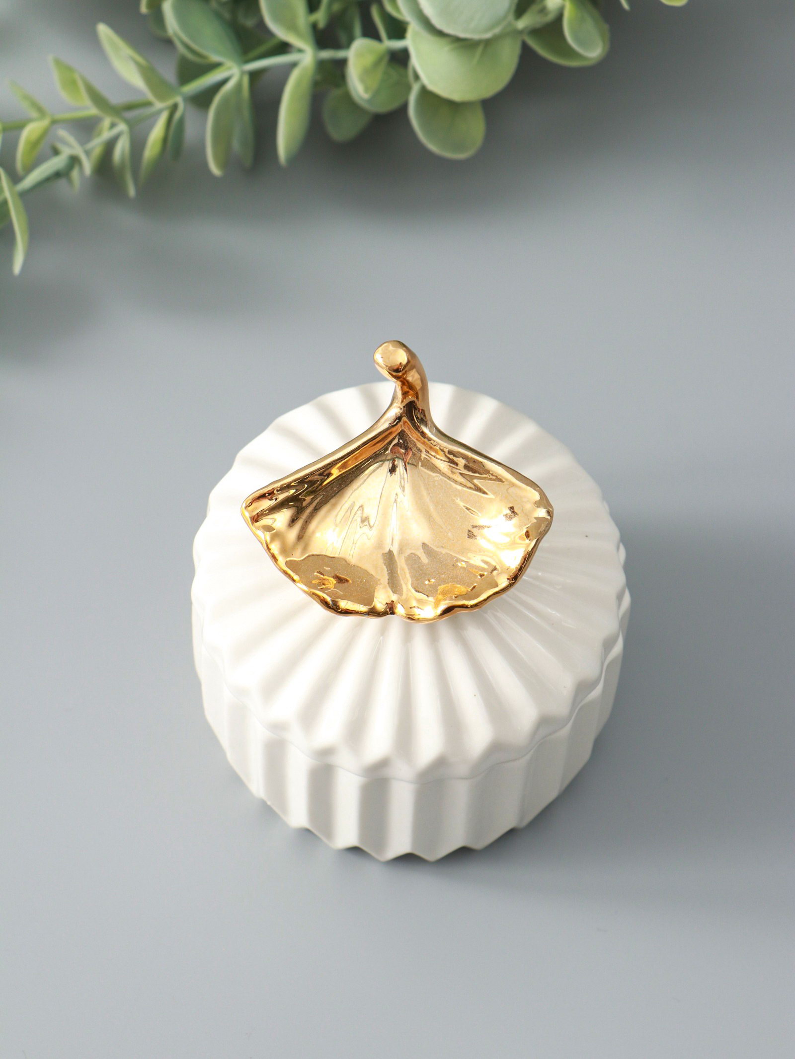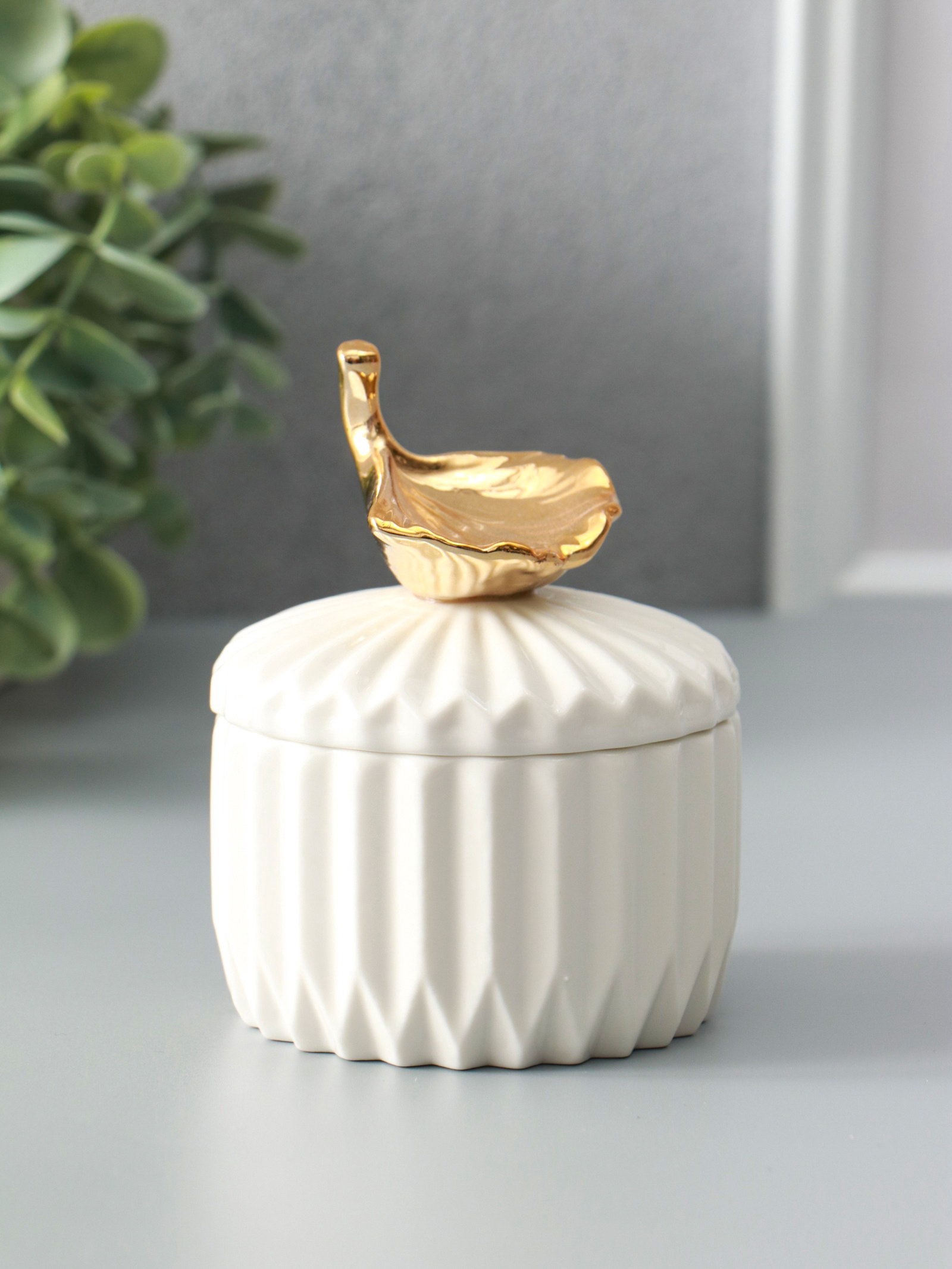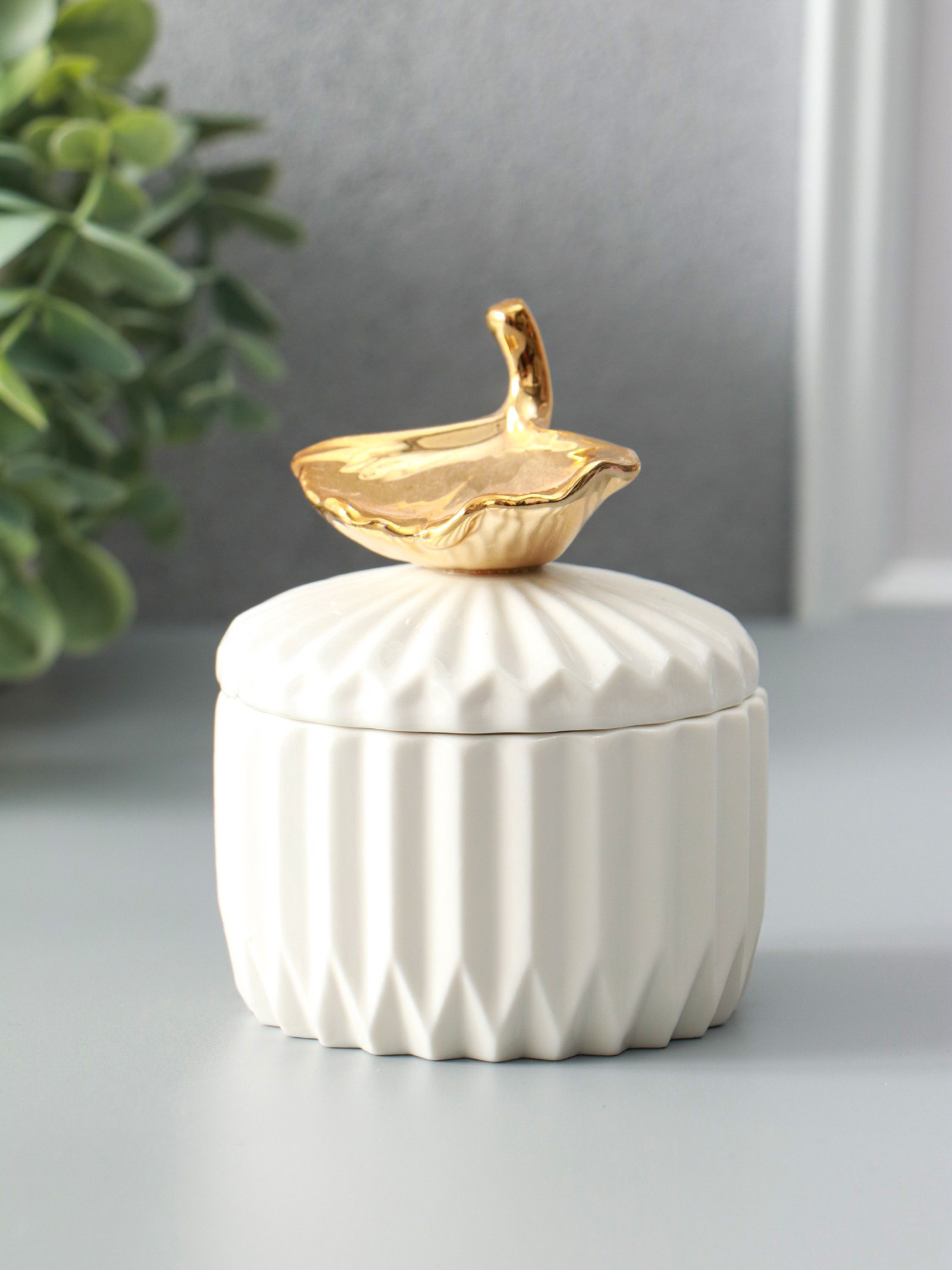 Шкатулка для украшений с крышкой "Золотой лист Гинкго", керамика, белая, 8x8x10 см, 8x8x10 см., Китай