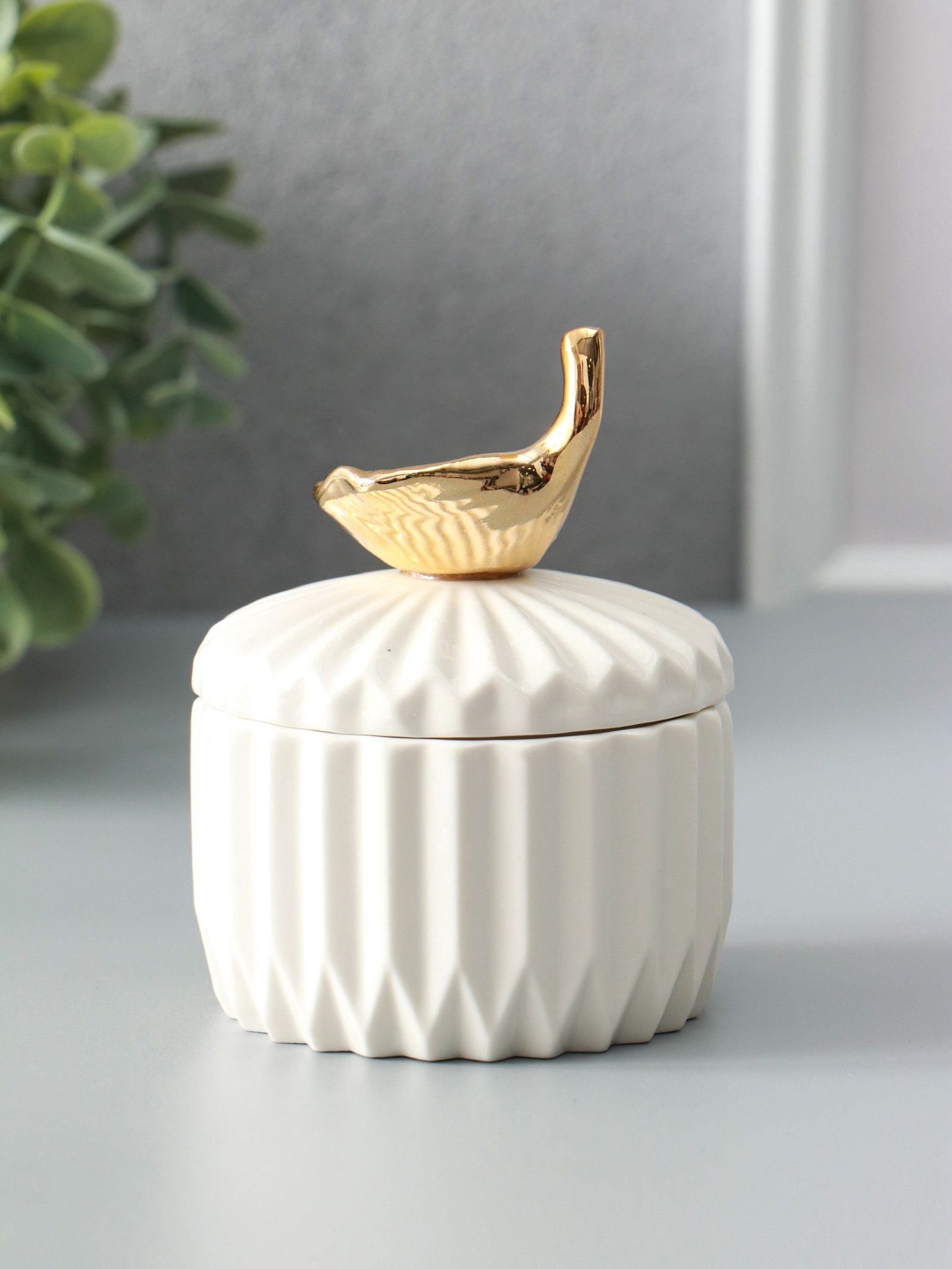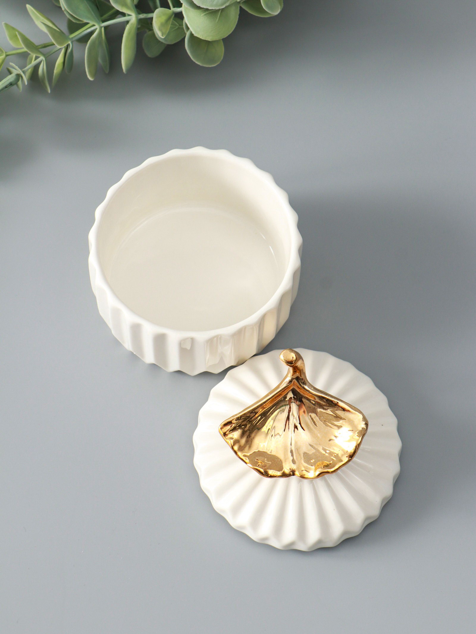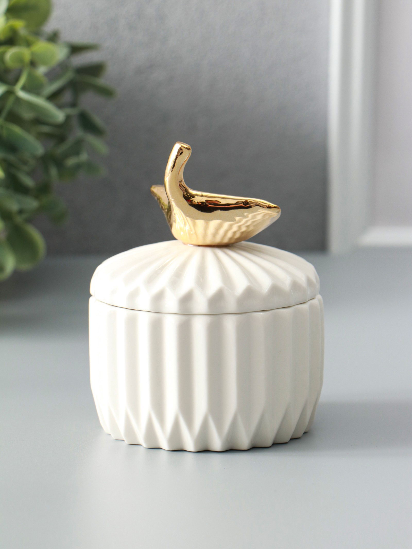 Шкатулка для украшений с крышкой "Золотой лист Гинкго", керамика, белая, 8x8x10 см, 8x8x10 см., Китай