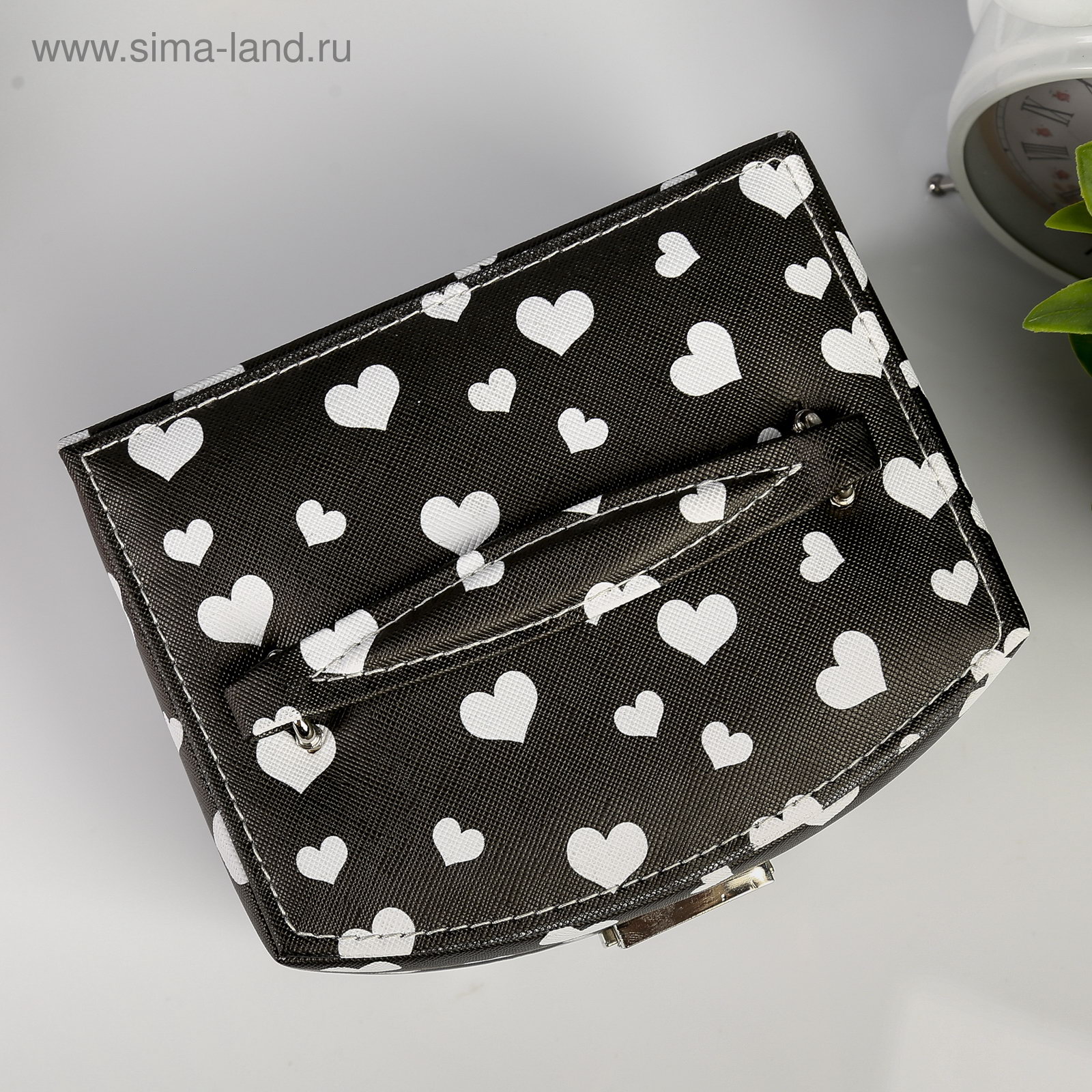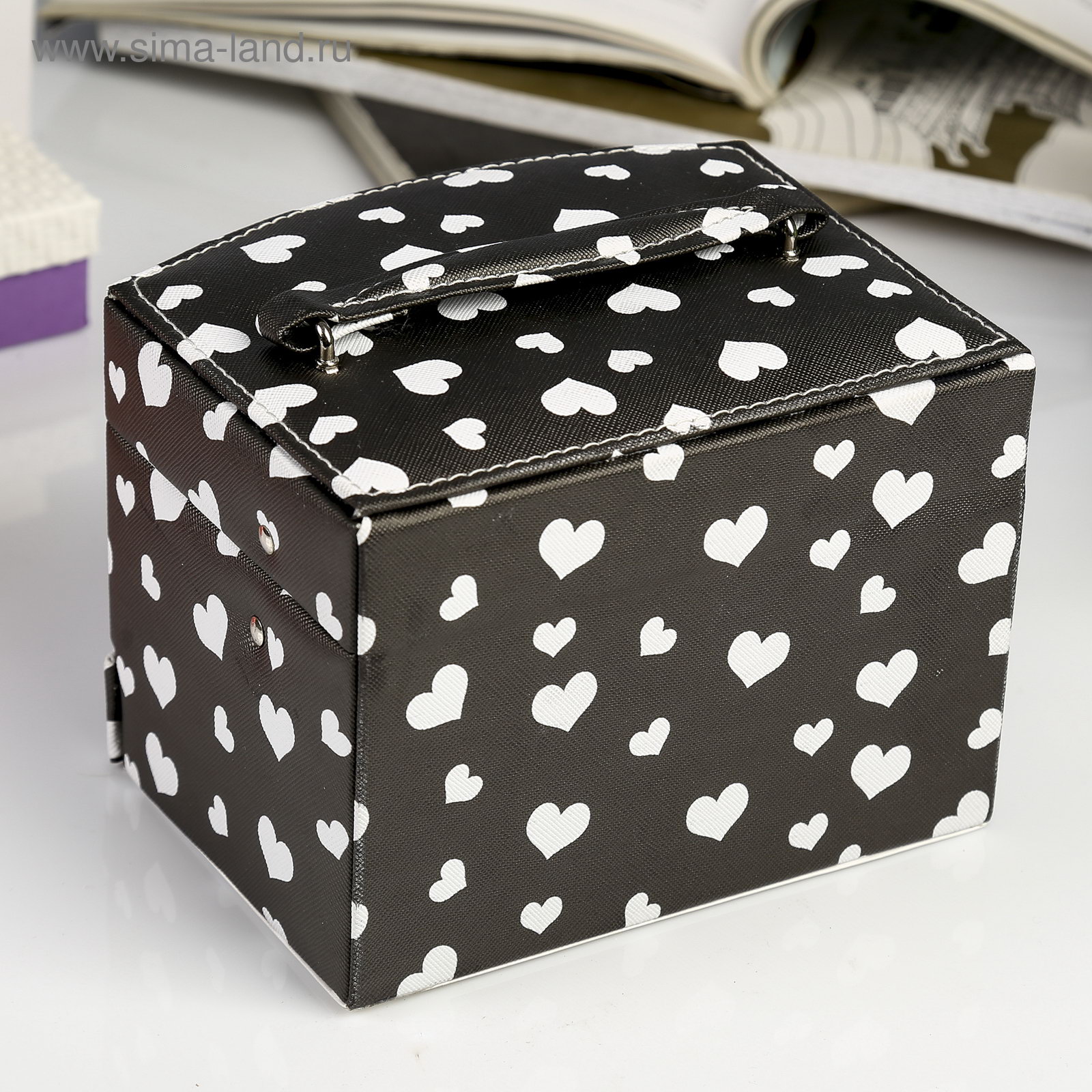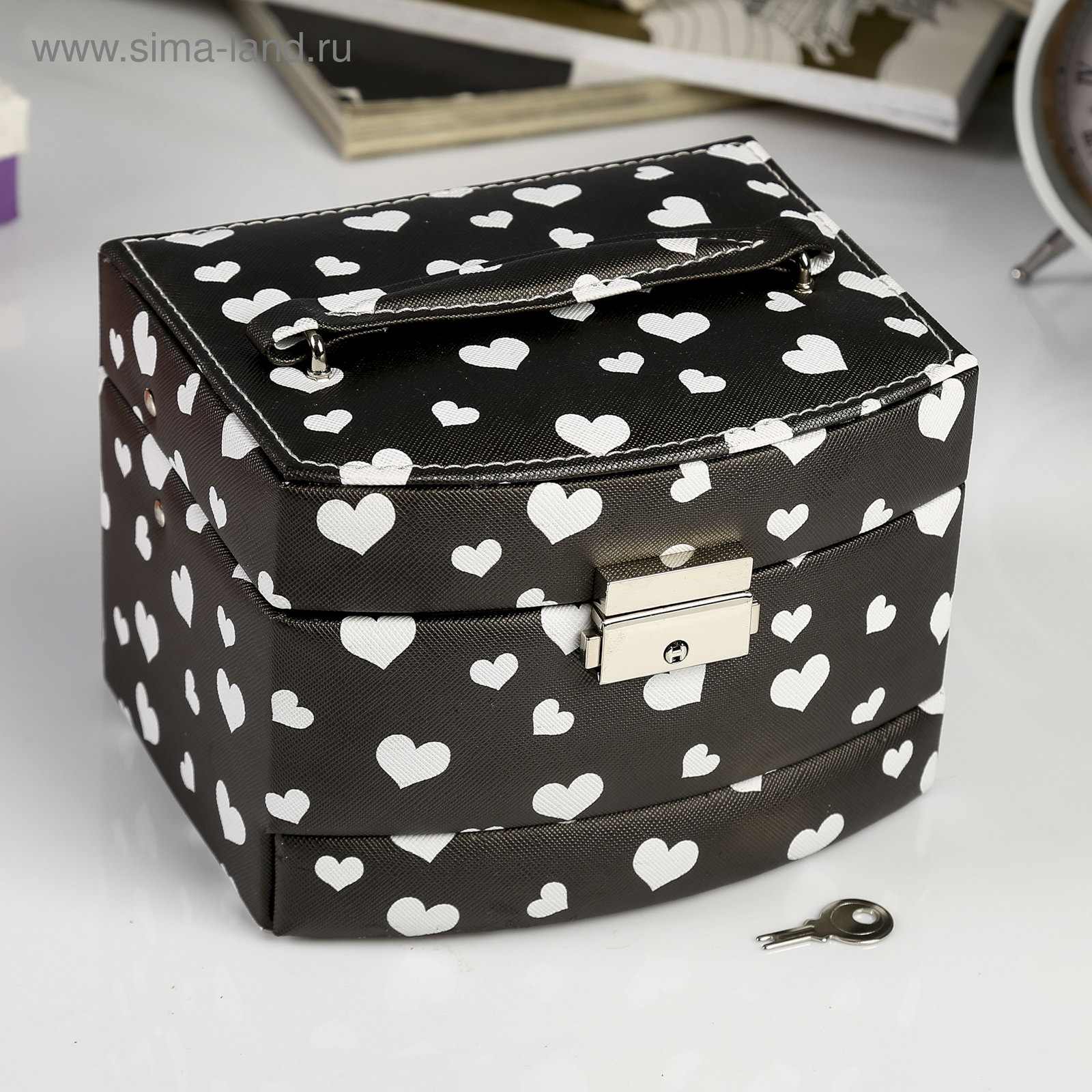 Шкатулка для украшений "Сердечки на чёрном", кожзам, с замком и ключом, 11x16x13 см, 13x16x11 см., Китай