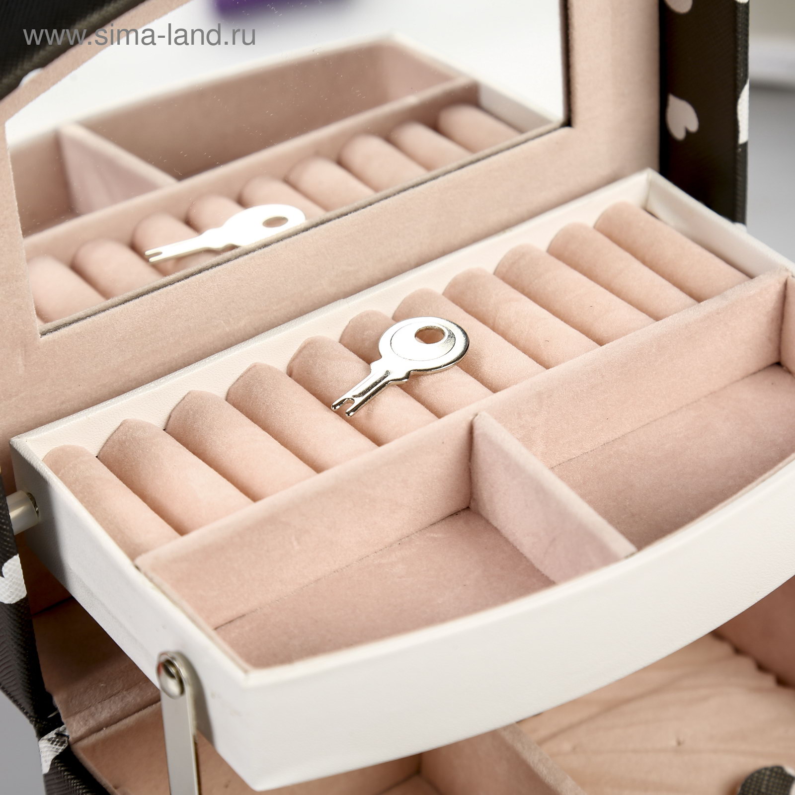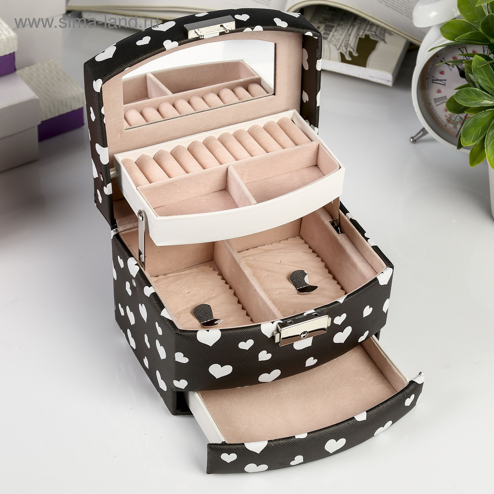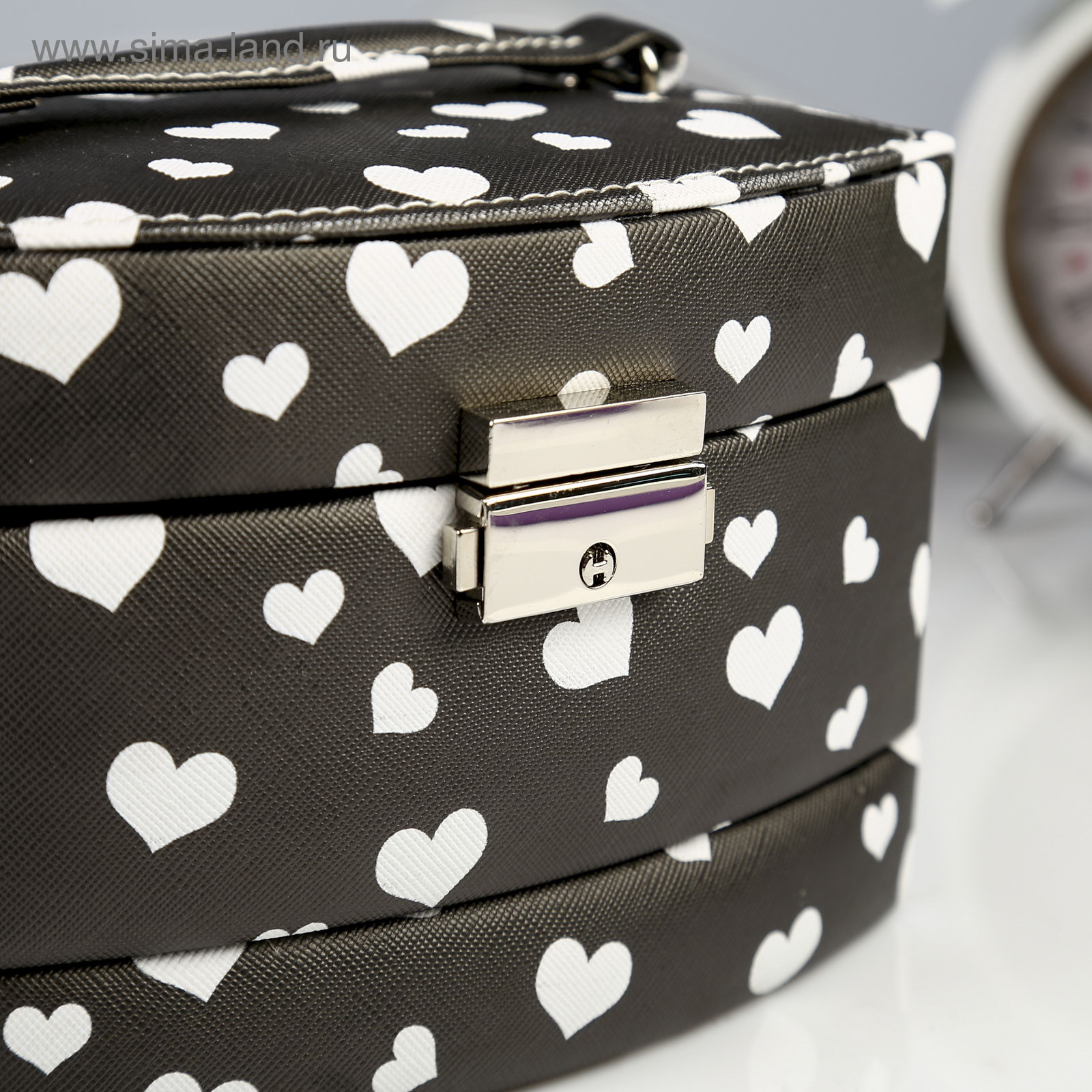 Шкатулка для украшений "Сердечки на чёрном", кожзам, с замком и ключом, 11x16x13 см, 13x16x11 см., Китай