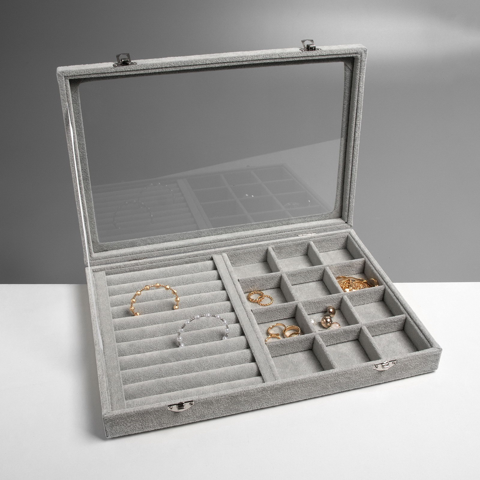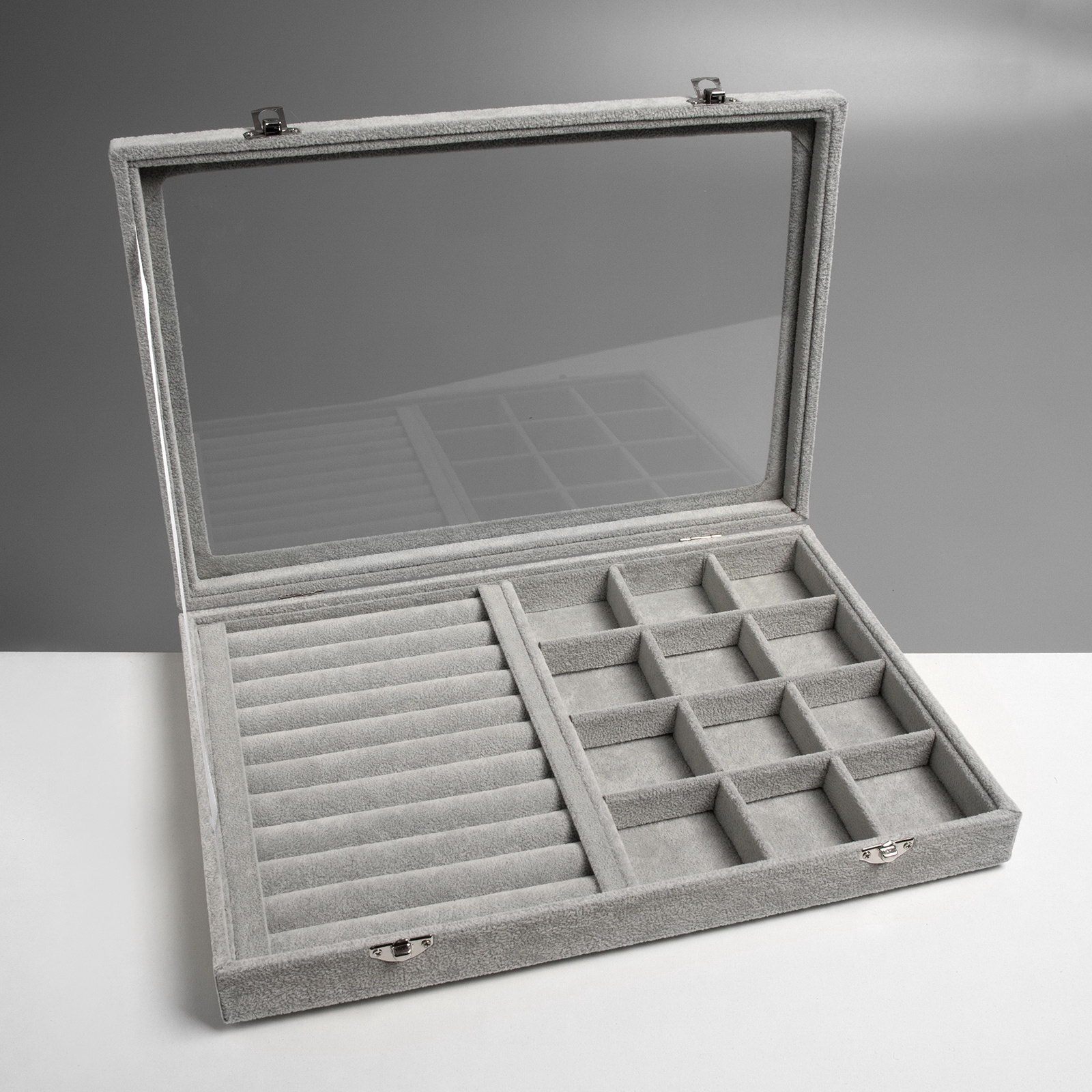 Шкатулка для украшений 9 полос, 12 ячеек, 35x24x4.5, стеклянная крышка, серая, 24x35x4.5 см., QF, Китай