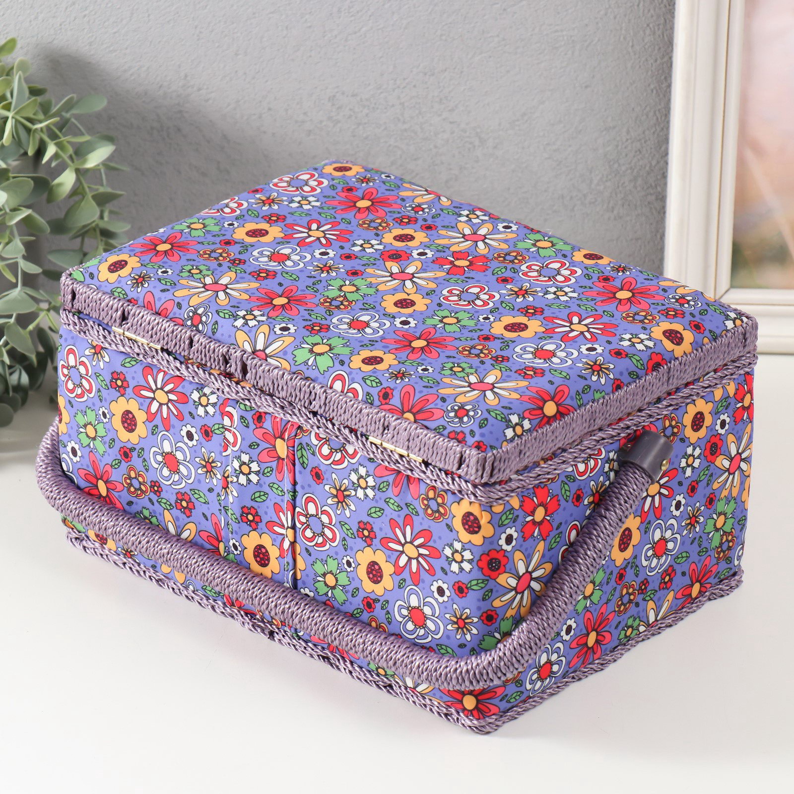 Шкатулка для рукоделия и шитья "Нарисованные цветы на синем", хранение ниток, иголок, мелочи, 19х26х14.5 см, 26x19x14.5 см., Китай