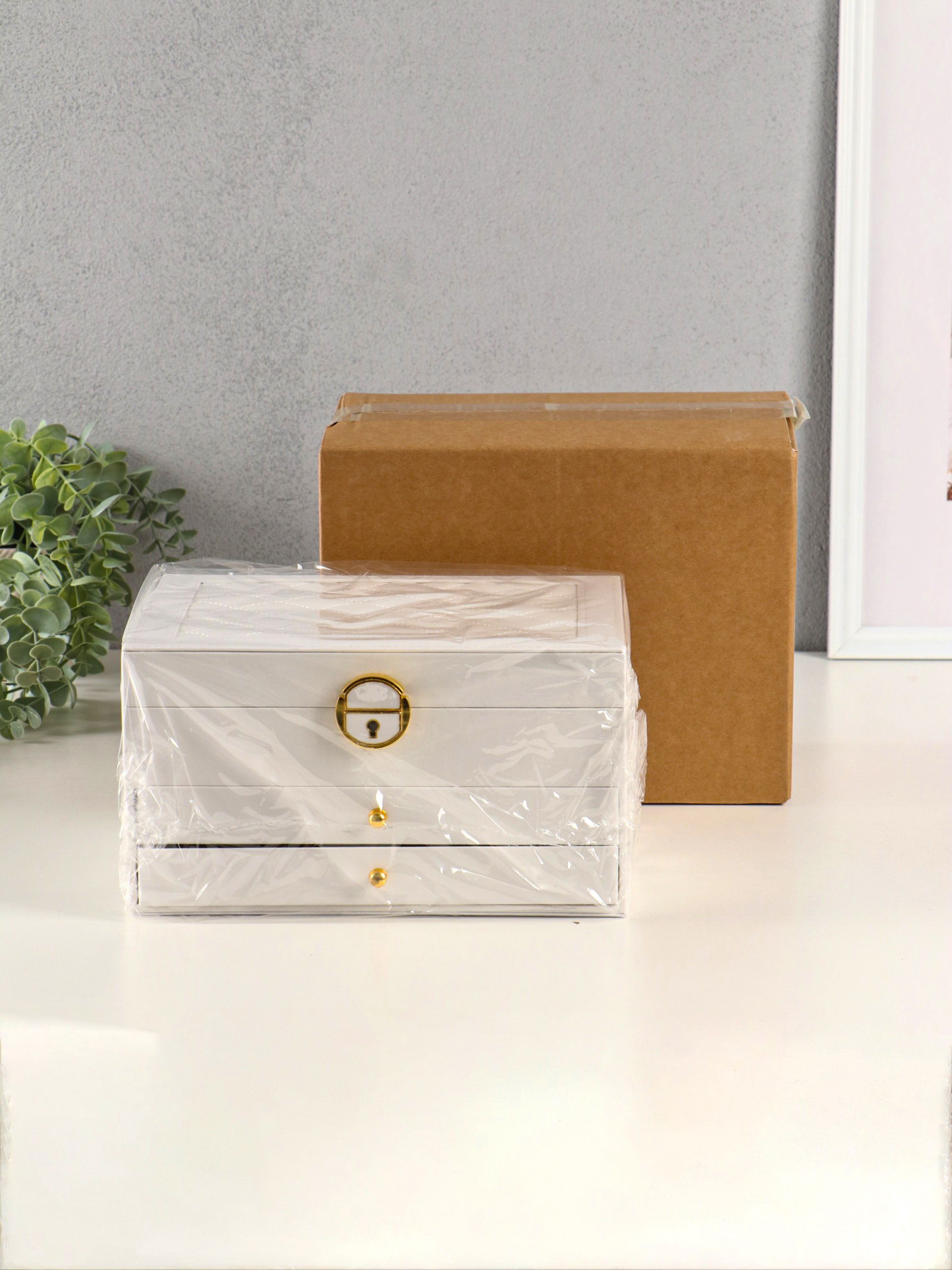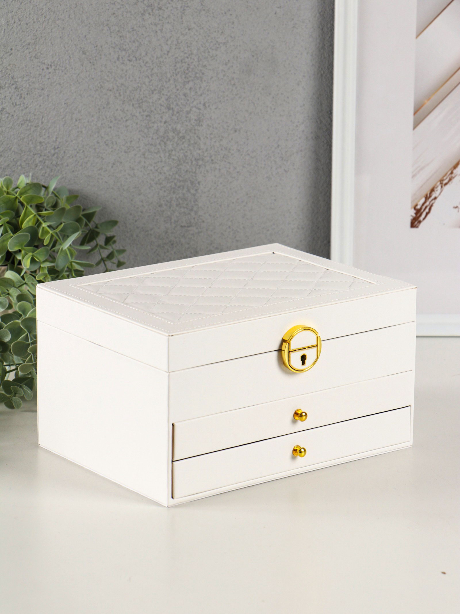 Тематика: Однотонная, Текстура Особенности шкатулки: Для украшений, С делениями, С замочком Тематика праздника: 8 Марта, Универсальная тематика Размер упаковки: 19 x 24 x 14 см. tnved: 4202930000 Цвет: Белый Ширина, см: 17.5 Высота, см: 13.5 Длина, см: 23 Покрытие: Искусственная кожа Форма: Прямоугольная Эта белая шкатулка на три яруса личное пространство для вашей коллекции украшений. Она создаёт идеальный порядок, где каждая вещь занимает своё место, защищая драгоценности от пыли и спутывания. Особенности