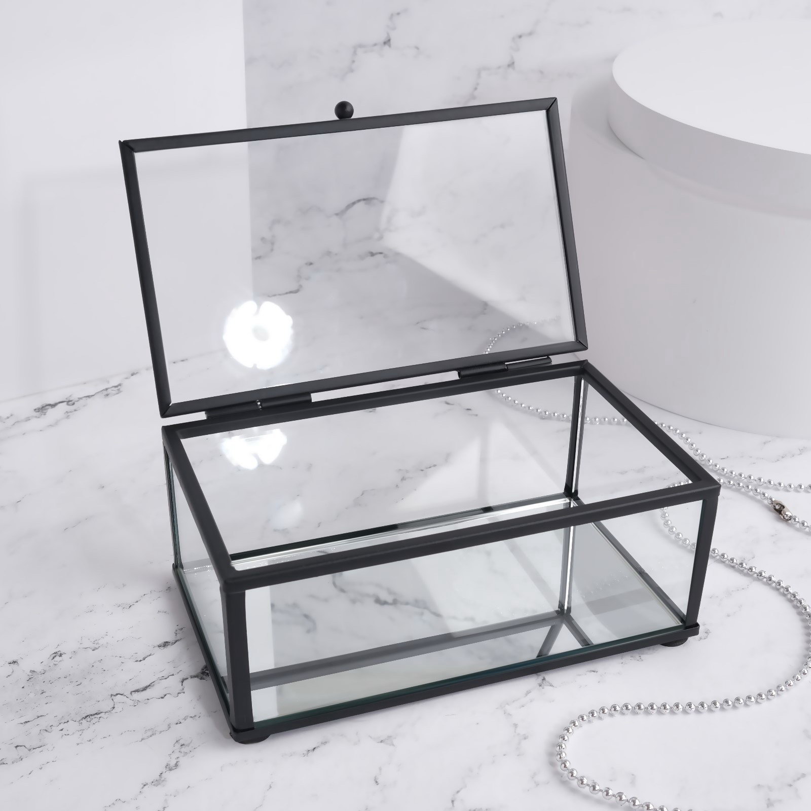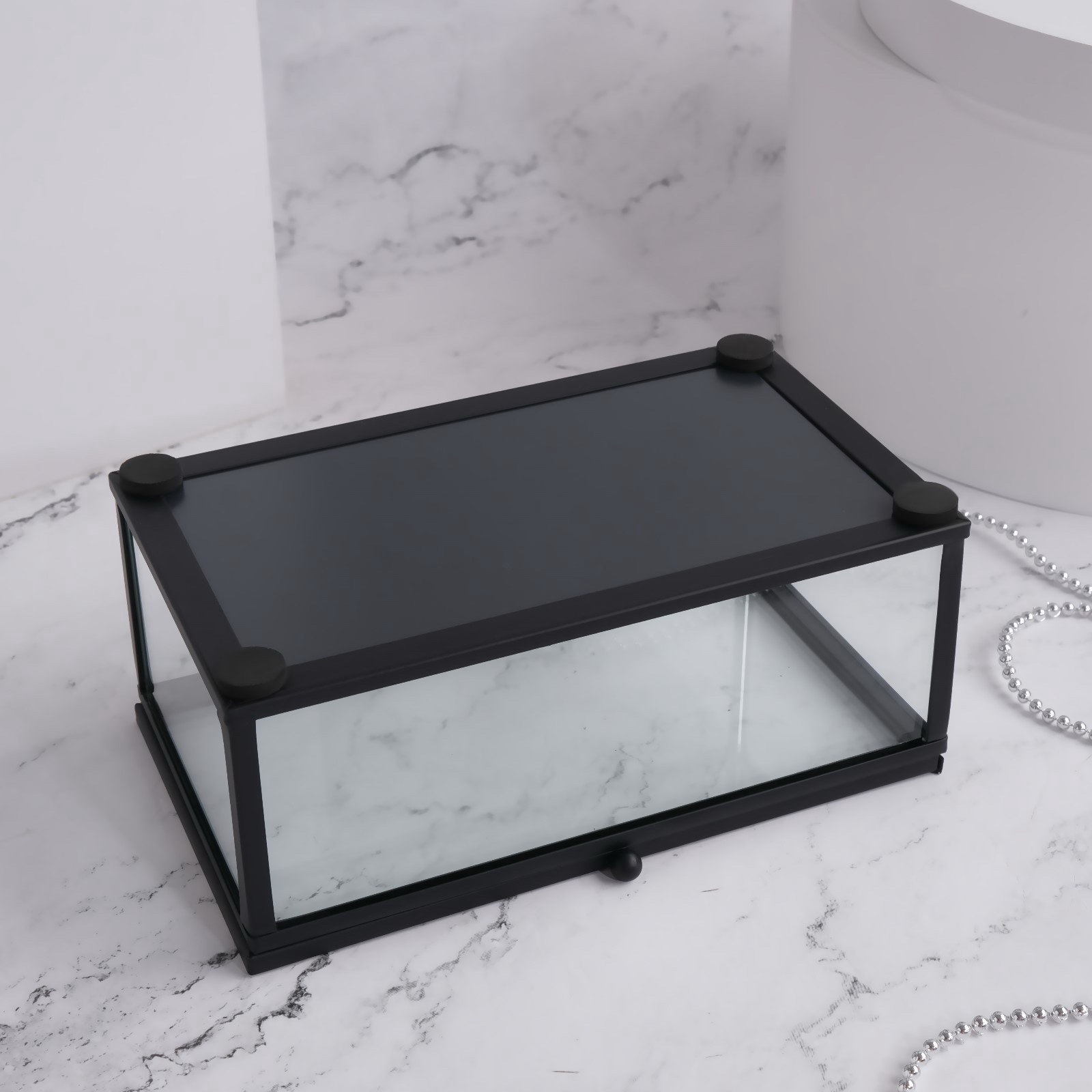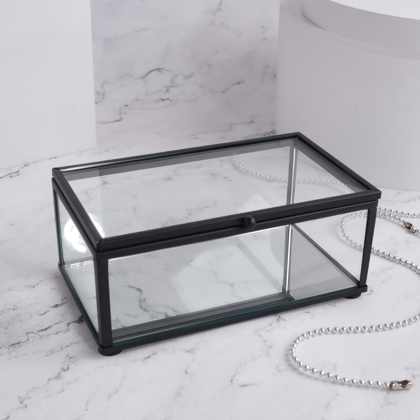 Стеклянная шкатулка для украшений с крышкой, зеркальным основанием, 14.5x8.5 см, прозрачная, чёрный каркас, 8.5x14.5x6 см., QF, Китай