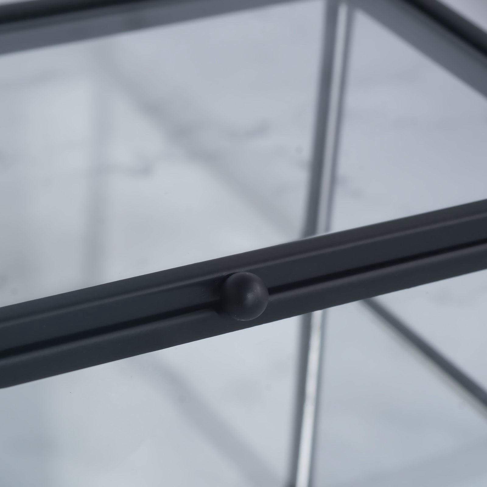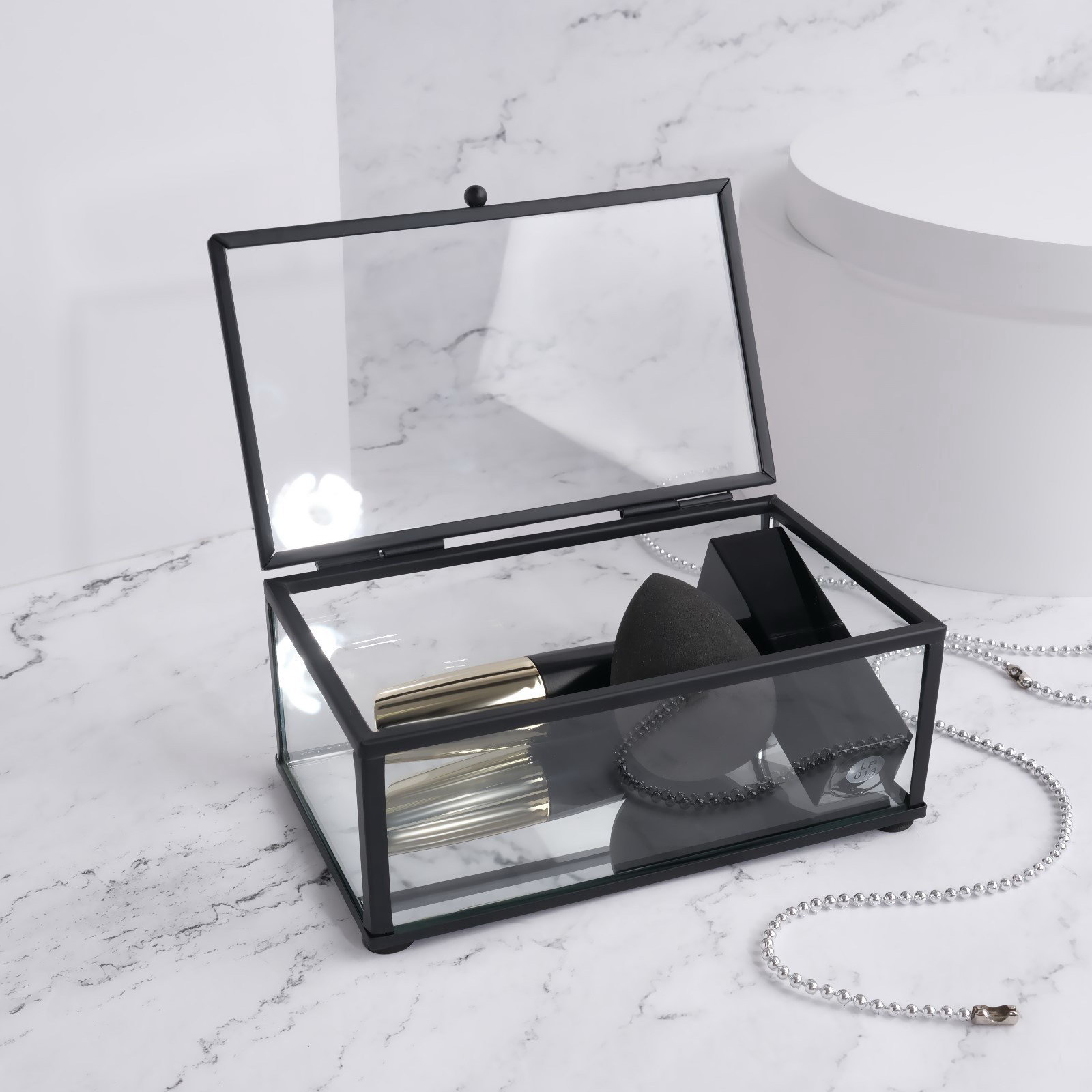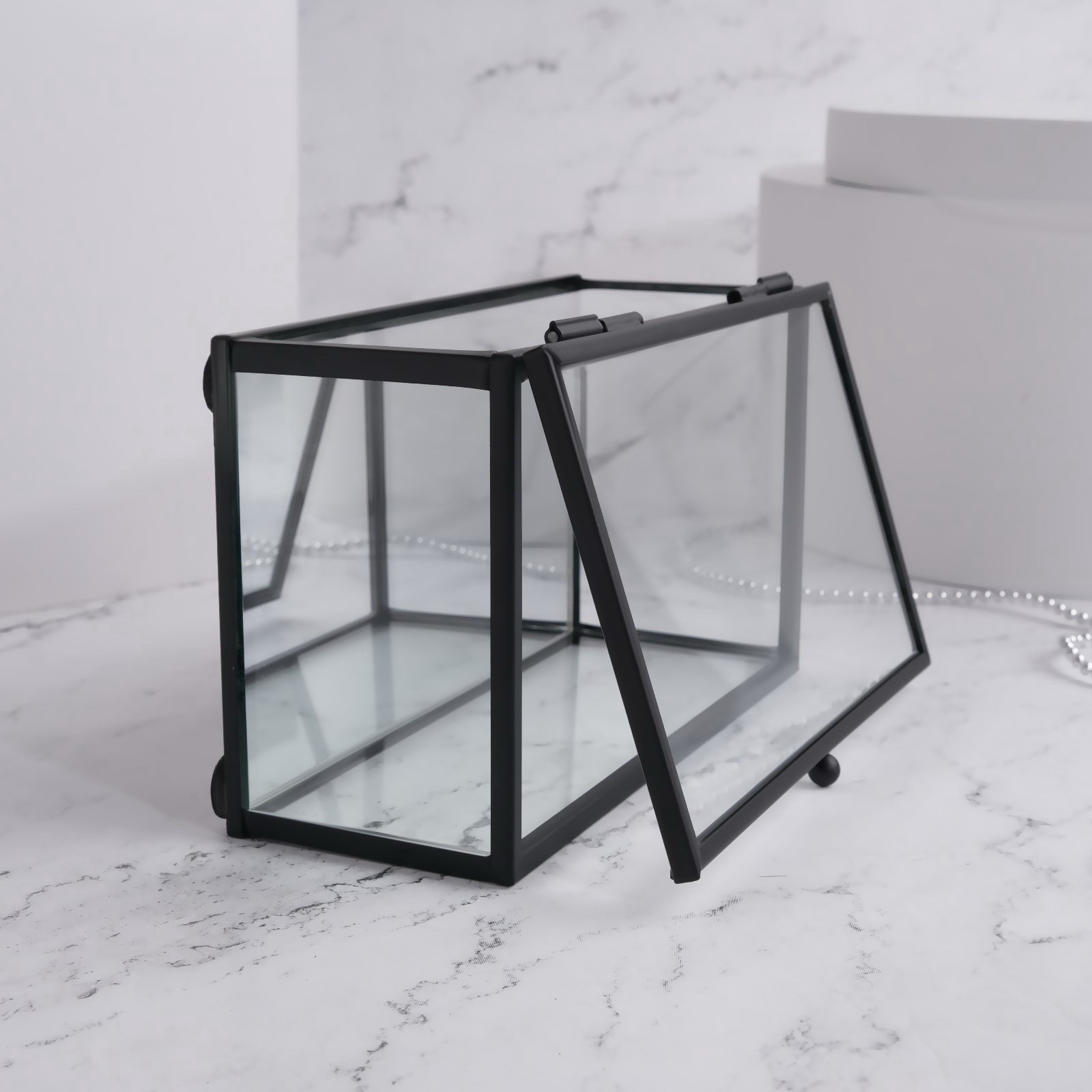 Стеклянная шкатулка для украшений с крышкой, зеркальным основанием, 14.5x8.5 см, прозрачная, чёрный каркас, 8.5x14.5x6 см., QF, Китай