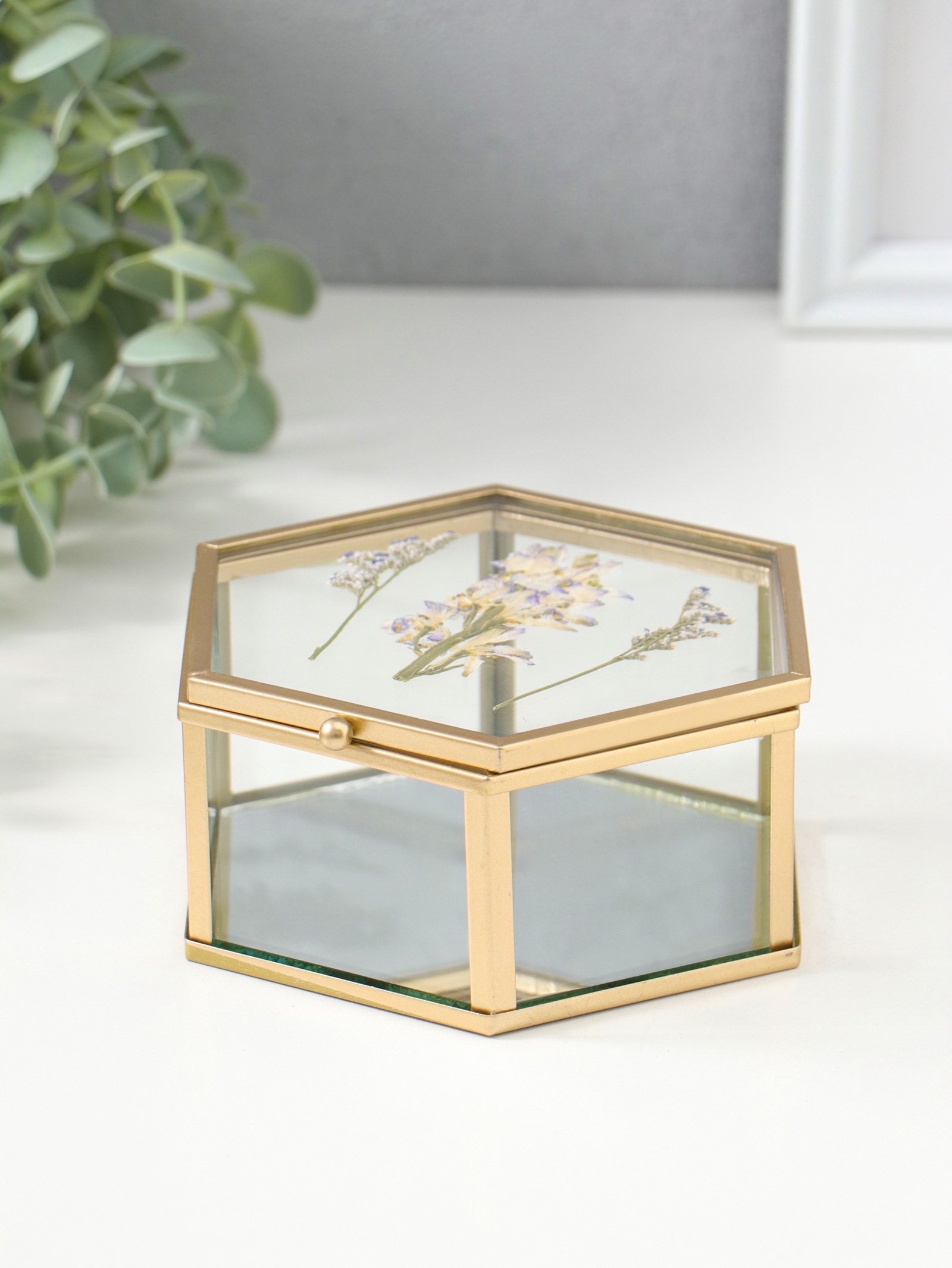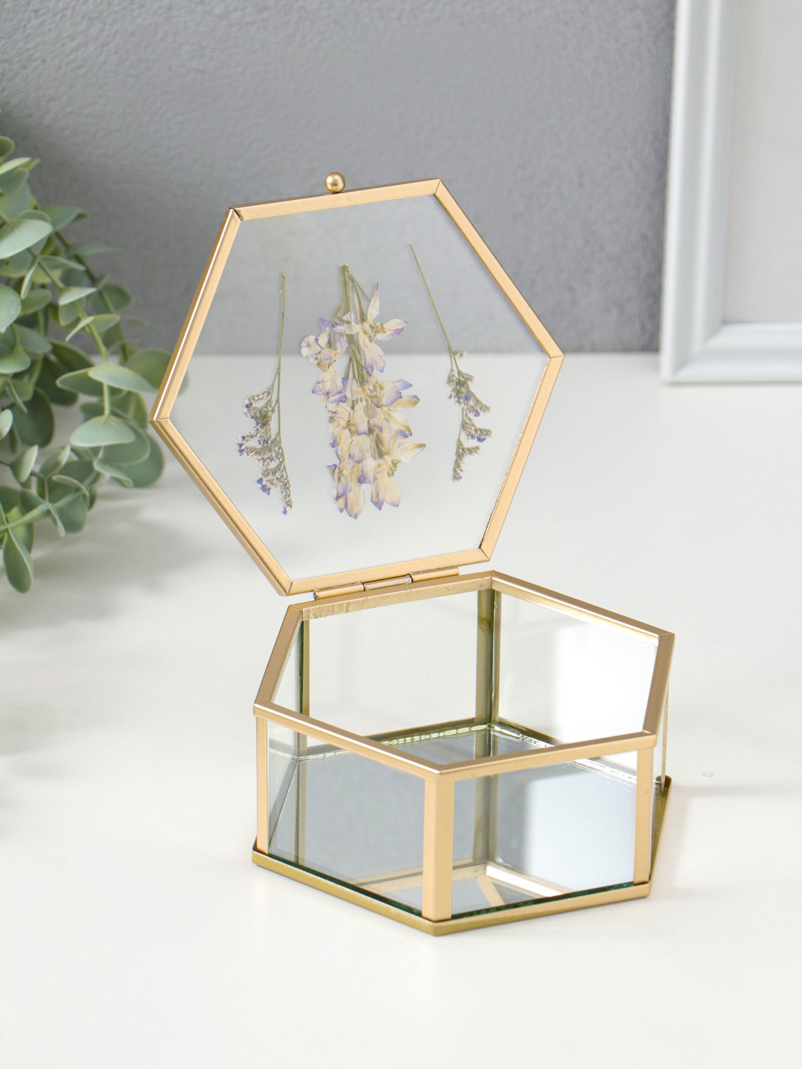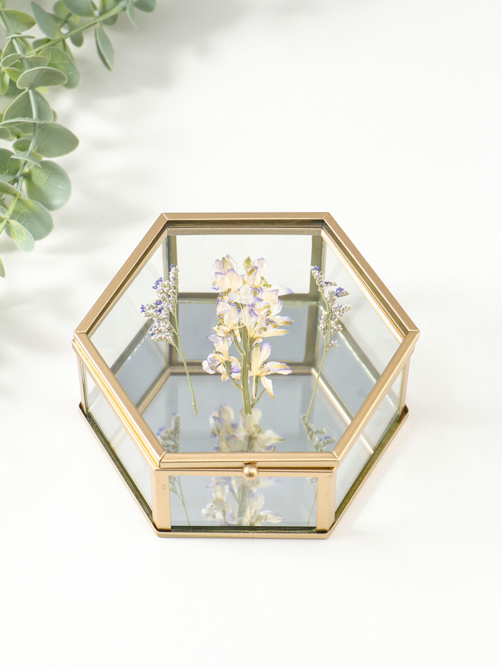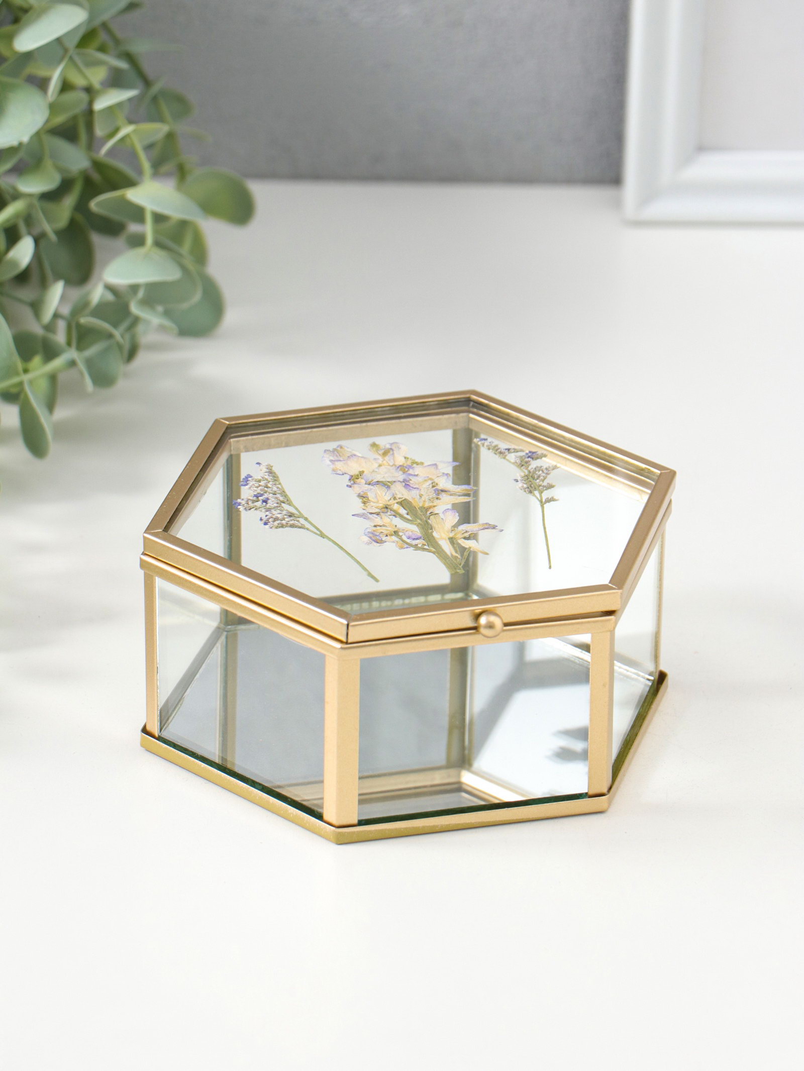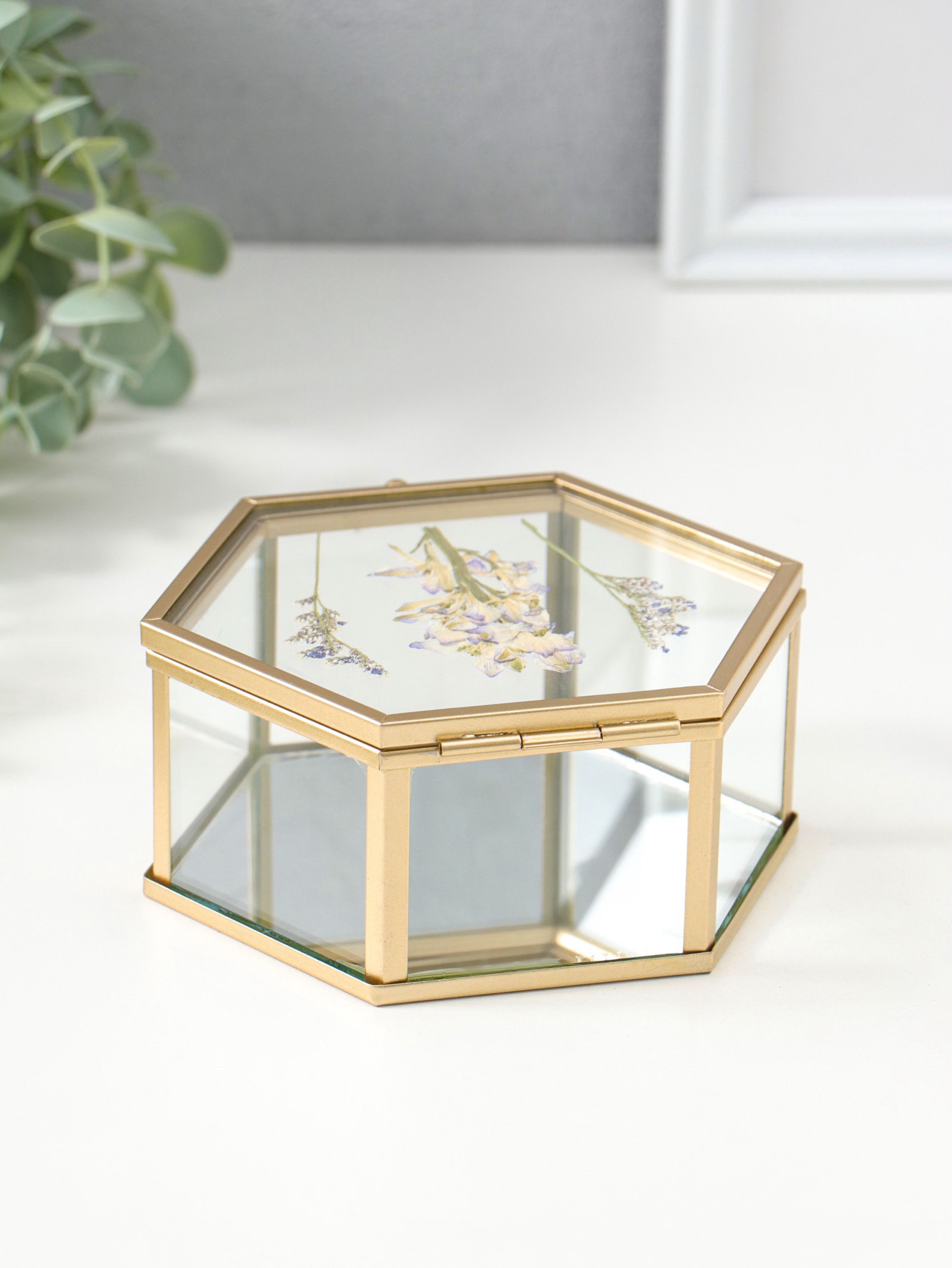 Шкатулка для украшений "Сухоцветы", многогранник, стекло с металлическим каркасом, зеркальное дно, 11.3x13x5.7 см, 13x11.3x5.7 см., Китай