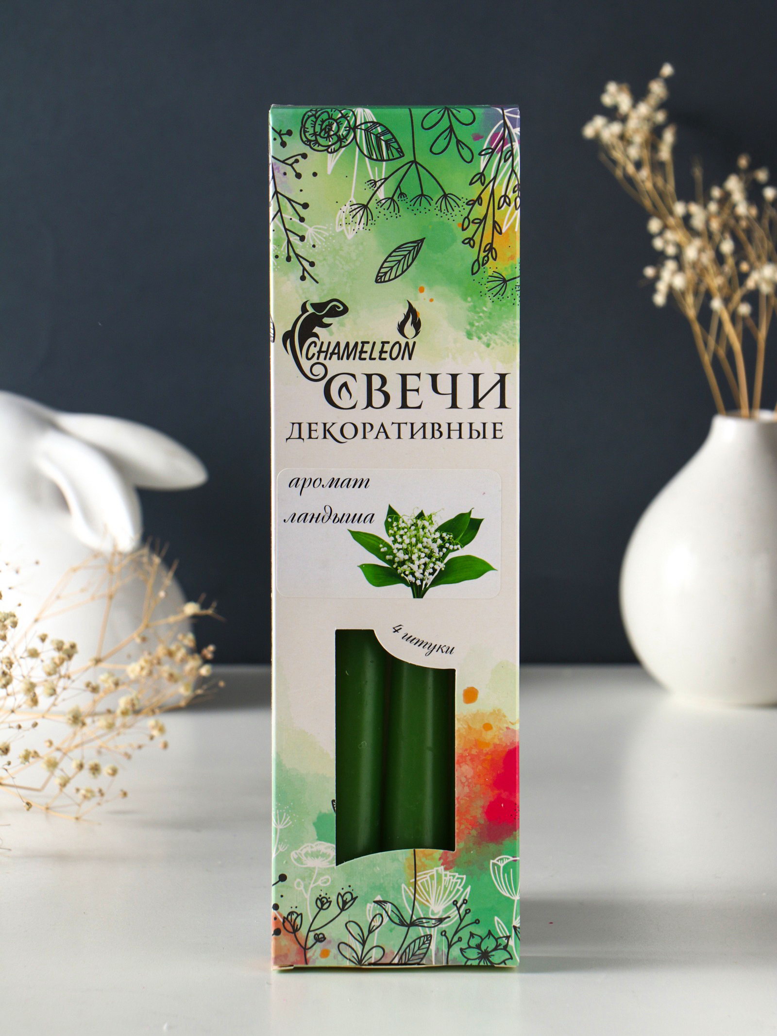 Размер упаковки: 8 x 2.3 x 27 см. tnved: 3406000000 Температурное ограничение: Нет Время горения, ч: 8 Ароматизированные: Да Высота свечи, см: 24 Форма свечи: Коническая Аромат: Ландыш Цвет: Зелёный Состав: Парафин Набор: Да Создайте в доме атмосферу весеннего леса с этим набором высоких конических свечей. Их чистый и нежный аромат ландыша наполняет пространство свежестью после дождя, помогая снять дневное напряжение и настроиться на отдых. Каждая свеча горит до восьми часов, обеспечивая длительное аромасопровождение для вечера с книгой или спокойных бесед. Подробнее о наборе