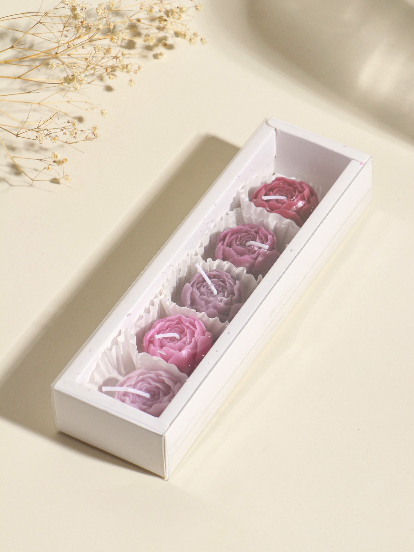 Набор свечей декоративных "Пионы", 5 шт. 3.5x3.5x2.5 см, розово-фиолетовые, 6.5x22.5x3.5 см, 22.5x6.5x3.5 см., Китай