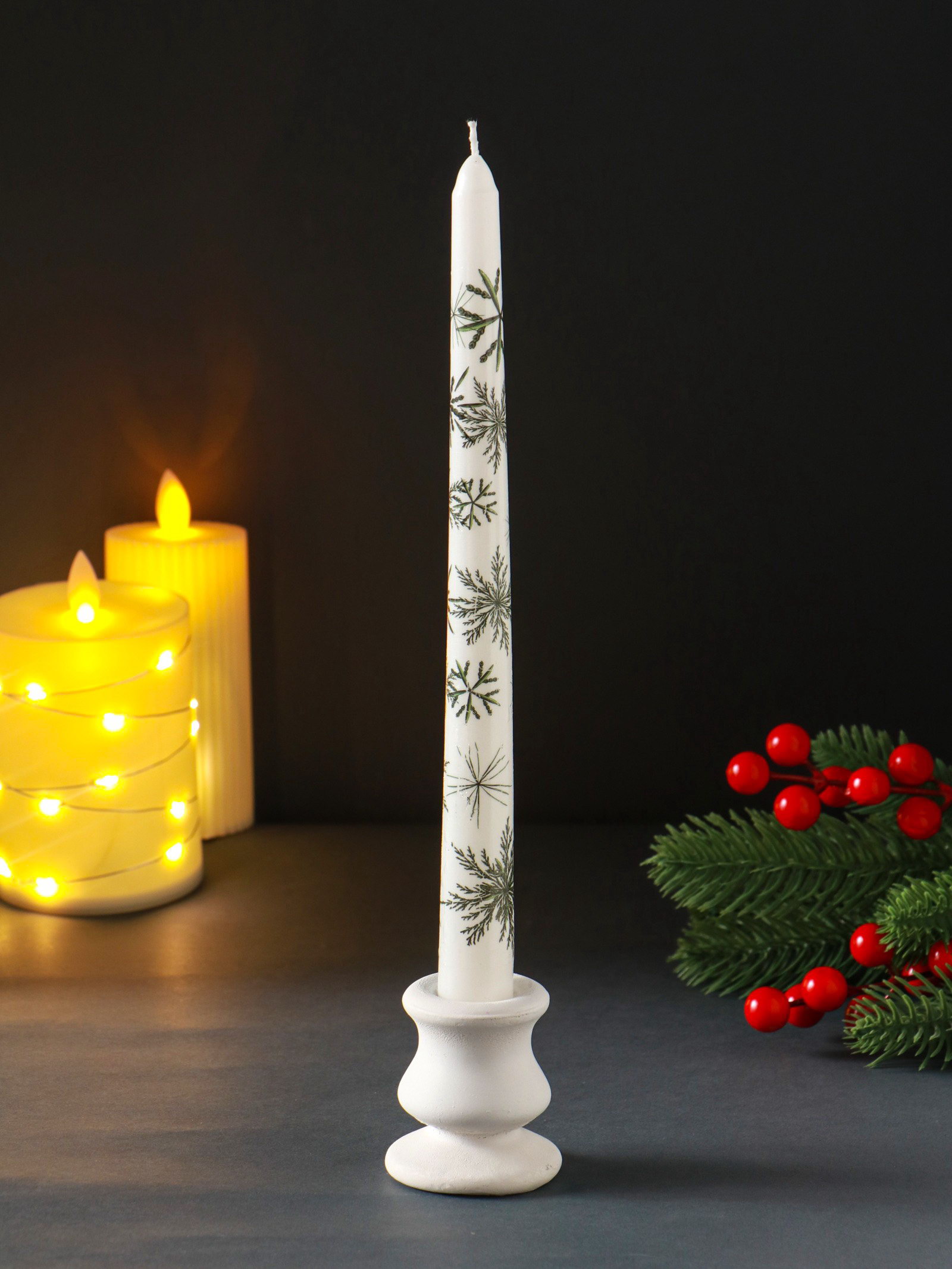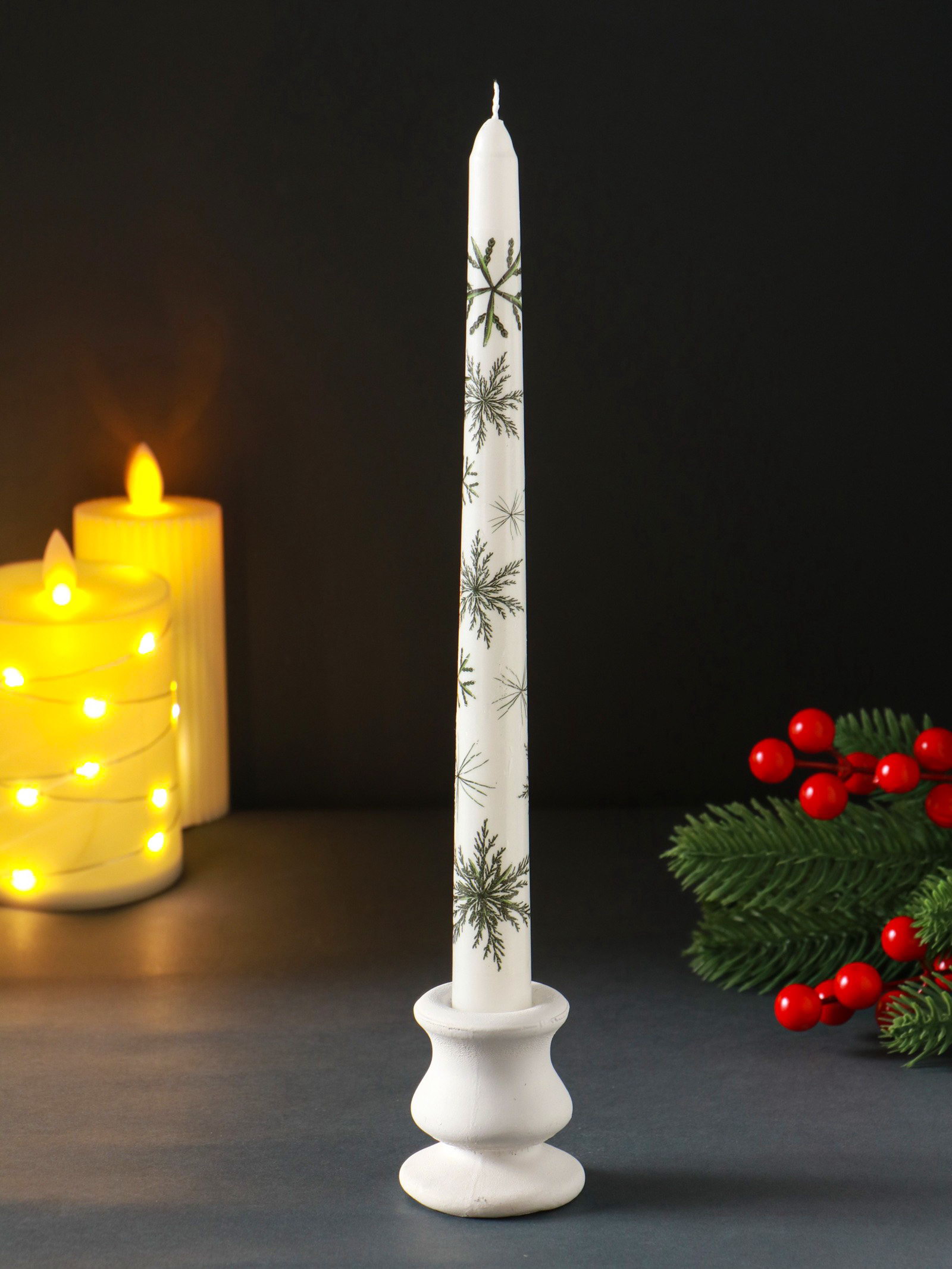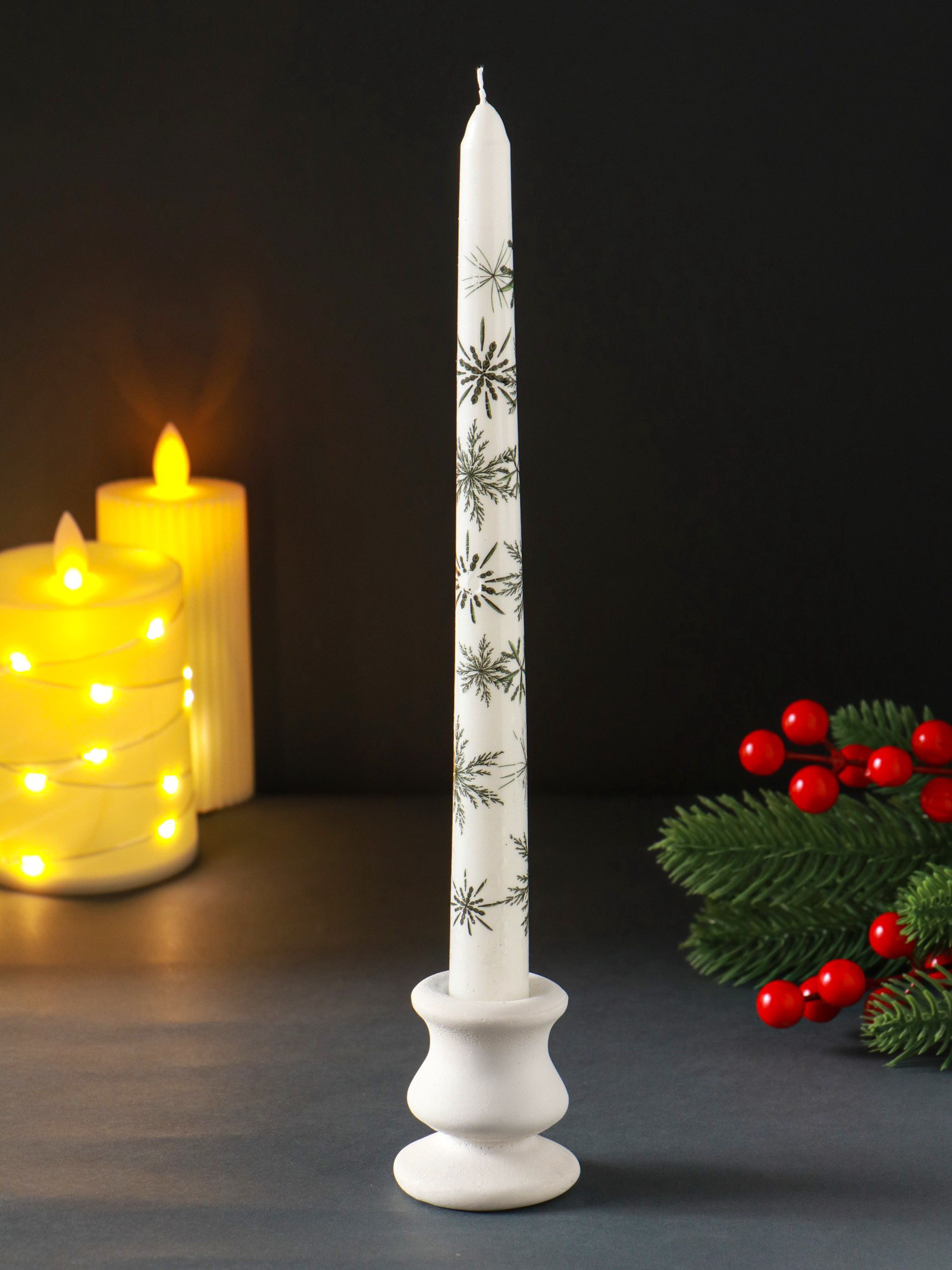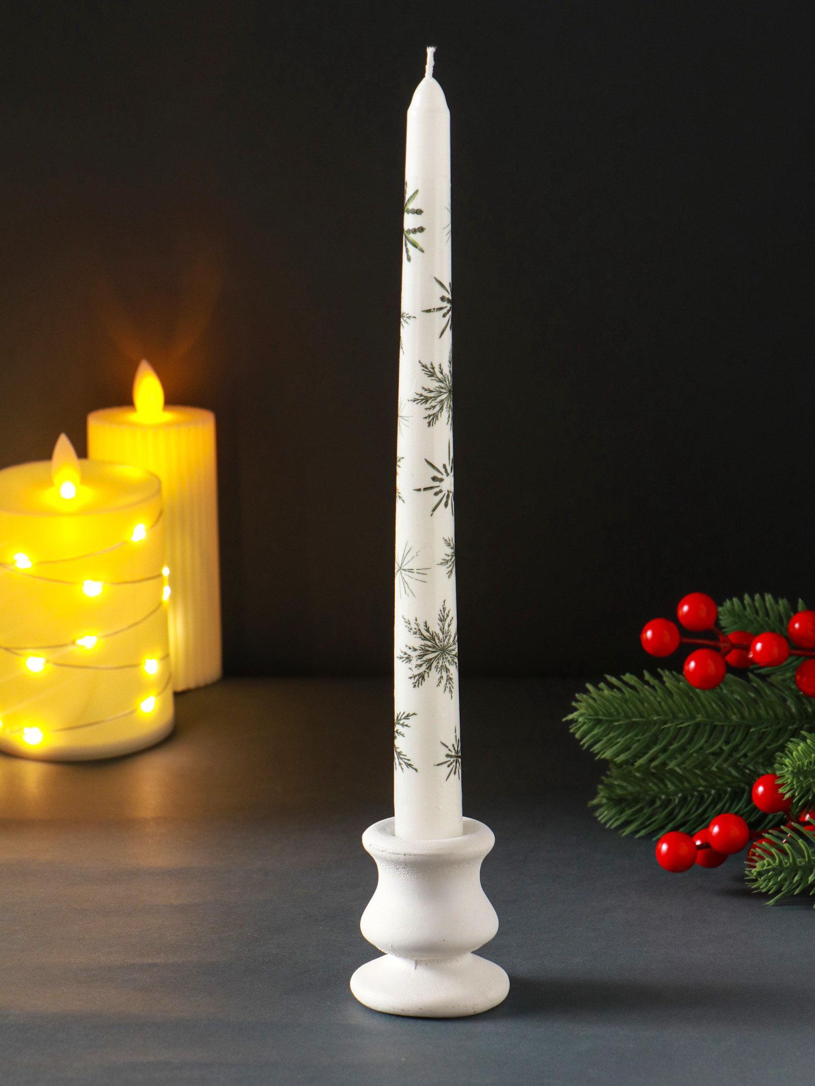 Создайте праздничное настроение Мерцание этой свечи наполнит комнату тёплым светом, похожим на отблеск зимнего солнца на снегу. Она станет центральным элементом новогоднего декора на столе или каминной полке, добавляя композиции объём и мягкое свечение. Идеальное решение для создания умиротворяющей обстановки в долгие зимние вечера. | ||