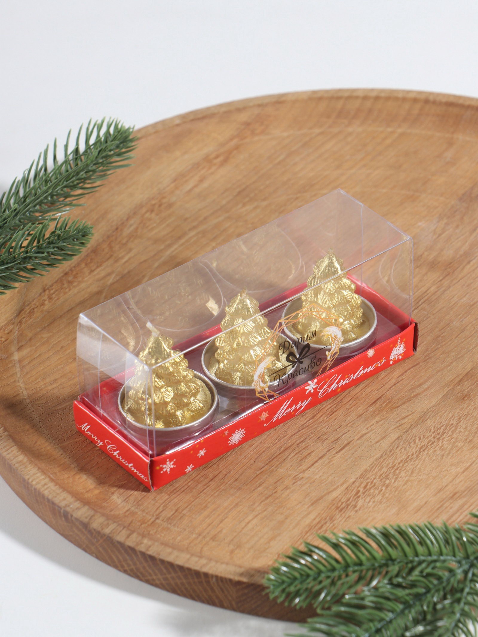 Набор свечей новогодних "Ёлка золотая", 3 шт., 4x6 см, 5x14x7 см., Дарим Красиво, Китай