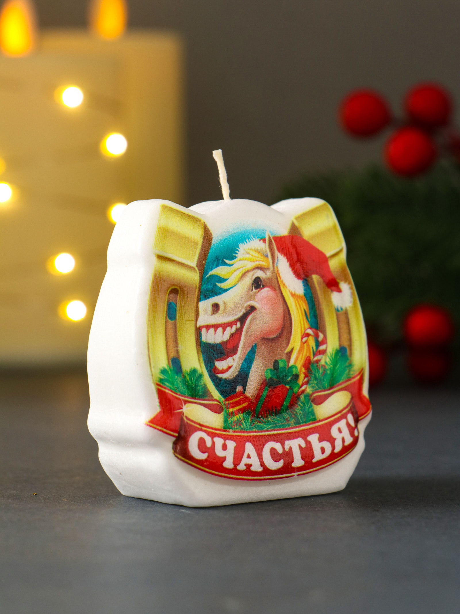 Свеча новогодняя "Лошадь. Подкова. Счастья", 6x2.8x6 см, Омский свечной завод, Россия