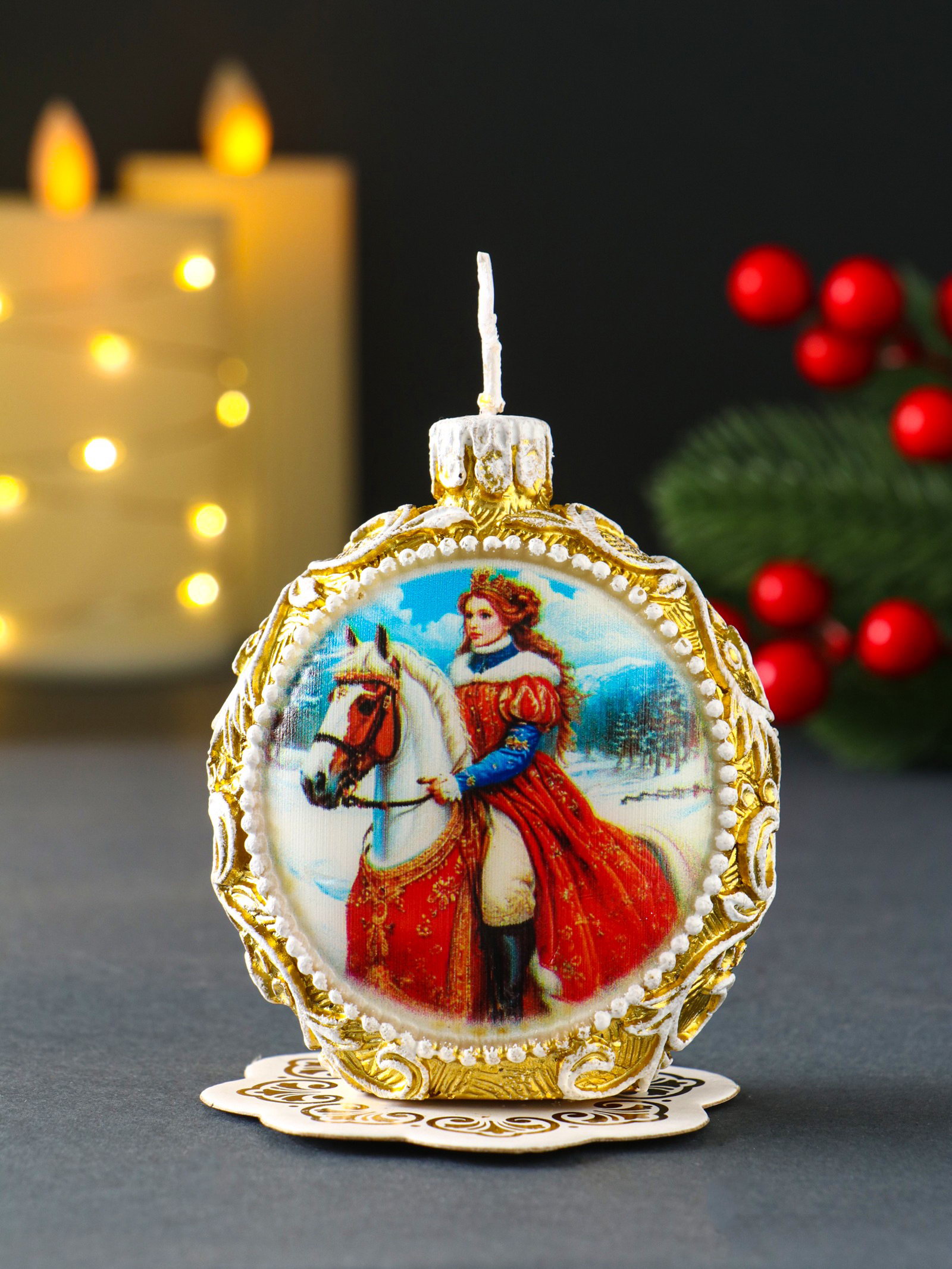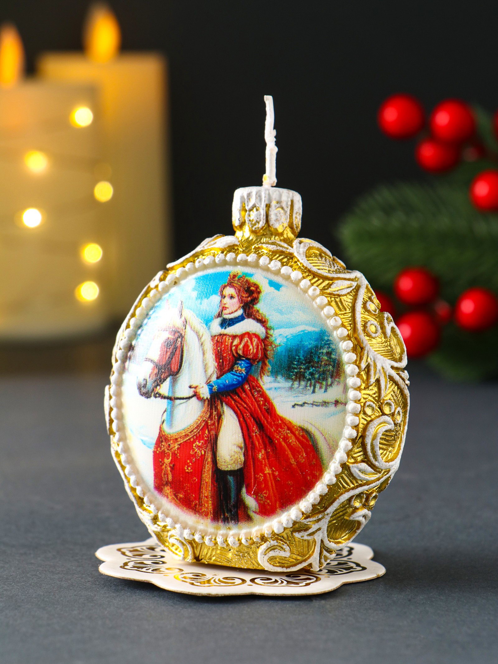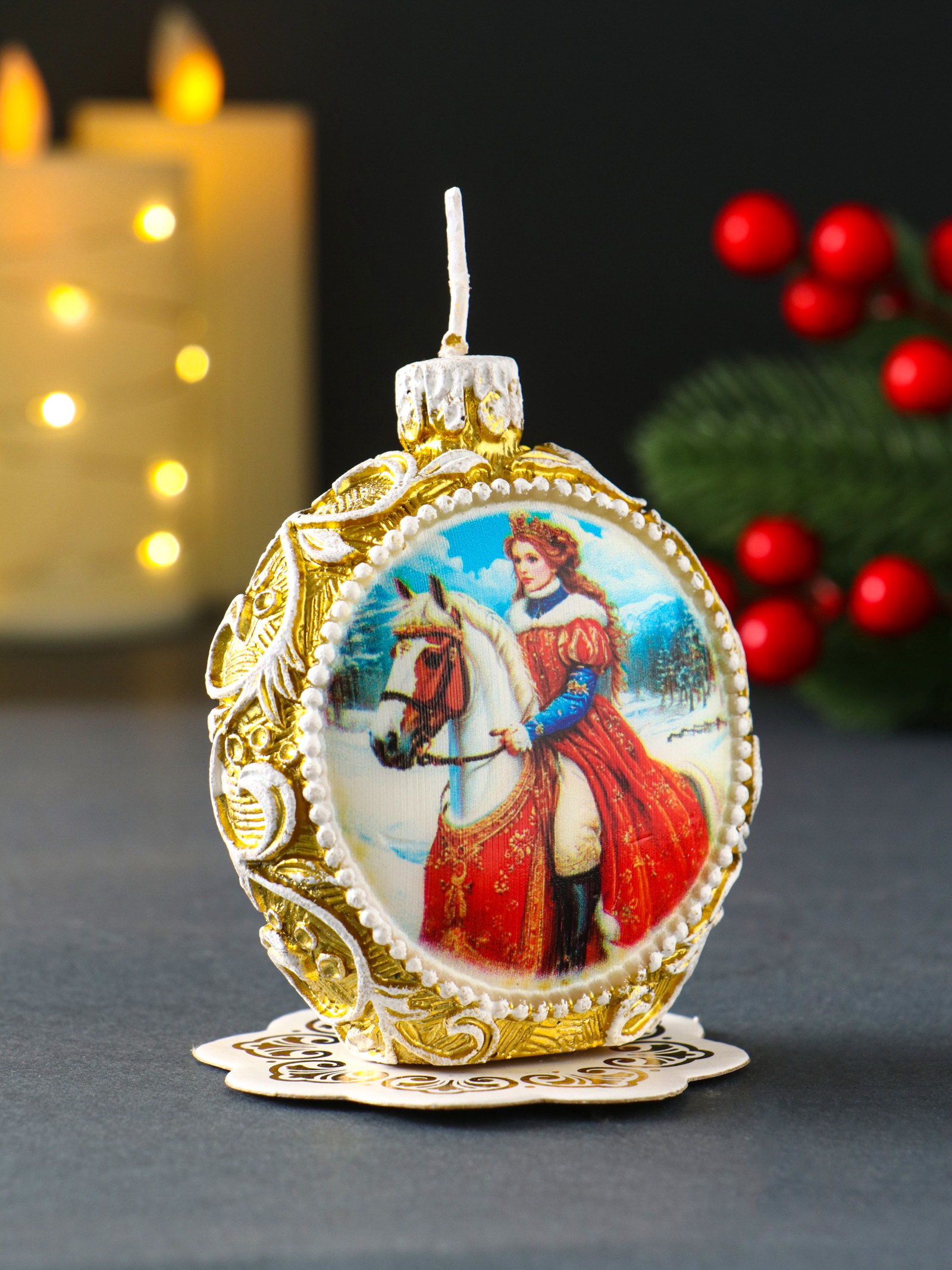 Декоративная свеча новогодняя "Шар узорный. Княгиня на коне", золотой, 7.2x3.8x8.5 см, Омский свечной завод, Россия