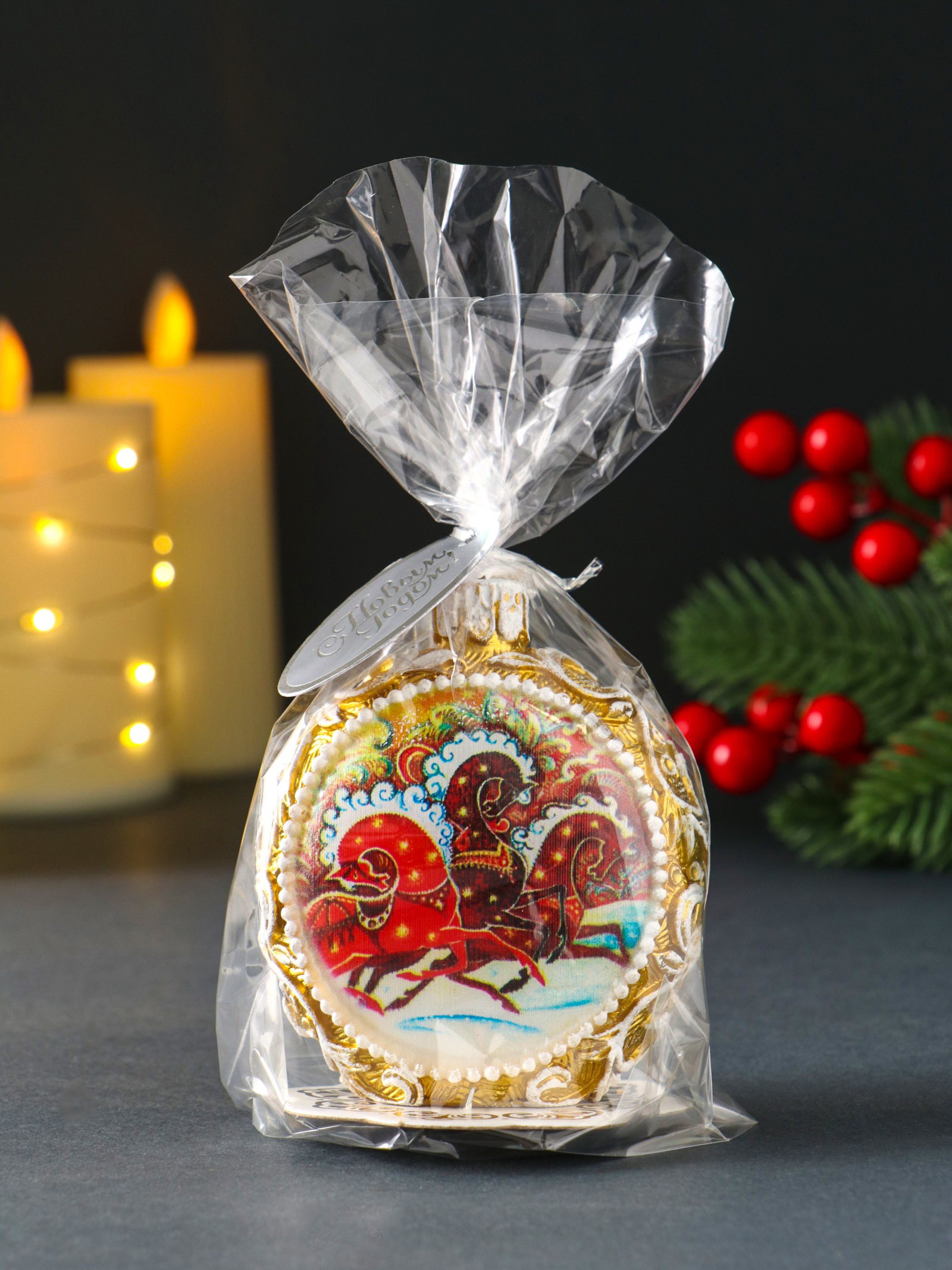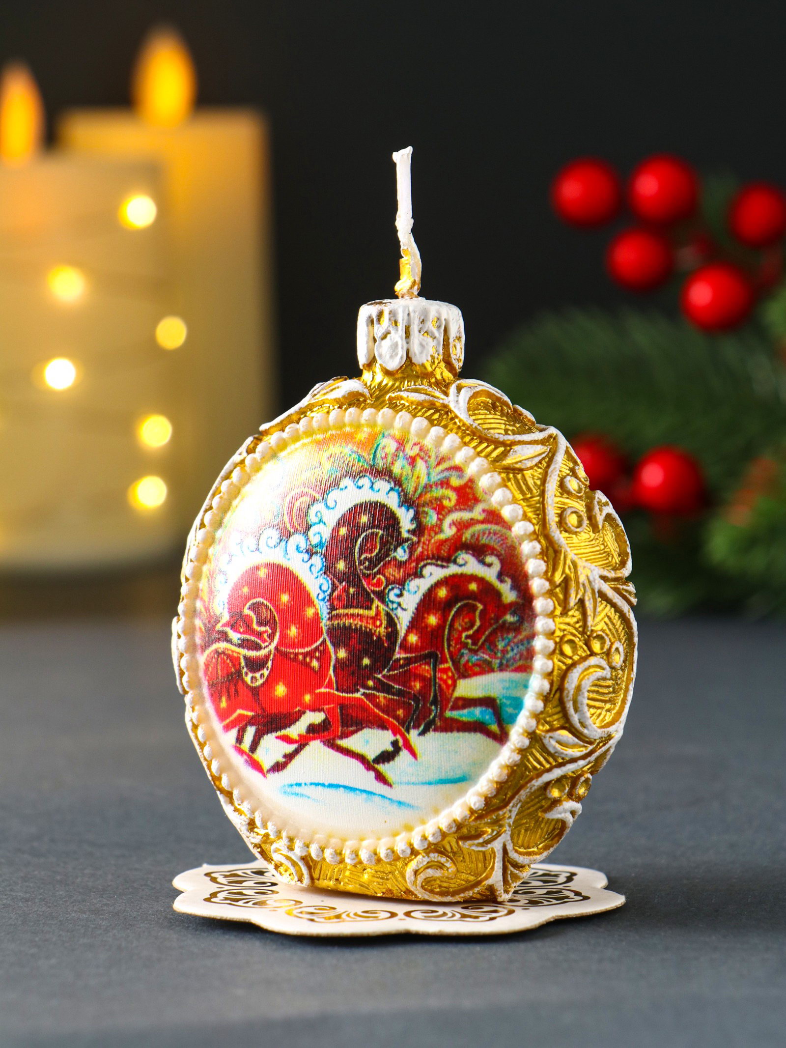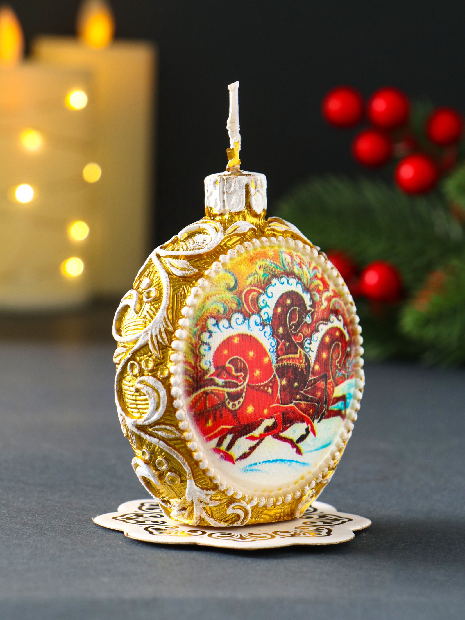 Декоративная свеча новогодняя "Шар узорный. Три коня", золотой, 7.2x3.8x8.5 см, Омский свечной завод, Россия