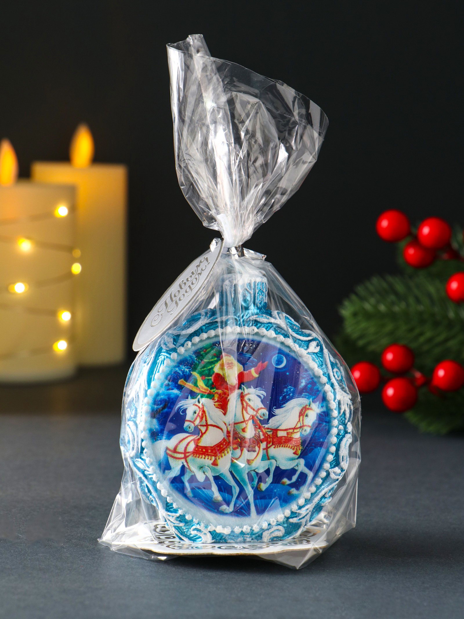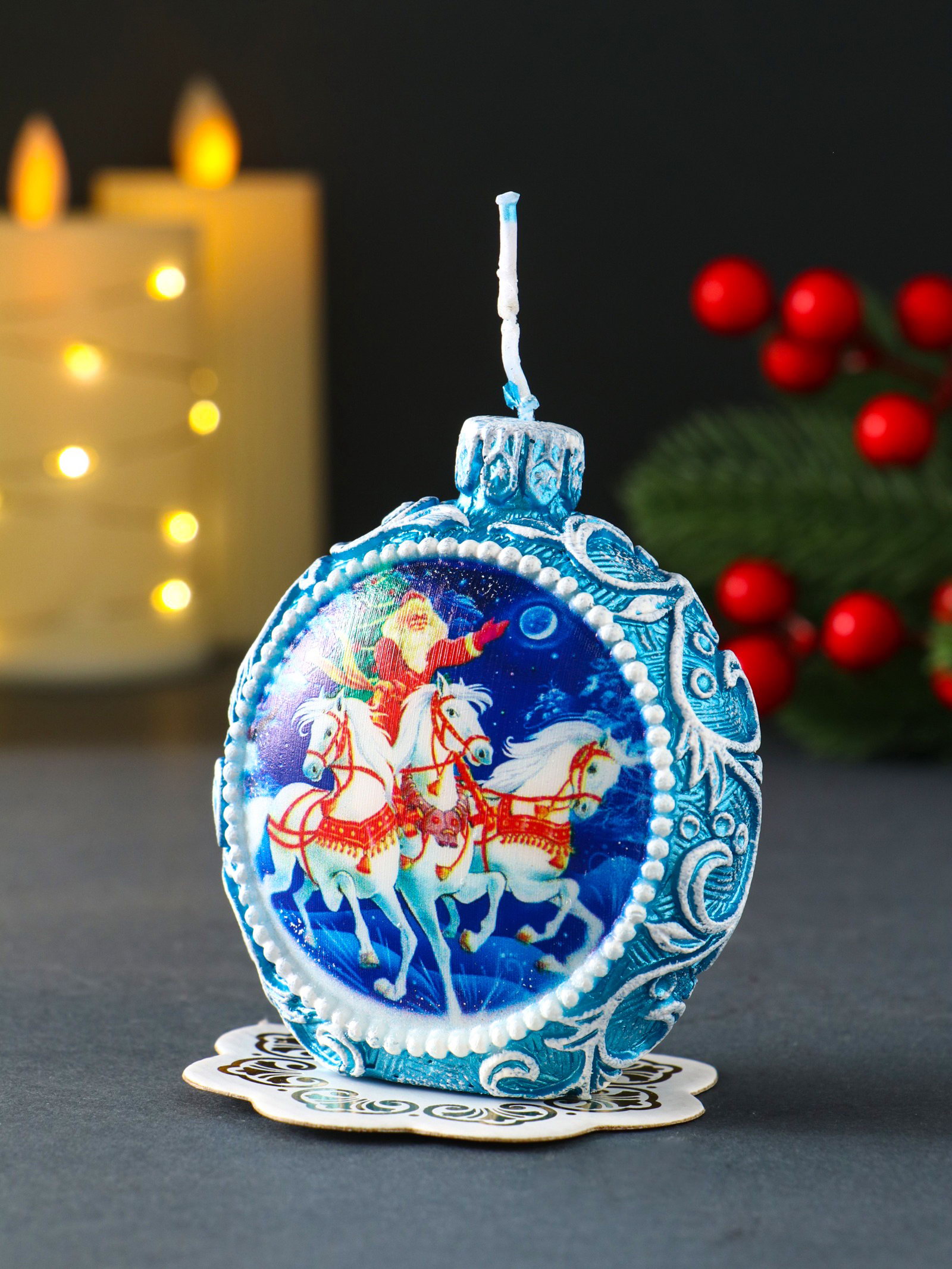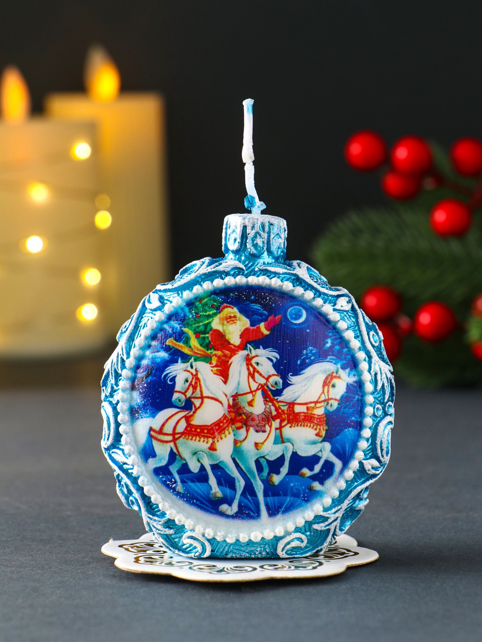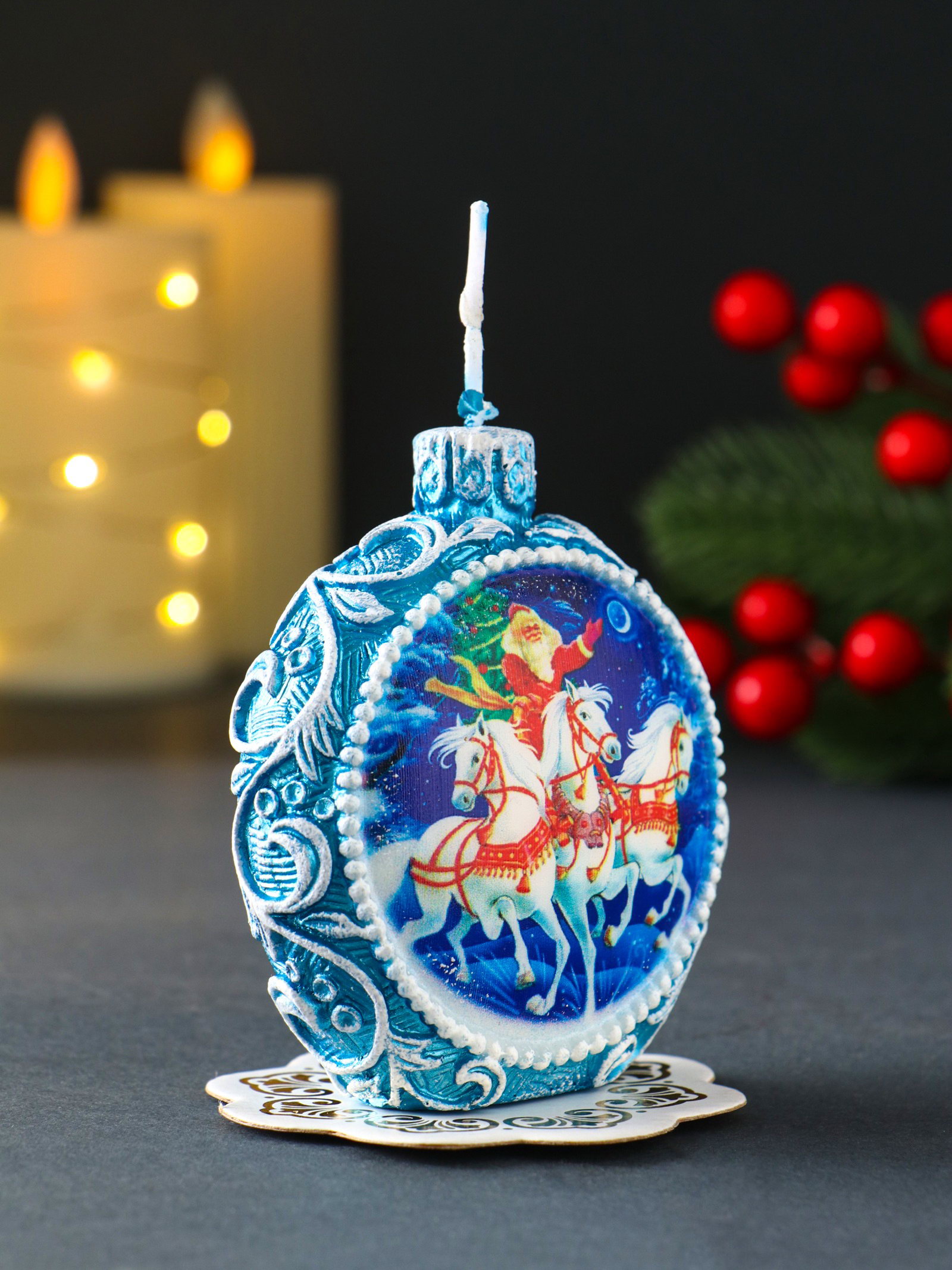 Декоративная свеча новогодняя "Дед Мороз и три коня", синий, 7.2x3.8x8.5 см, Омский свечной завод, Россия