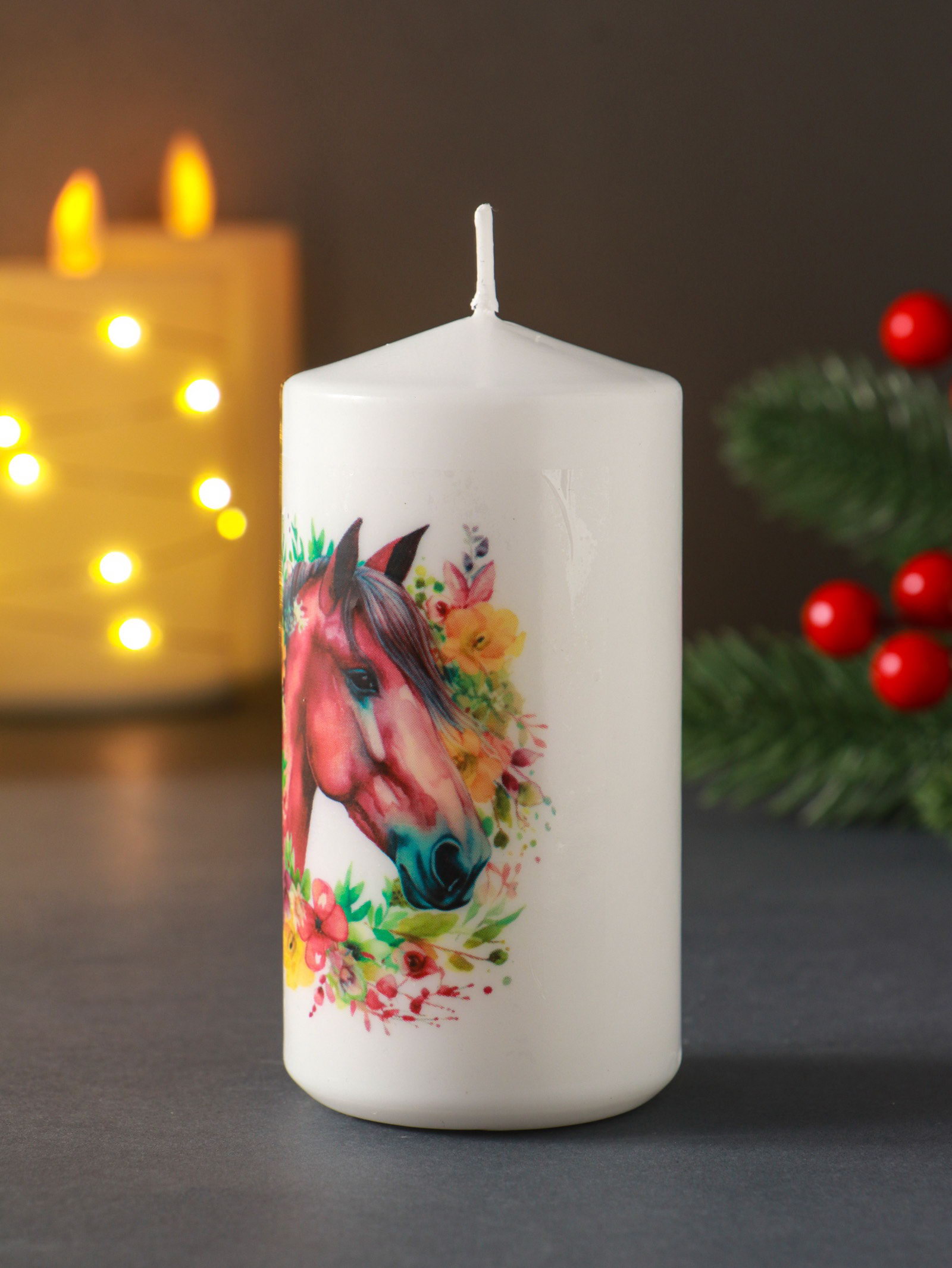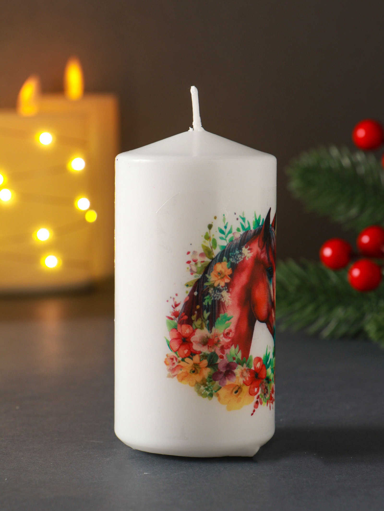 Свеча новогодняя 50x100 мм, с декором, конь, белая, Россия