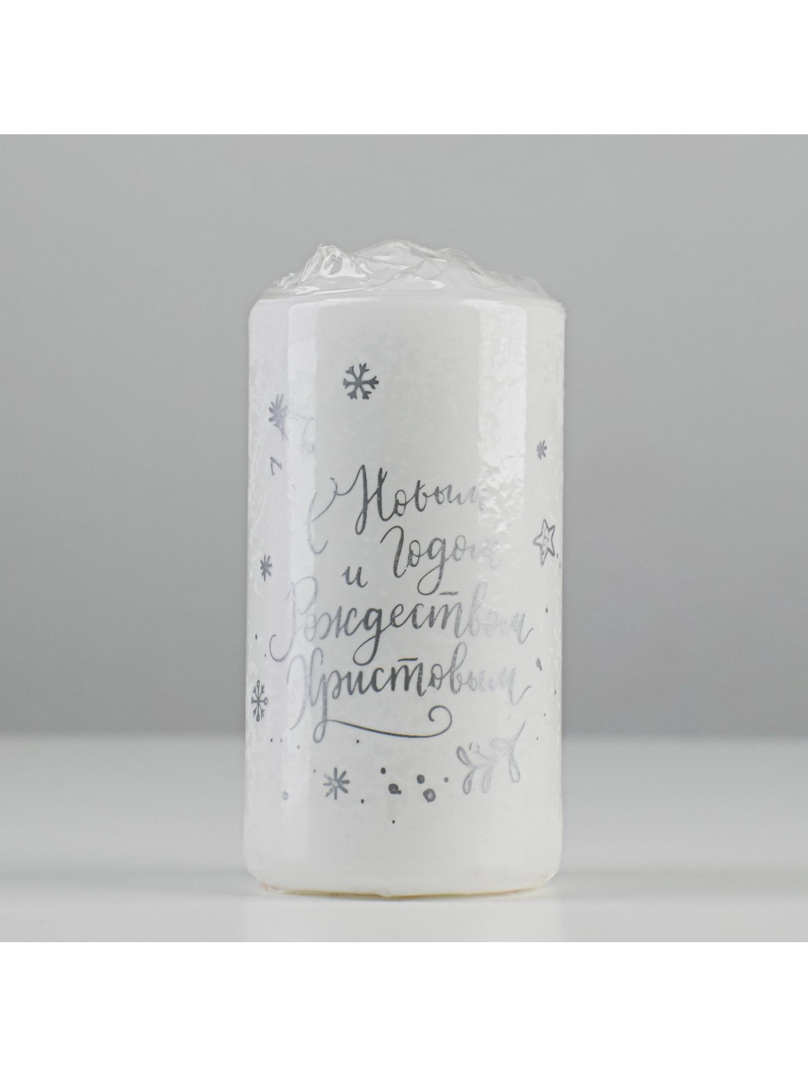 Свеча-цилиндр "С Новым годом и Рождеством!", 5x10 см, белая с серебром, Россия