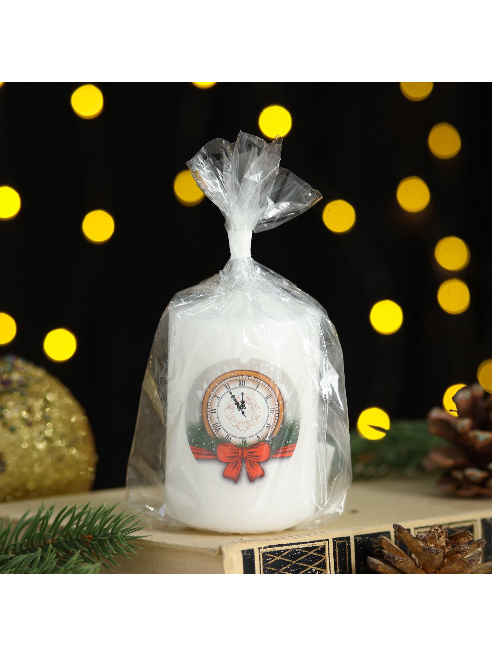 Свеча столбик с рисунком "Новогодние мотивы. Часы", 50x80 мм, Россия