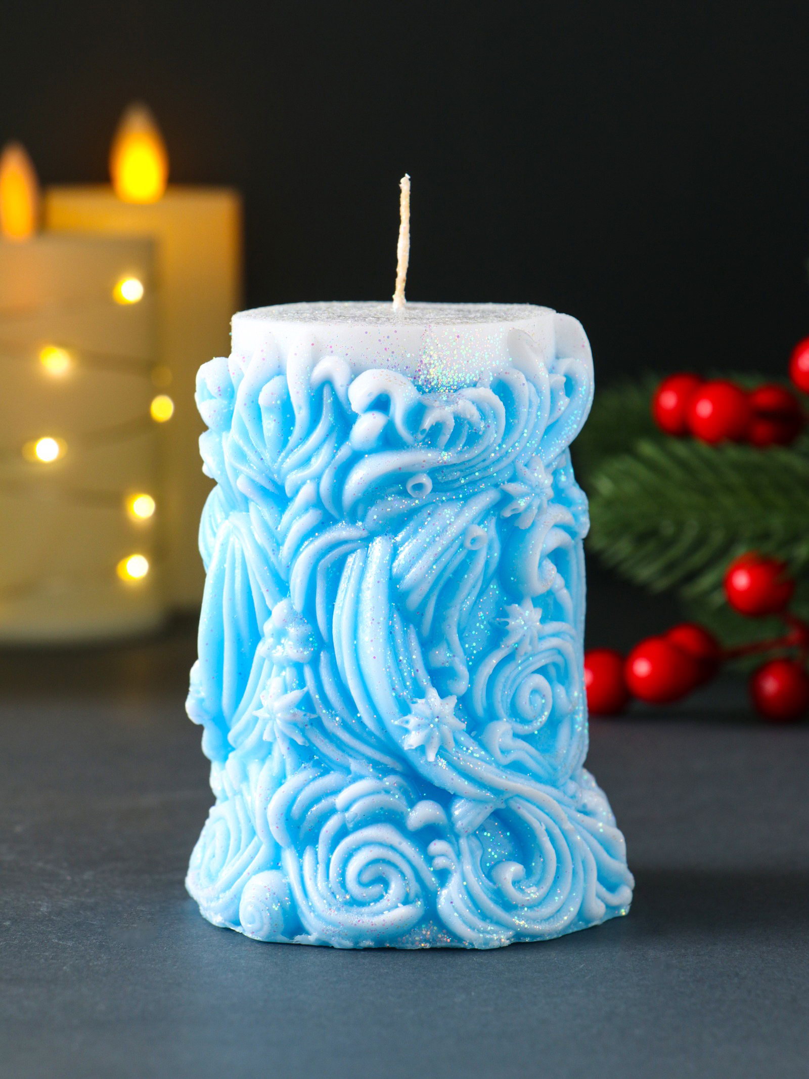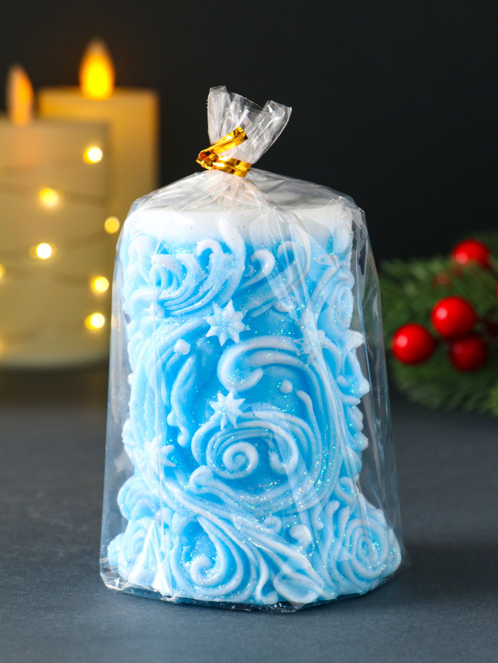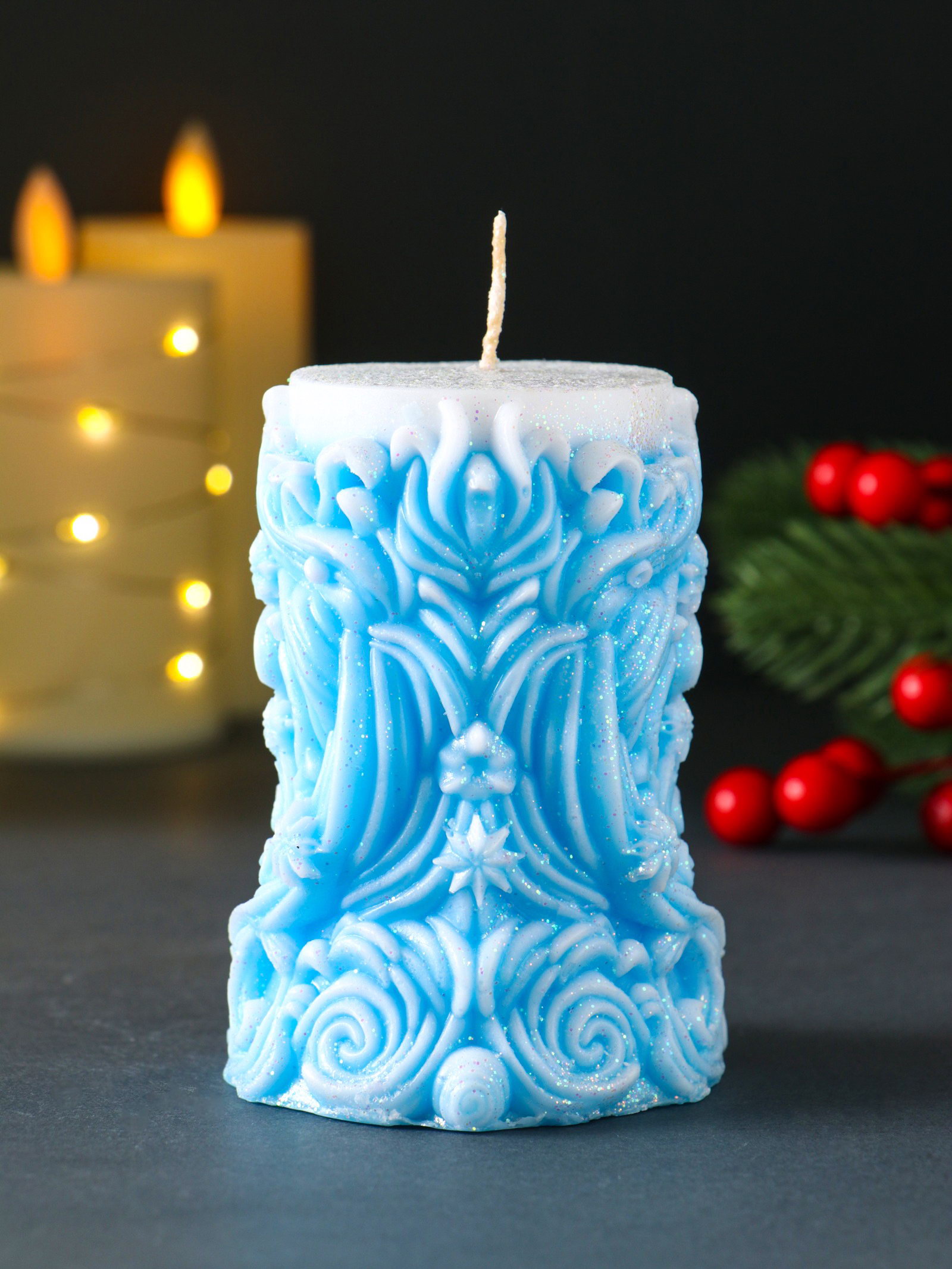 Свеча новогодняя столбик "Резная", голубой, Россия