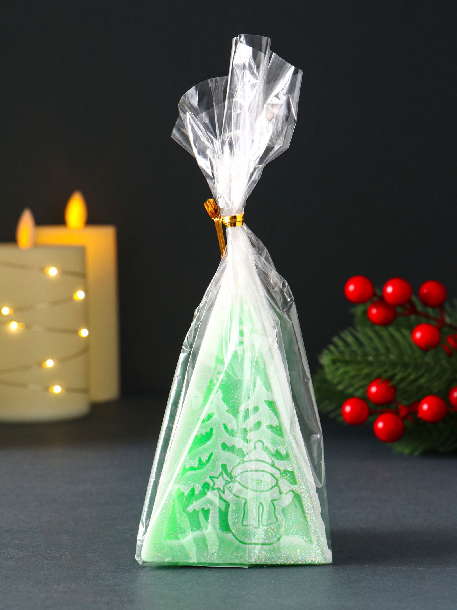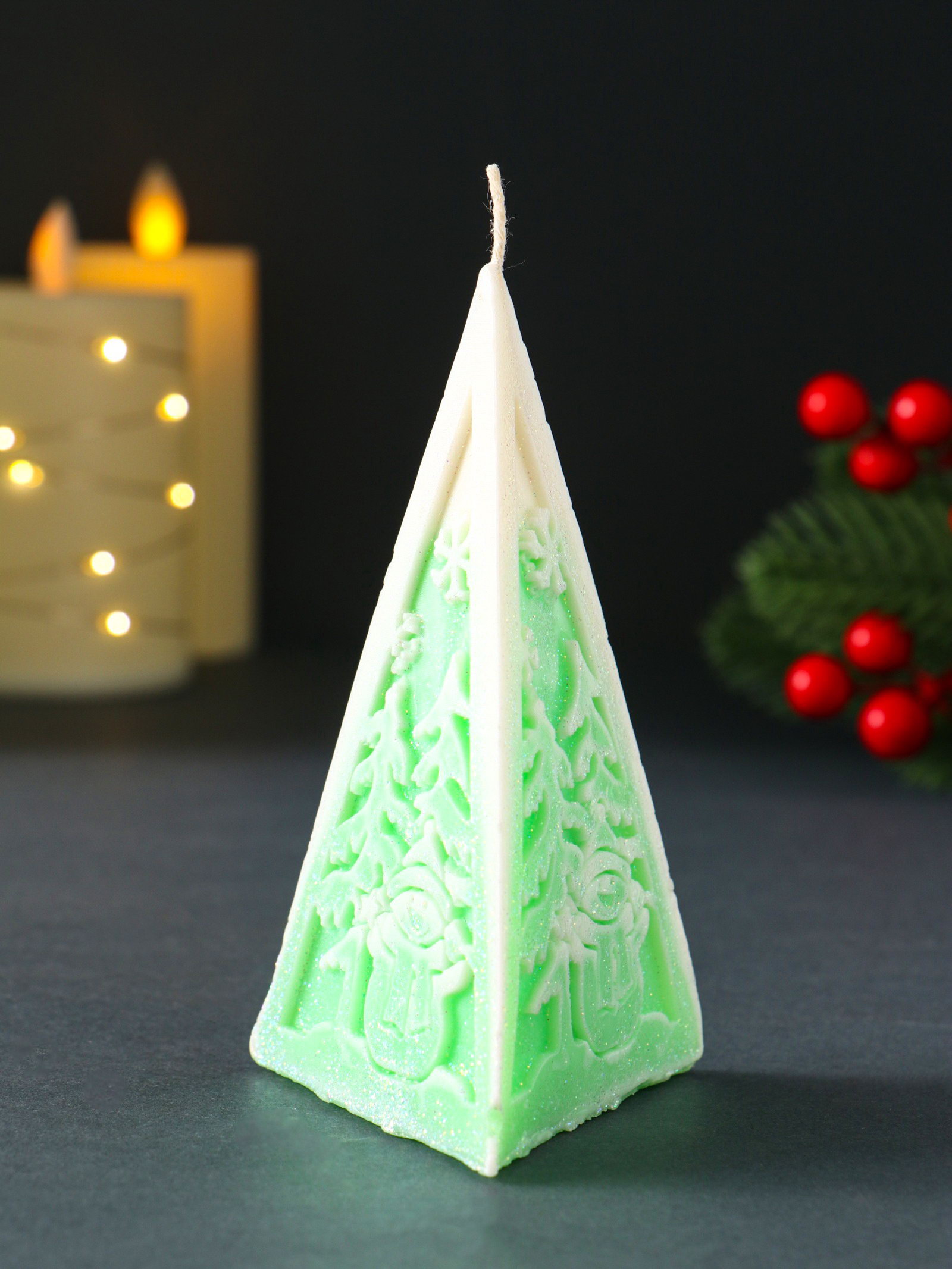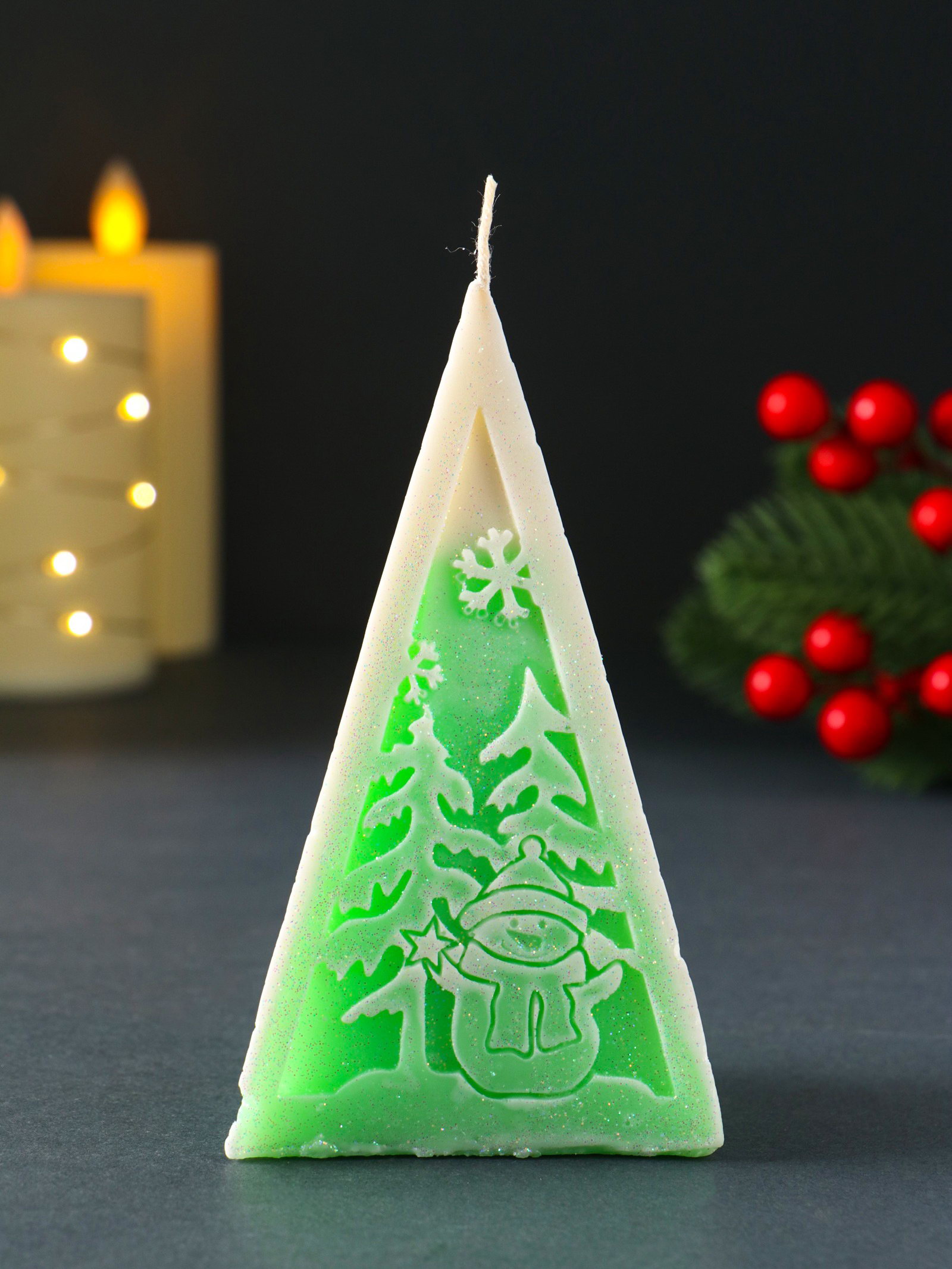 Свеча новогодняя "Пирамида Снеговик", 60x120 мм, зелёный, Россия
