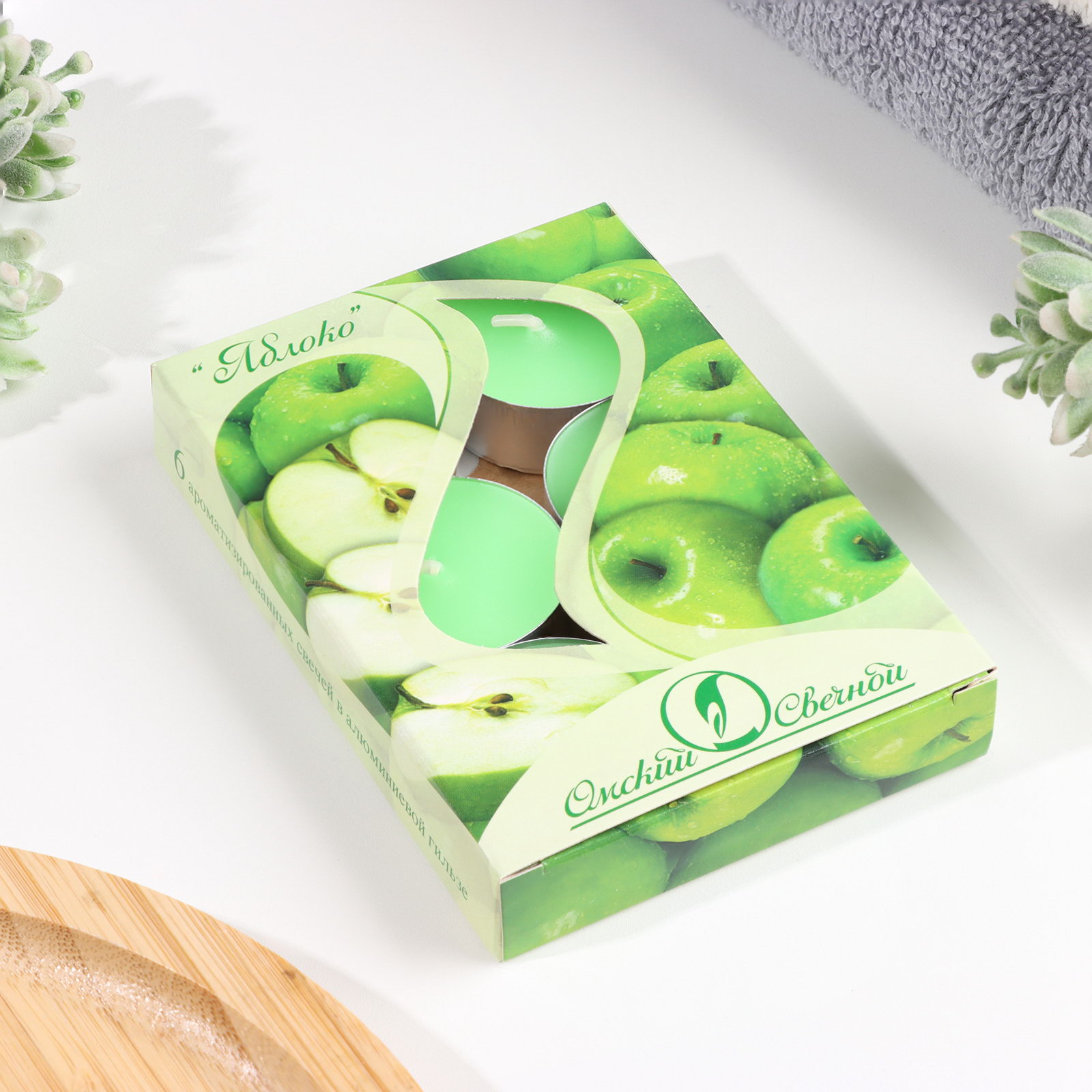 Набор чайных свечей ароматических "Яблоко", 3.8х1.6 см, 3.5 ч, 12 г, 6 штук, 3.8x3.8x1.6 см., Омский свечной завод, Россия