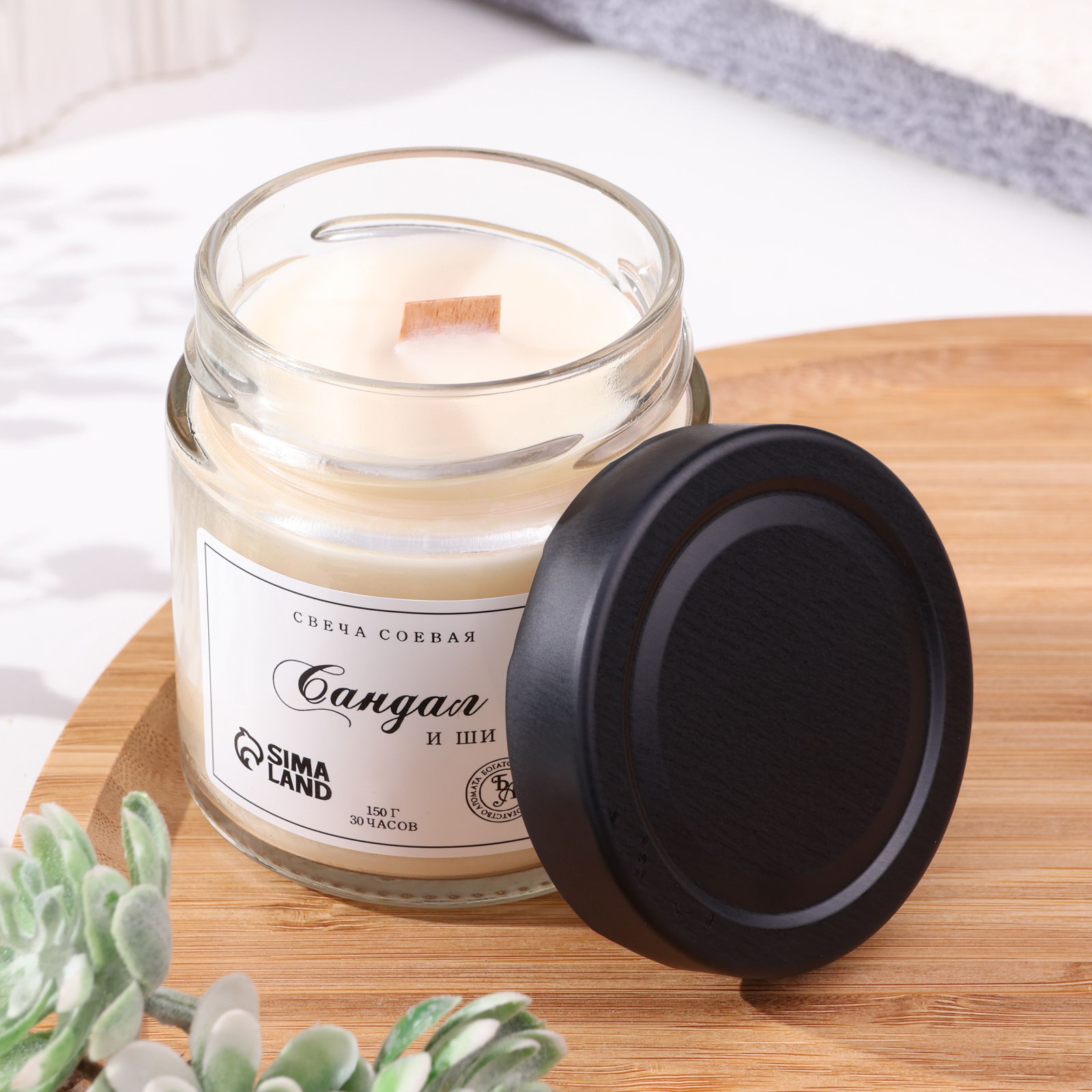 Свеча ароматическая из соевого воска в банке, 150 г, деревянный фитиль, сандал и ши, Россия
