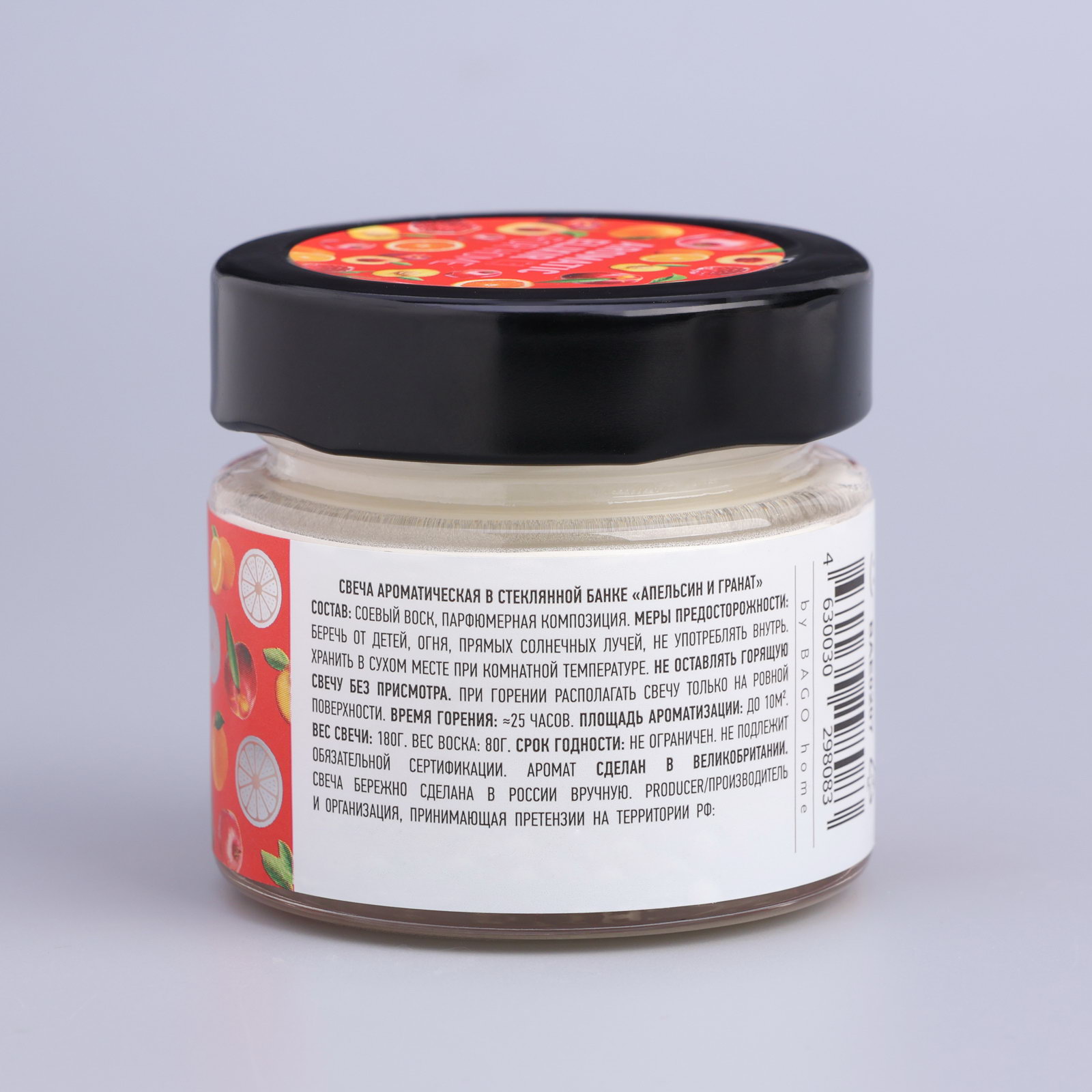 Свеча ароматическая в банке "Апельсин и гранат", совый воск, 80 г, BAGO home, Россия