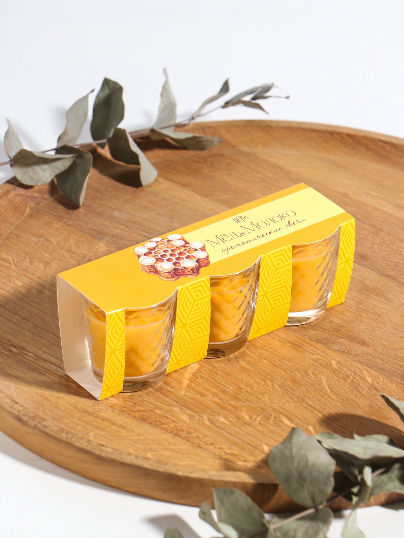 Ароматическая свеча в стакане, набор 3 шт., по 50 мл, 10 ч, 32 г, молоко-мёд, Русская свечная мануфактура, Россия