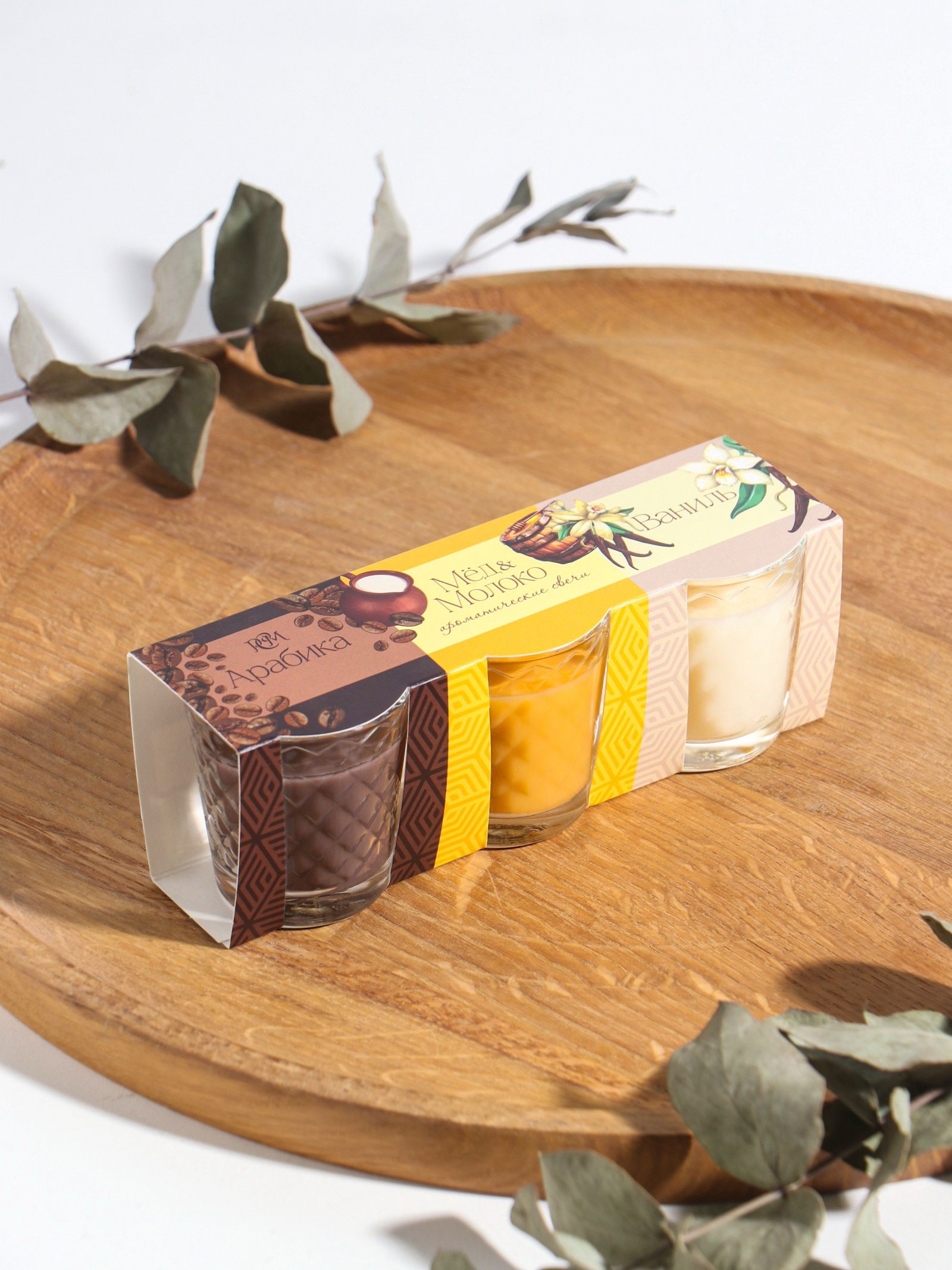 Ароматическая свеча в стакане, набор 3 шт., по 50 мл, 10 ч, 32 г, ваниль, арабика, молоко-мёд, Русская свечная мануфактура, Россия