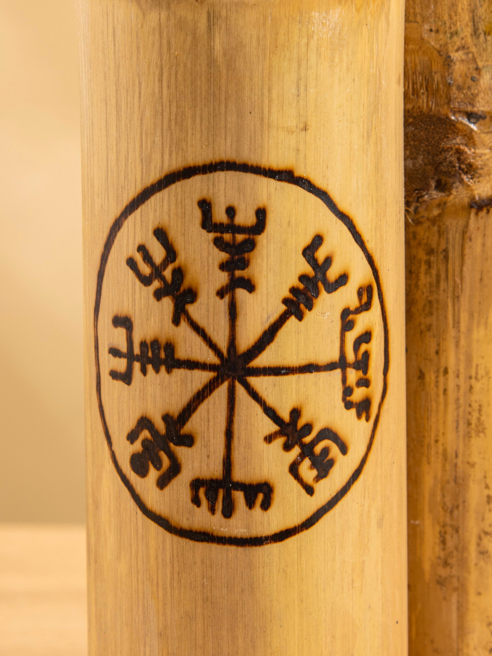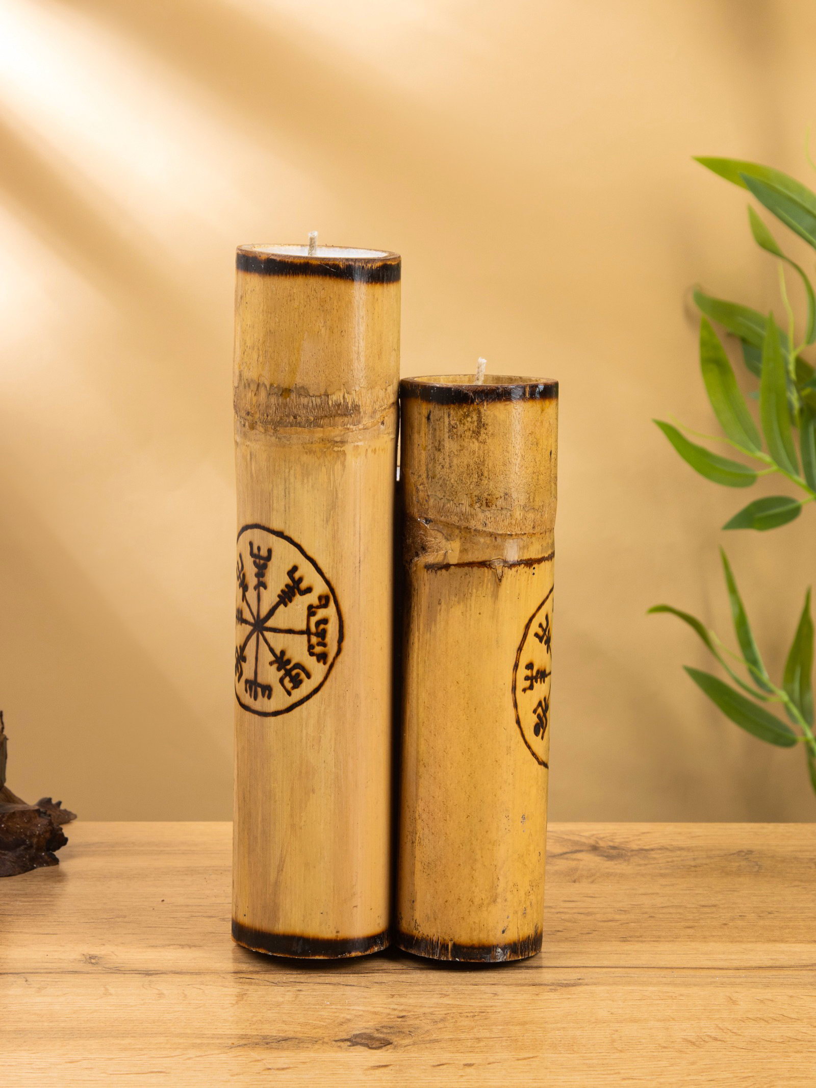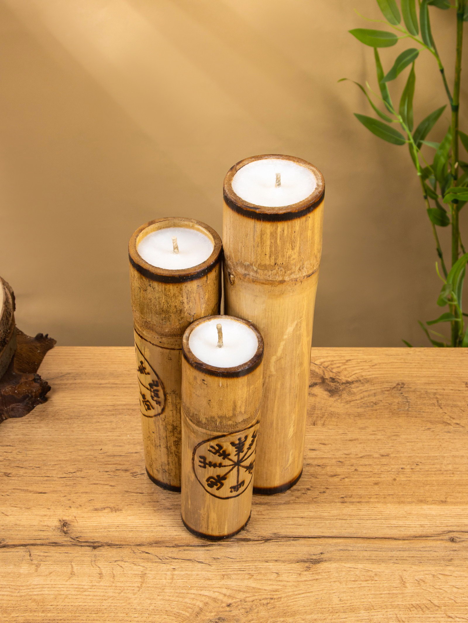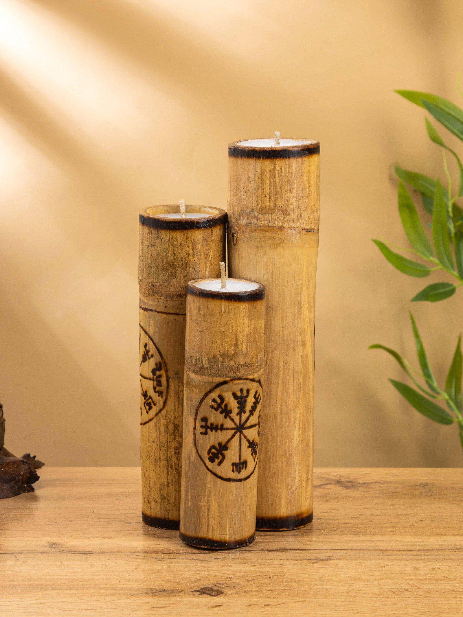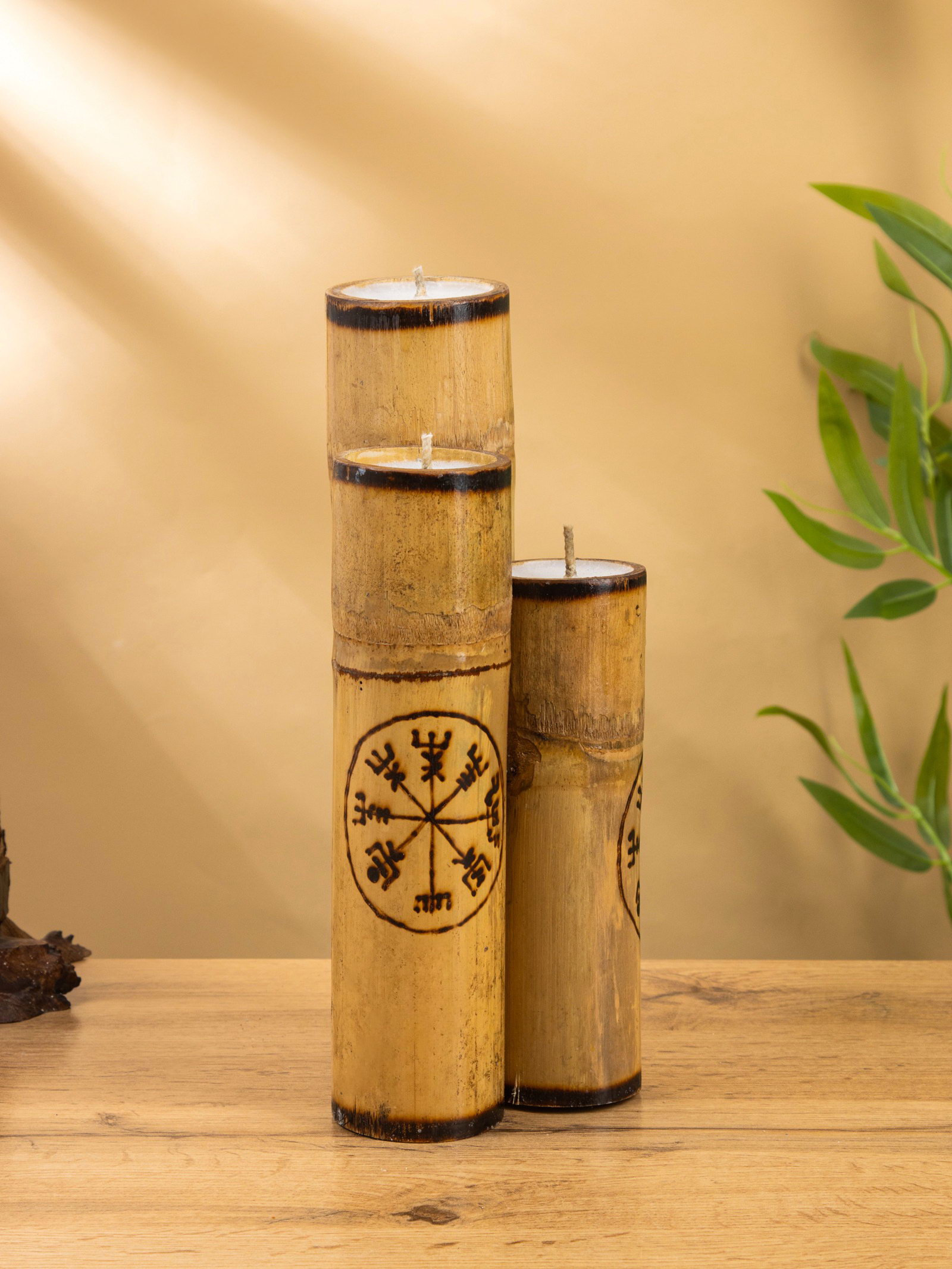 Свеча в бамбуке тройная "Руны", 13x14x30 см, 100 мл, бежевая, 12x12x30 см., Индонезия
