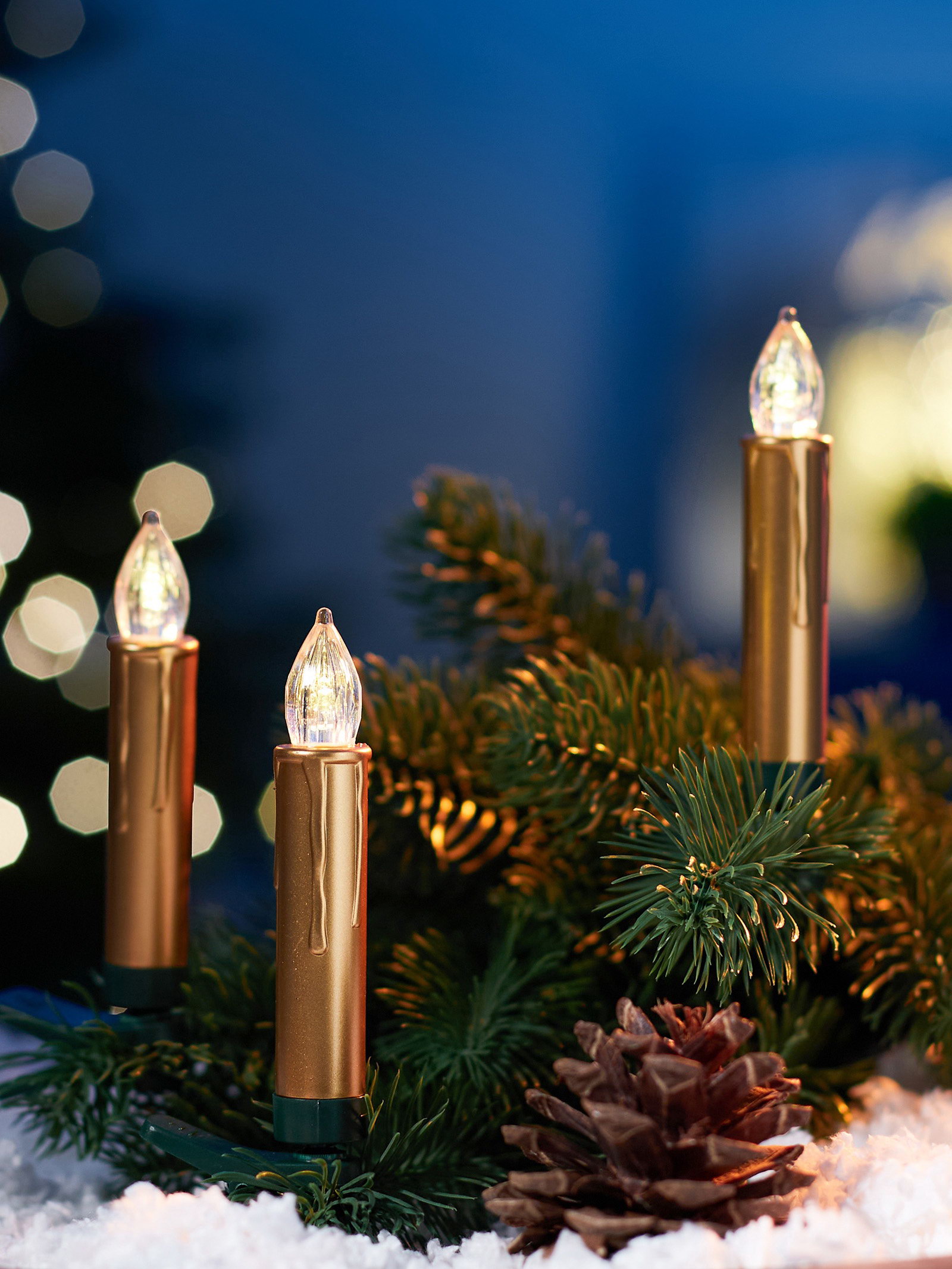 Светодиодные "Свечи на прищепках золотистые" 9 см, набор 10 шт, 10 LED, от батареек АААх6, пульт, свечение тёплое белое, 13x27x4 см., Luazon Lighting, Китай