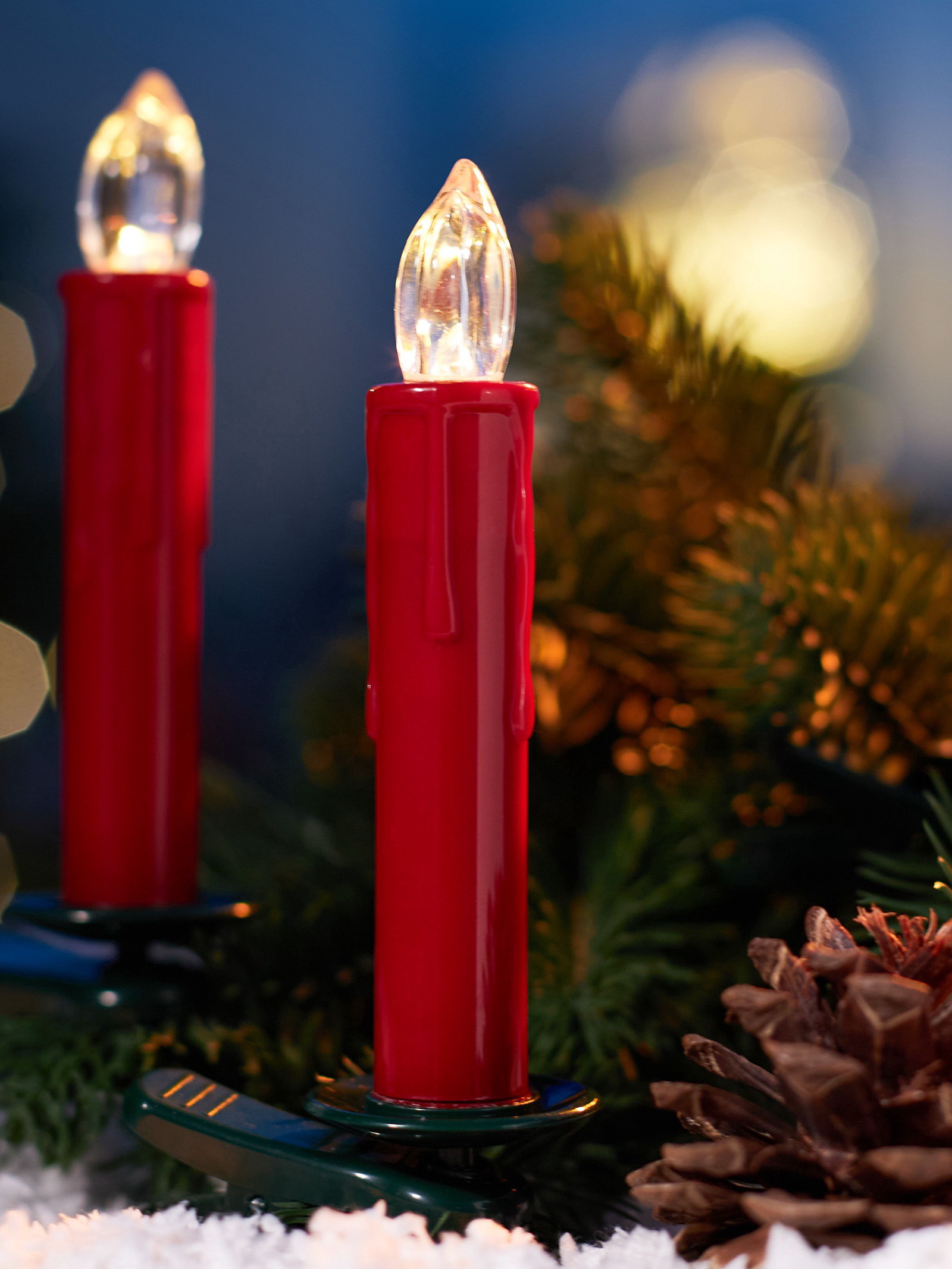 Размер упаковки: 15.5 x 7 x 31 см. tnved: 9405420000 Гарантийный срок, мес.: 12 Количество светодиодов: 10 Высота свечи, см: 11 Тип питания: От батареек Типоразмер батареек: AA (LR6) Цвет свечения: Тёплый белый Режим работы: Постоянное свечение Форма свечи: Цилиндр Цвет: Красный Насыщенный красный цвет и элегантная цилиндрическая форма делают эти светодиодные свечи на прищепках высотой 11 см ярким и стильным украшением любого интерьера. Они создают атмосферу тепла и уюта, подчёркивая праздничное настроение без риска открытого огня. Каждая свеча оснащена светодиодом с тёплым белым свечением, которое мягко освещает пространство и дарит комфортный свет. Питание от десяти батареек типа AA (LR6) обеспечивает длительную и стабильную работу, а пульт дистанционного управления позволяет легко включать и выключать свечи, управлять ими из любого уголка комнаты.