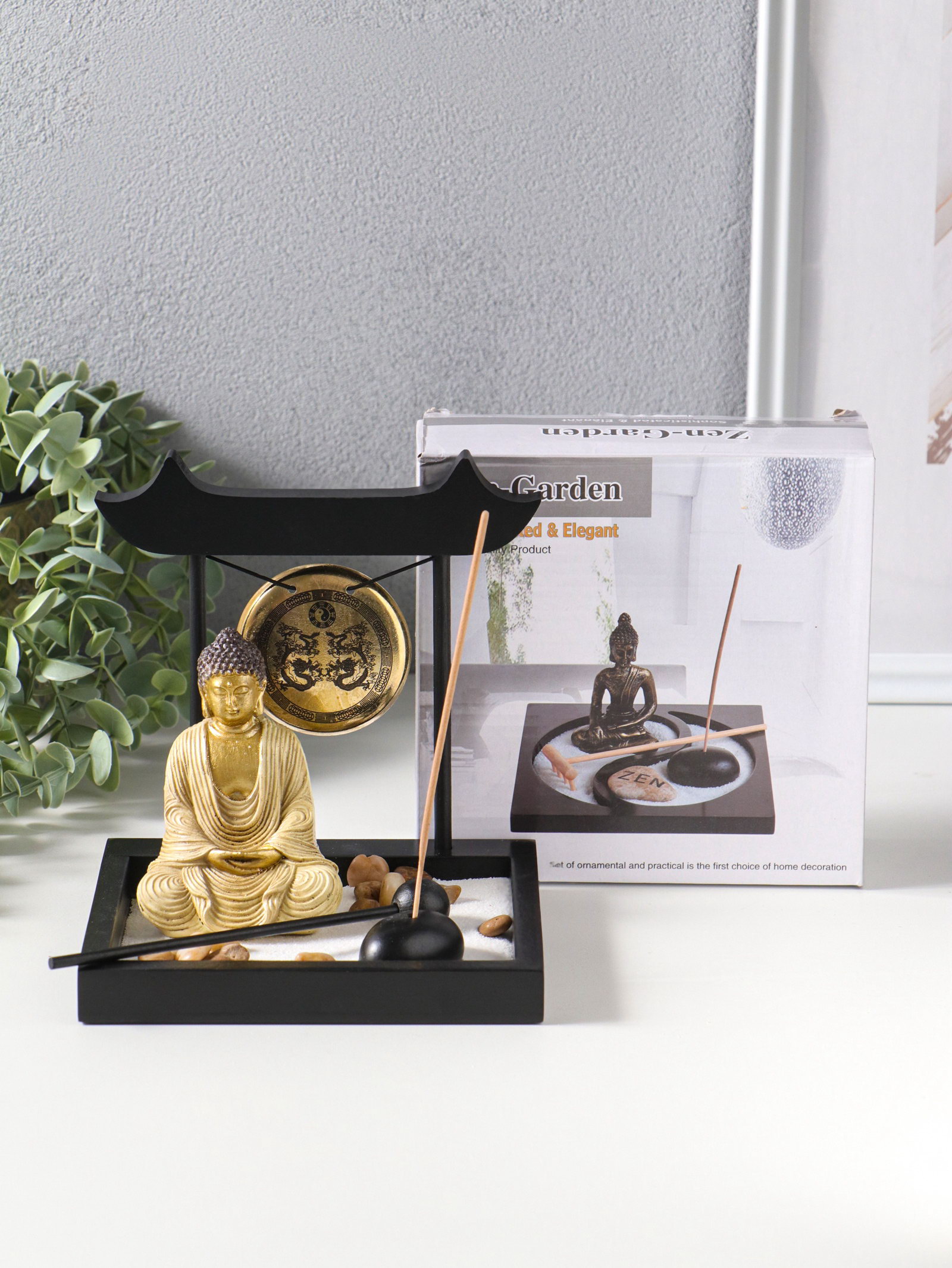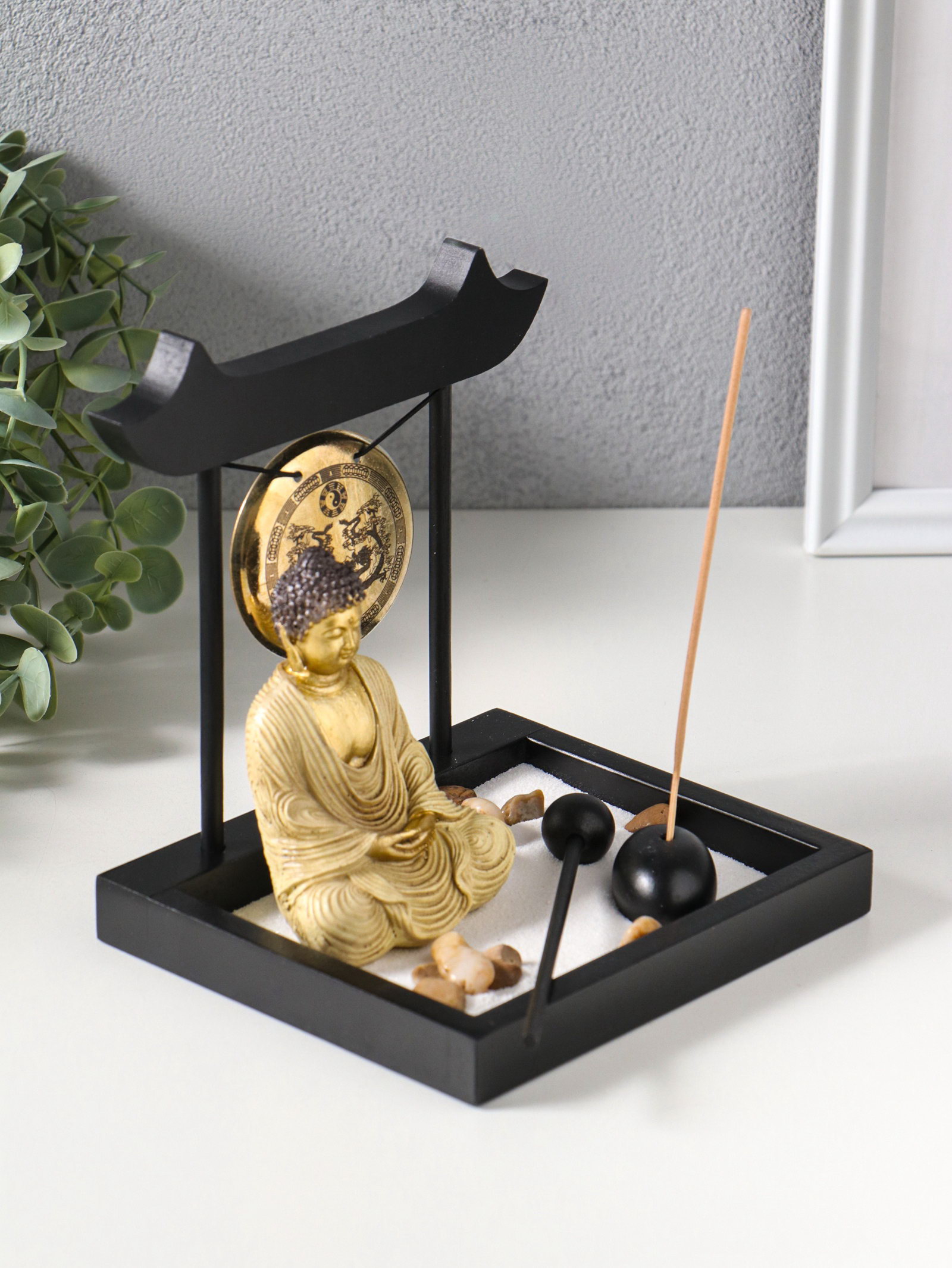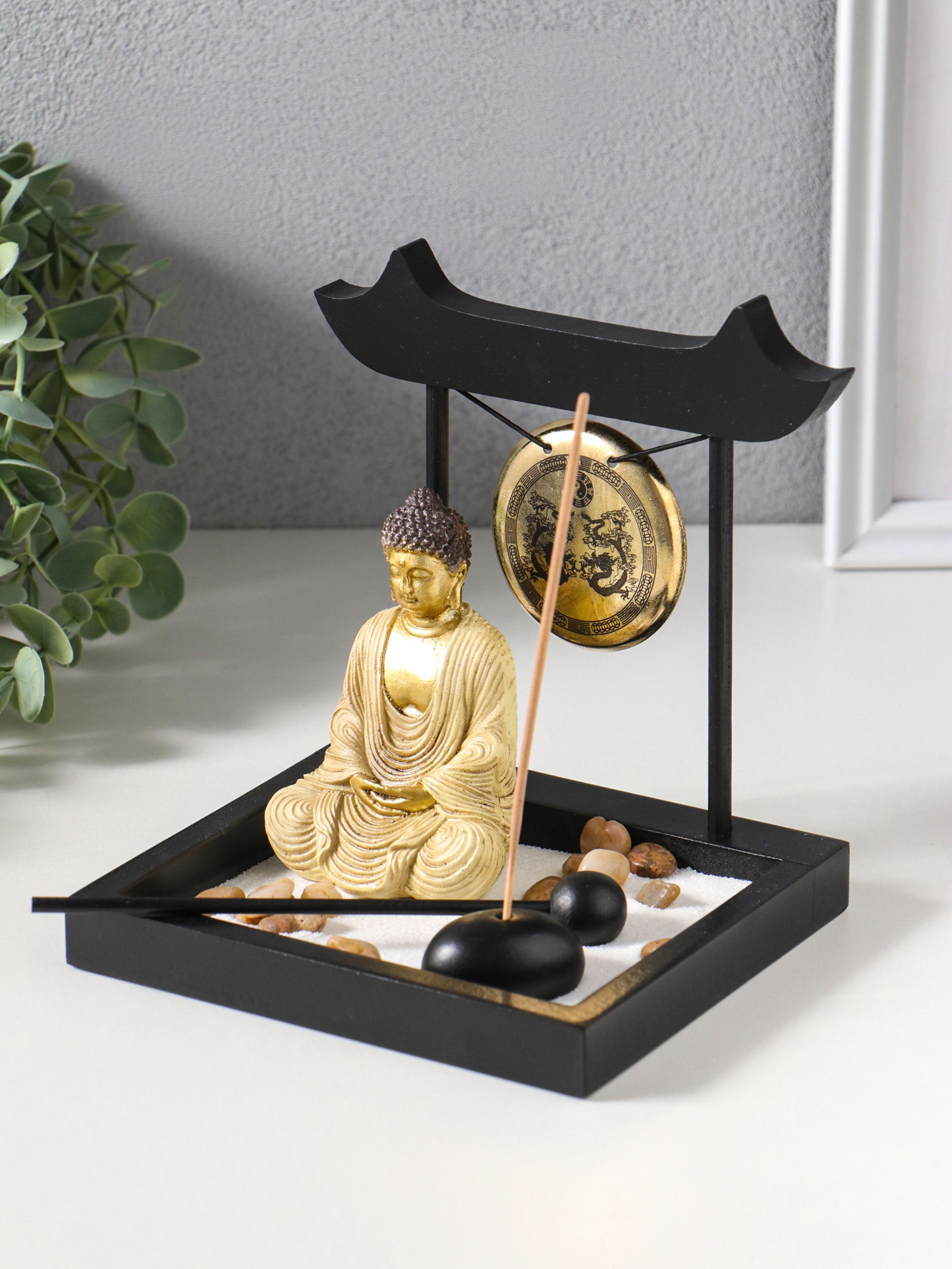 Японский сад камней настольный "Дзен. Будда в кремовом у гонга", с подставкой для благовоний и набором аксессуаров, 13.2x15x16 см, 15x13.2x16 см., Китай