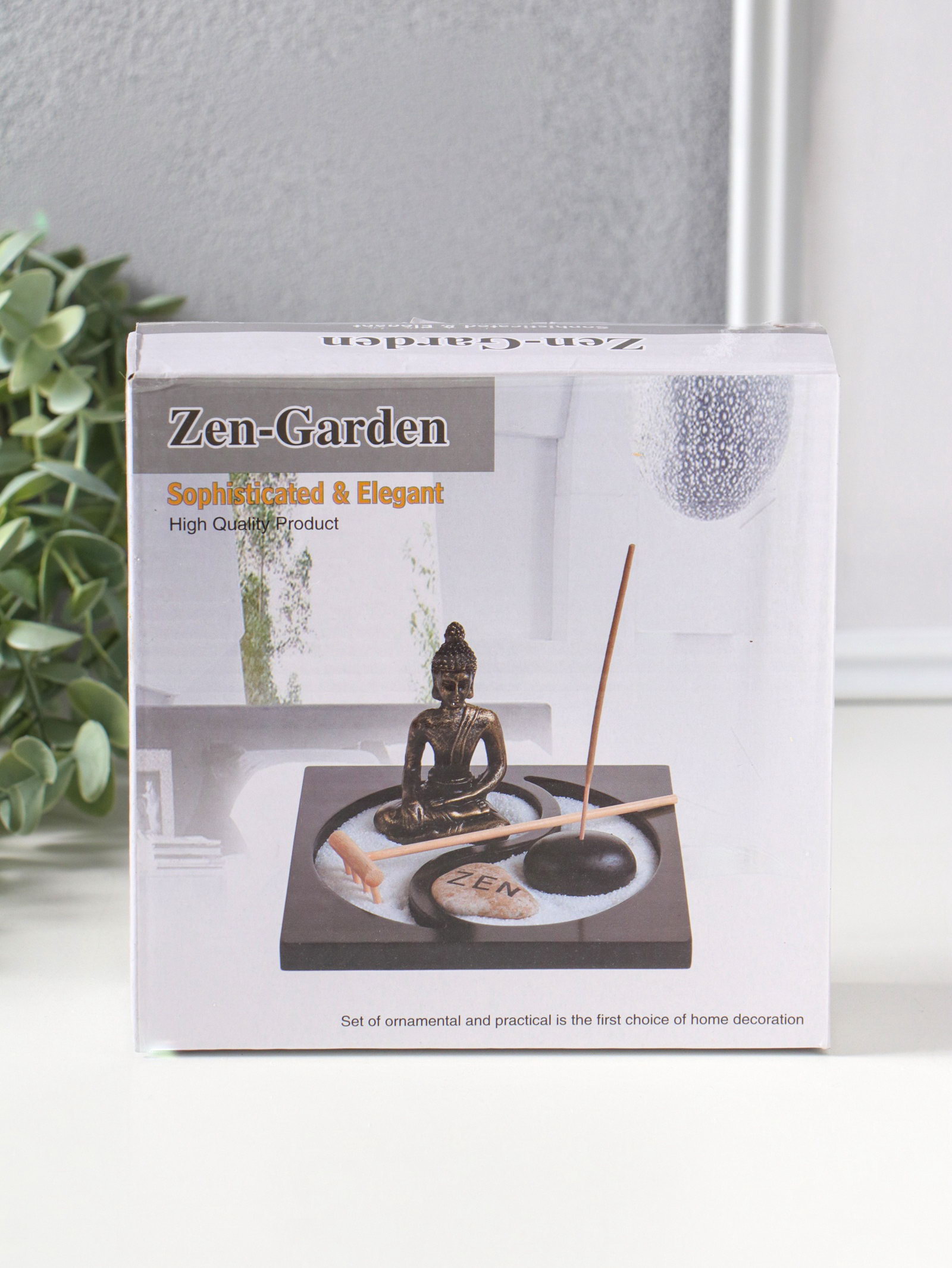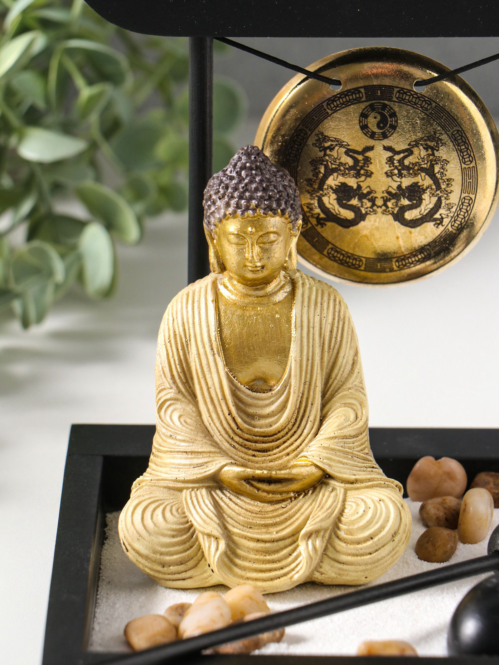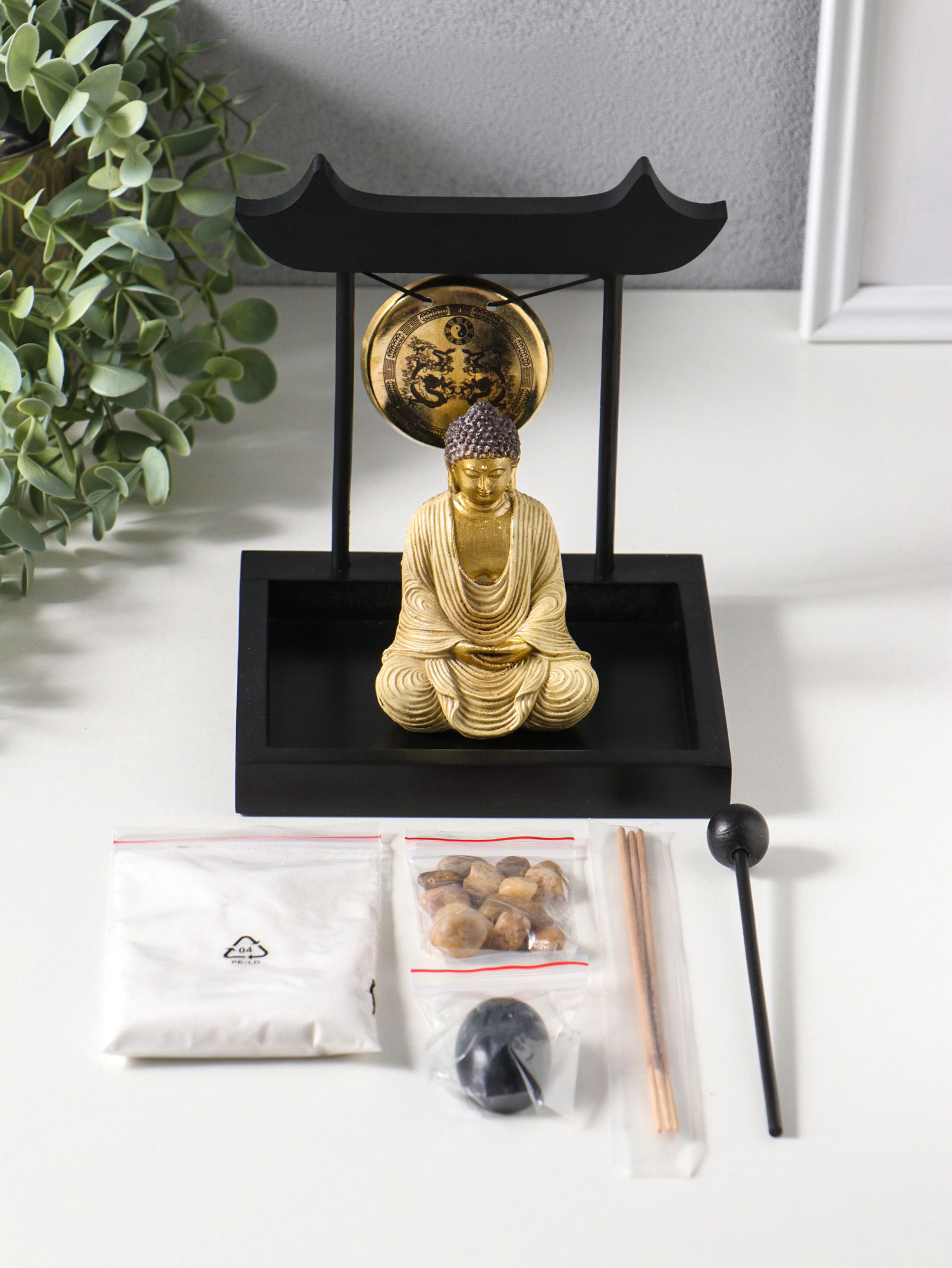 Японский сад камней настольный "Дзен. Будда в кремовом у гонга", с подставкой для благовоний и набором аксессуаров, 13.2x15x16 см, 15x13.2x16 см., Китай