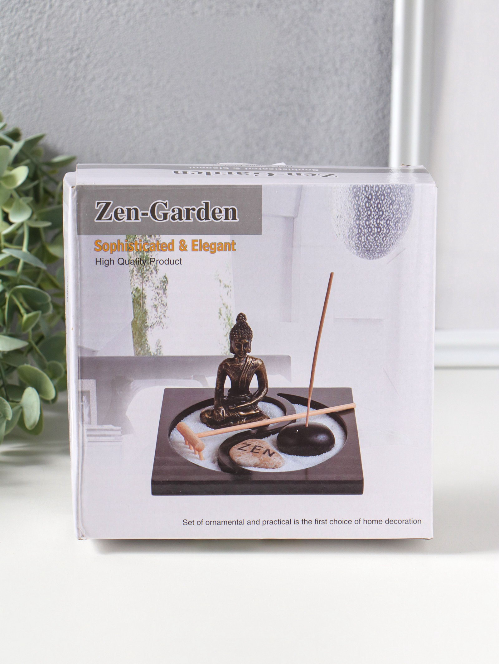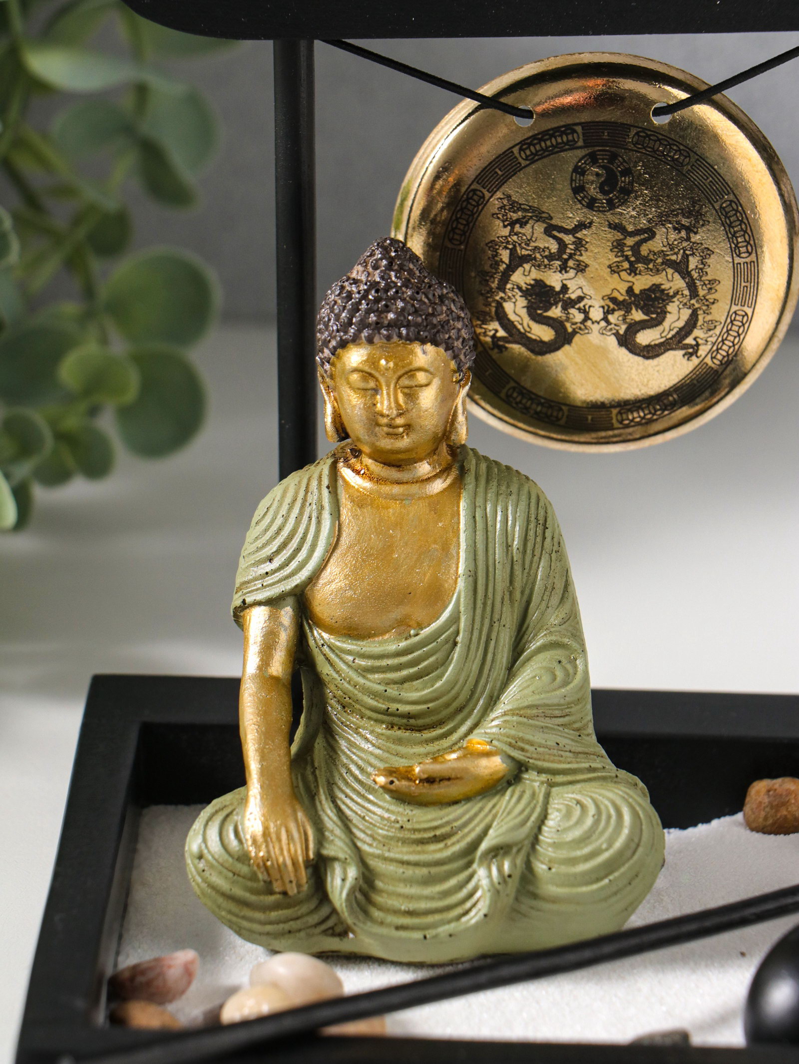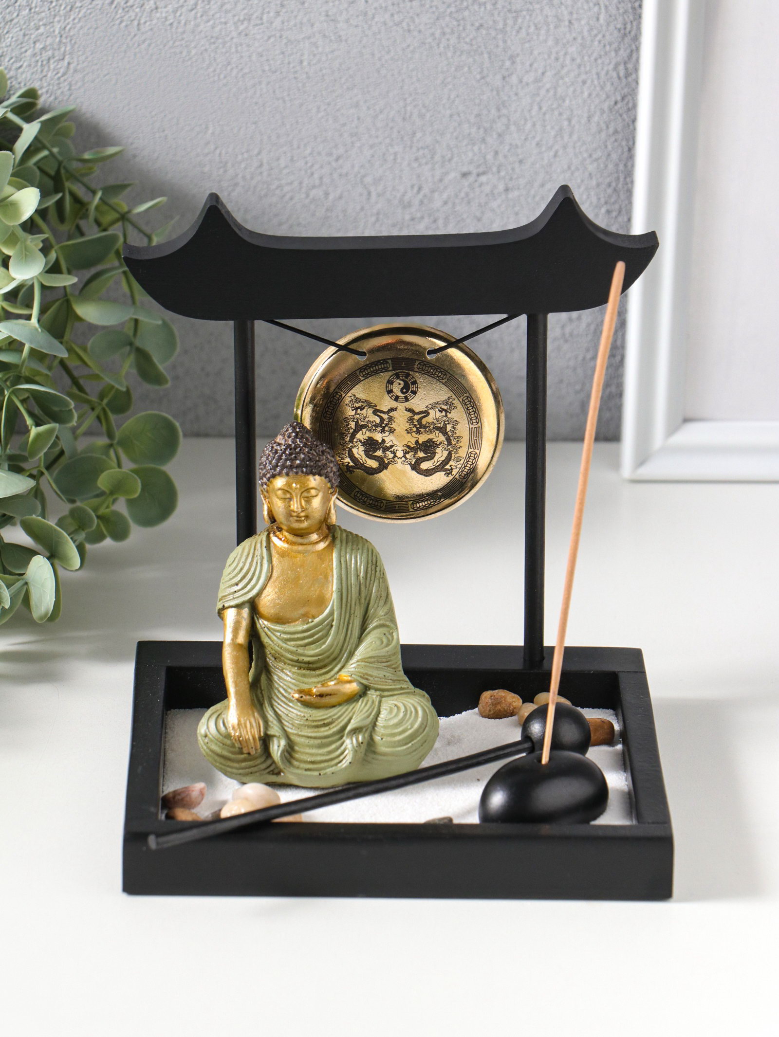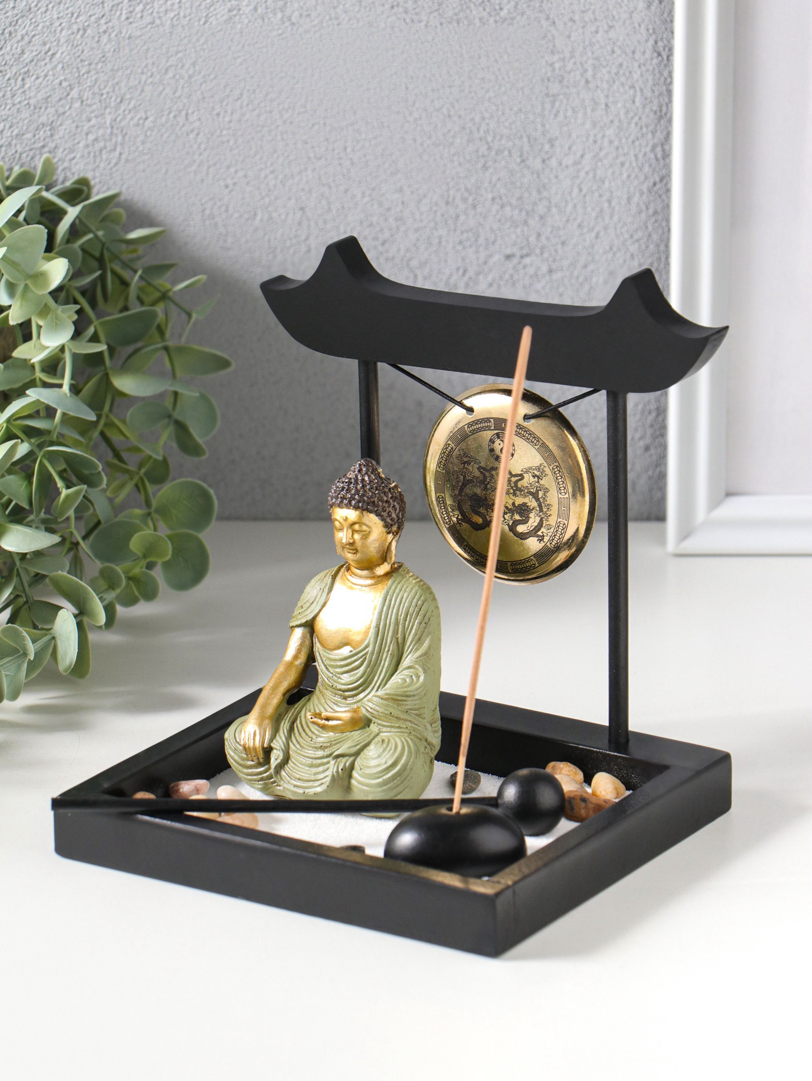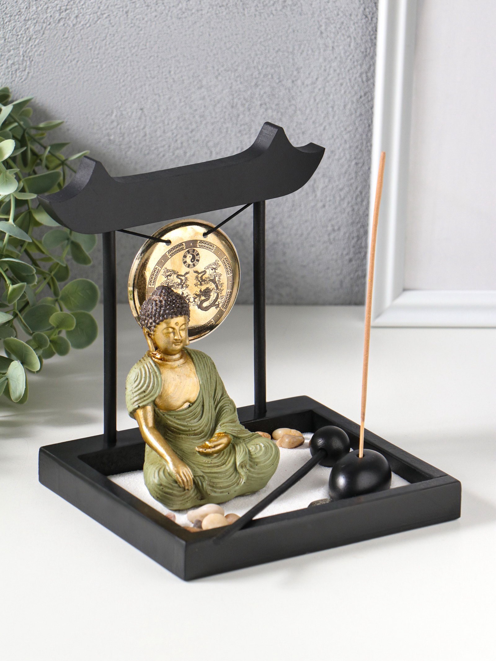 Японский сад камней настольный "Дзен. Будда в зелёном у гонга", с подставкой для благовоний и набором аксессуаров, 13.2x15x16 см, 15x13.2x16 см., Китай
