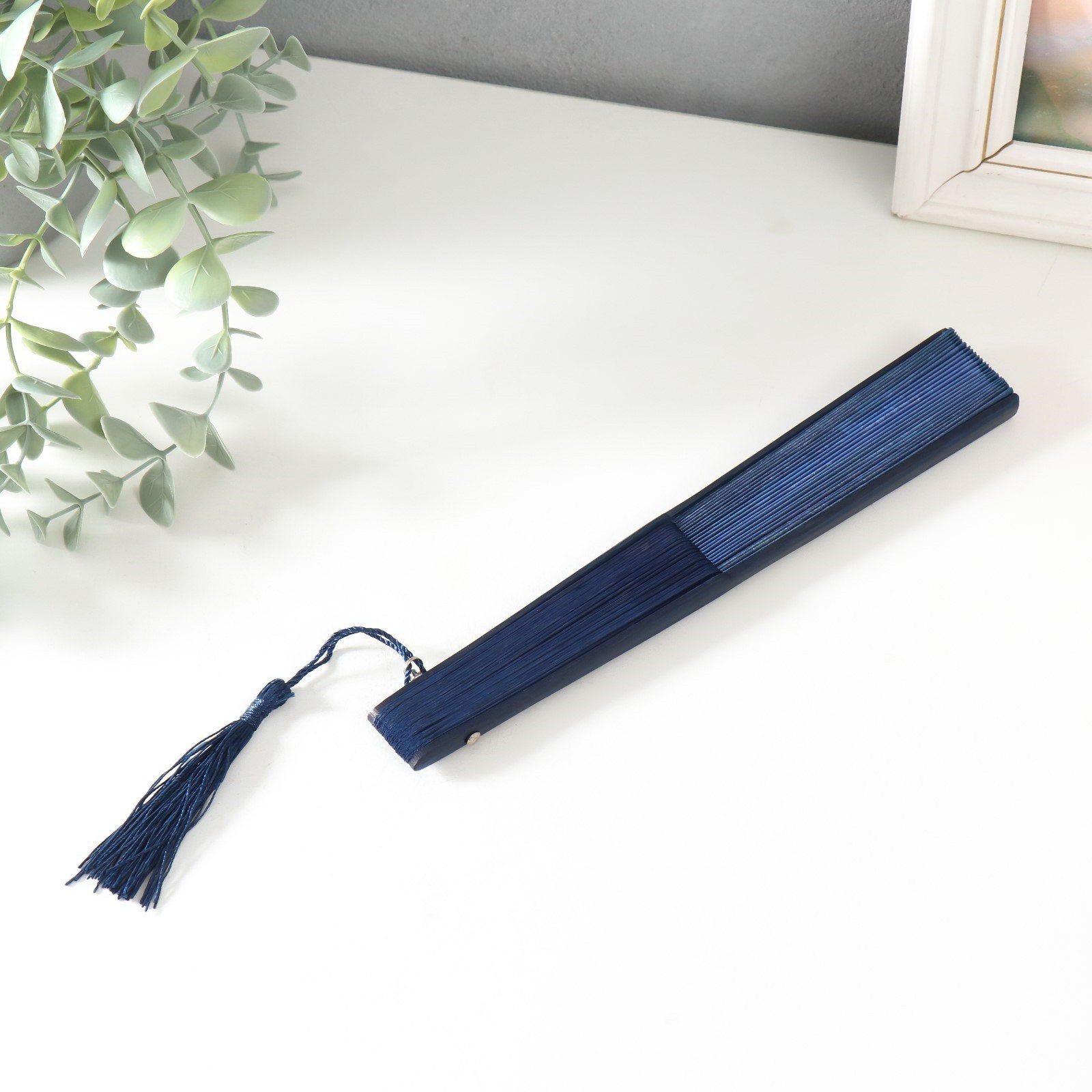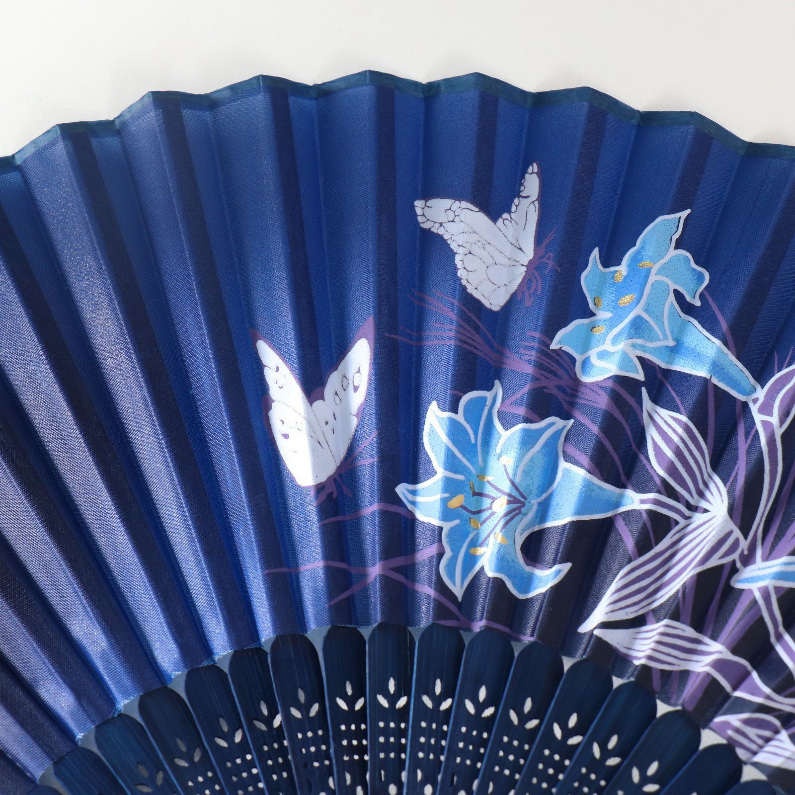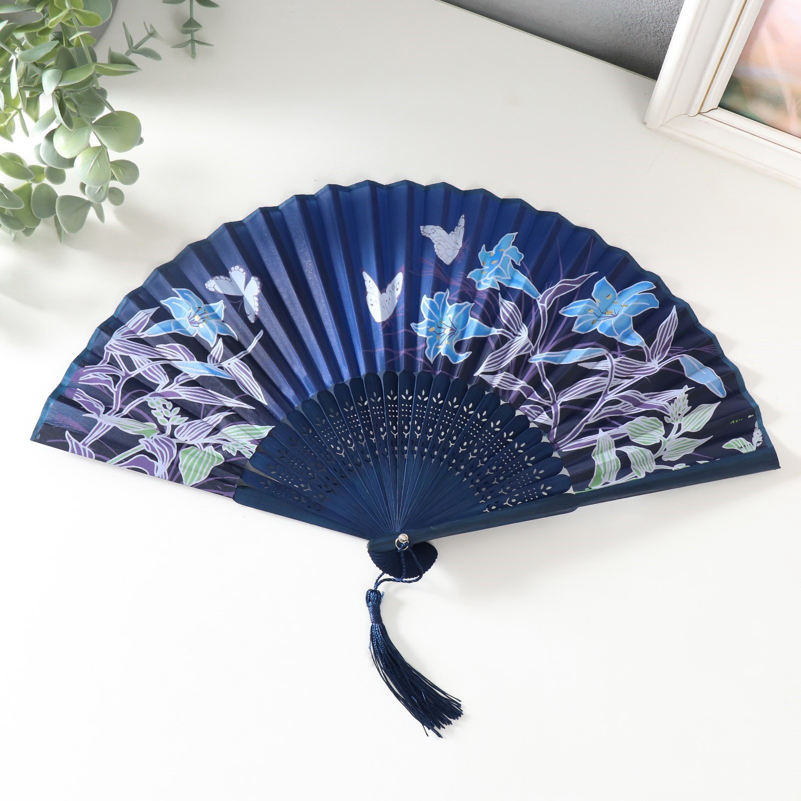 Веер складной h=21 см "Синии лилии и бабочки", синий, с кисточкой, 21 см., Китай