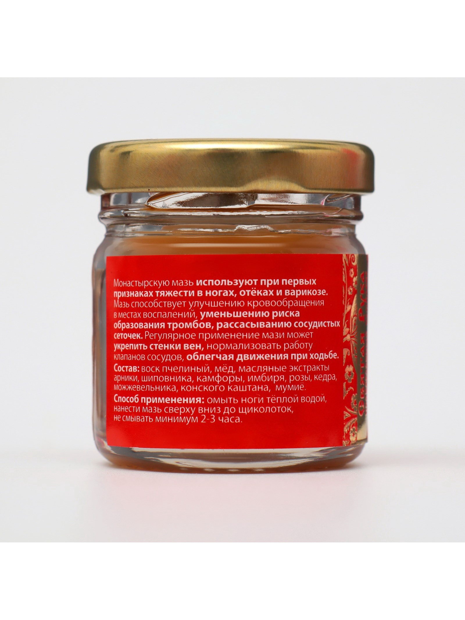 Компоненты: Имбирь, Каштан, Кедр, Мёд, Можжевельник, Мумиё, Пчелиный воск, Шиповник Показания: Варикоз, Отеки Размер упаковки: 4.5 x 5 x 4.5 см. Тип кожи: Для всех типов Возраст: Для всех возрастов Область применения: Для тела Применение: Универсальный tnved: 3304990000 Температурное ограничение: Нет Вес, г/Объём, мл: 30 Вид: Мазь Монастырскую мазь используют при первых признаках тяжести в ногах, отёках и варикозе. Мазь способствует улучшению кровообращения в местах воспалений, уменьшению риска образования тромбов, рассасыванию сосудистых сеточек. Регулярное применение мази может укрепить стенки вен, нормализовать работу клапанов сосудов, облегчая движения при ходьбе. Состав: воск пчелиный, мёд, масляные экстракты арники, шиповника, камфоры, имбиря, розы, кедра, можжевельника, конского каштана, мумиё. Способ применения: омыть ноги тёплой водой, нанести мазь сверху вниз до щиколоток, не смывать минимум 2-3 часа. Противопоказания: индивидуальная непереносимость компонентов. Не является лекарственным средством. Средство косметическое для ухода за кожей. Только для наружного применения. | ||