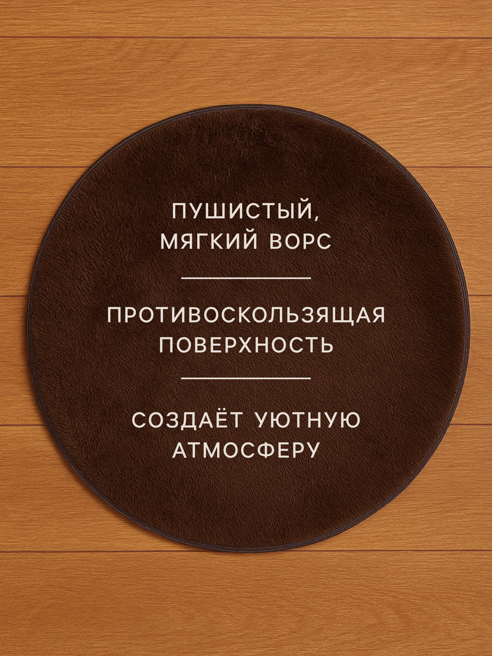 Назначение: Взрослым, Детям Рекомендации по уходу: Глажка запрещена, Не отбеливать, Ручная стирка Сезон: Весна, Зима, Лето, Осень Размер упаковки: 10 x 10 x 80 см. tnved: 5705003000 Цвет: Коричневый Вид упаковки: Пакет Вид: Ковёр Декоративные элементы: Без элементов Тематика: Однотонная Форма: Круглая Высота ворса, мм: 30 Материал основы ковра: Полиэстер Ширина, см: 80 Высота ворса: Длинный (от 20 мм) Фактура материала: Ворсистый Круглый коврик коричневого цвета станет стильным дополнением вашего интерьера, привнося в пространство тепло и уют. Изготовленный из полиэстера, этот коврик прекрасно подходит как для взрослых, так и для детей, создавая комфортную атмосферу в любом уголке вашего дома. Его однотонный дизайн легко вписывается в различные стили оформления от современного минимализма до классической элегантности. Особенности