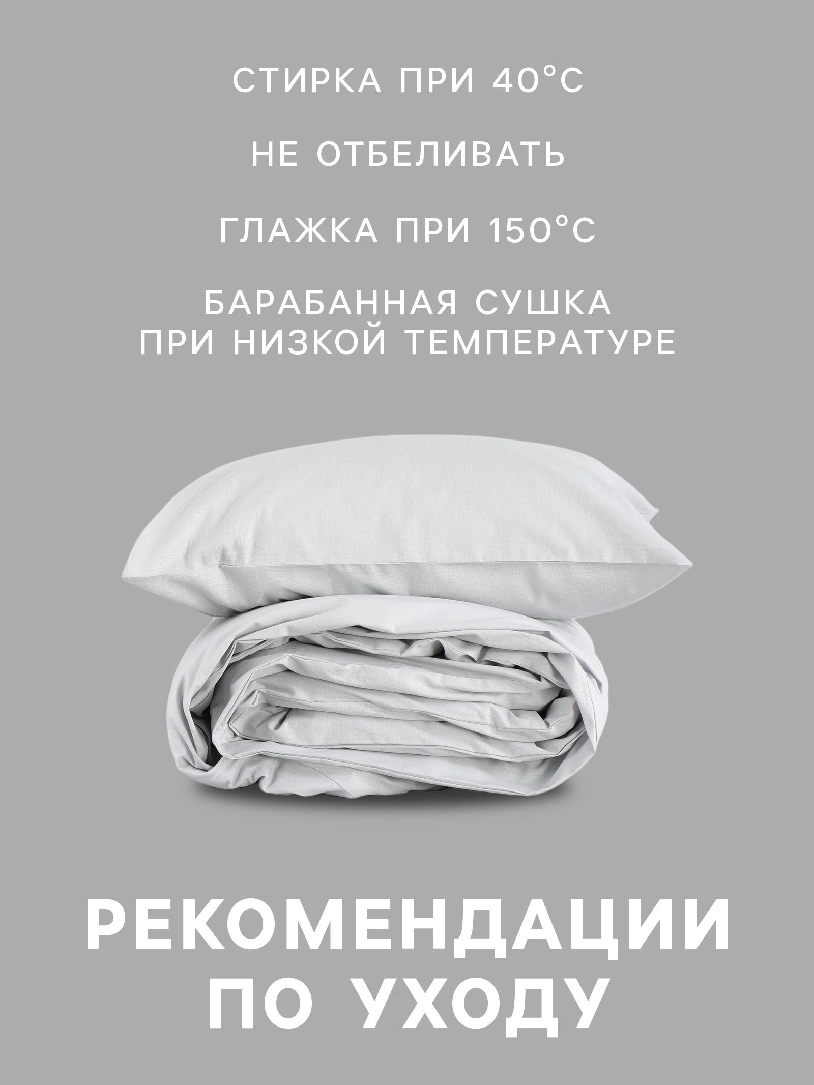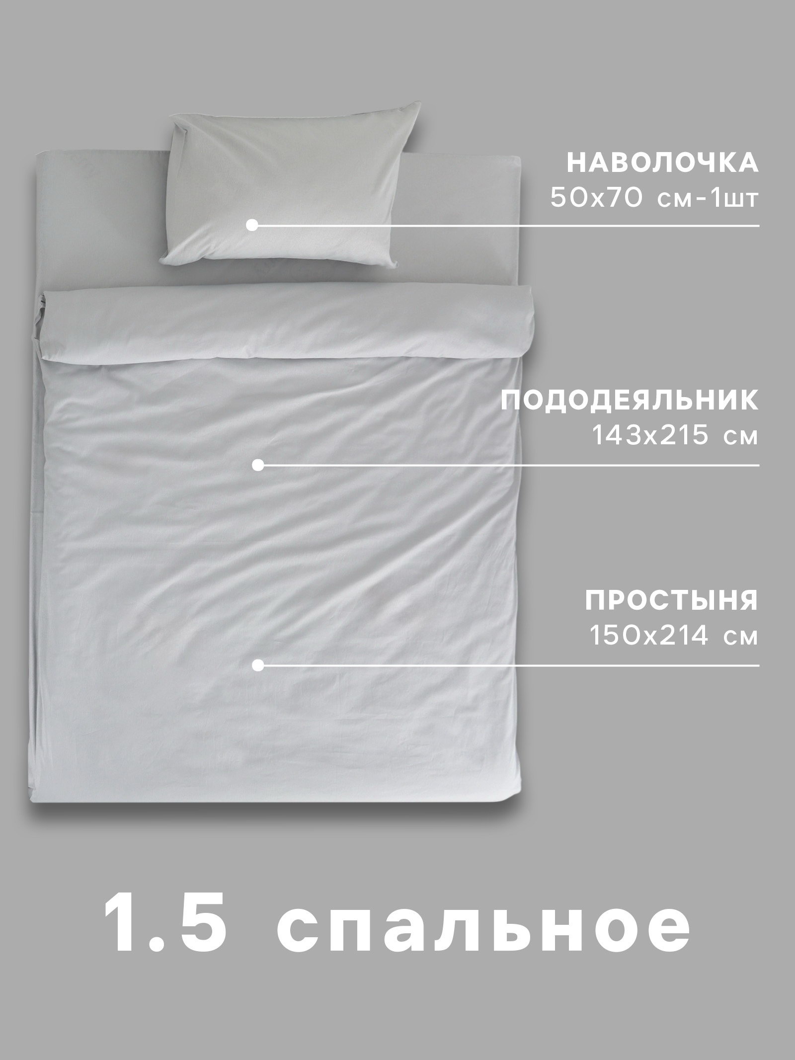 Рекомендации по уходу: Барабанная сушка при низкой температуре, Глажка при 150 ℃, Не отбеливать, Стирка при 40 ℃ Комплектация: Наволочка, Пододеяльник, Простыня Назначение: Взрослым, Детям Размер упаковки: 30 x 6 x 30 см. tnved: 6302210000 Температурное ограничение: Нет Честный знак: Честный знак Размер: 1.5-спальное см Размер простыни, см: 150 x 214 Вид застёжки пододеяльника: Без застёжки На резинке: Нет Простыня в комплекте: Да Ткань: Бязь Цвет: Серый Состав ткани: Хлопок Тематика: Однотонная Вид упаковки: PVC-коробка Количество наволочек: 1 Размер пододеяльника, см: 143 x 215 Вид застёжки наволочки: Клапан Размер наволочки, см: 50 x 70 Декоративные элементы: Без элементов | ||