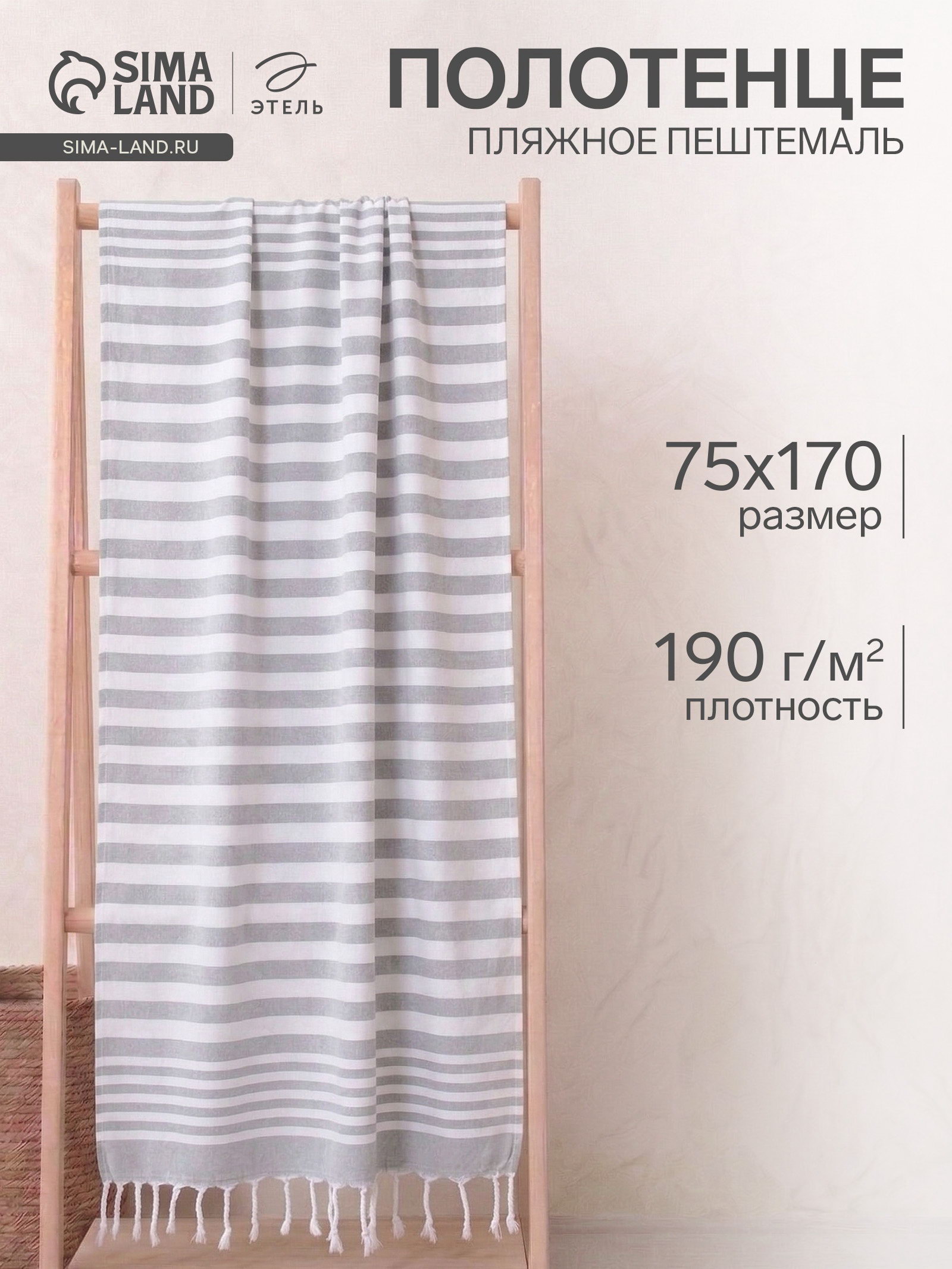 Полотенце пляжное пештемаль 75x170 см, серое, 40x30x0.8 см., Этель, Китай
