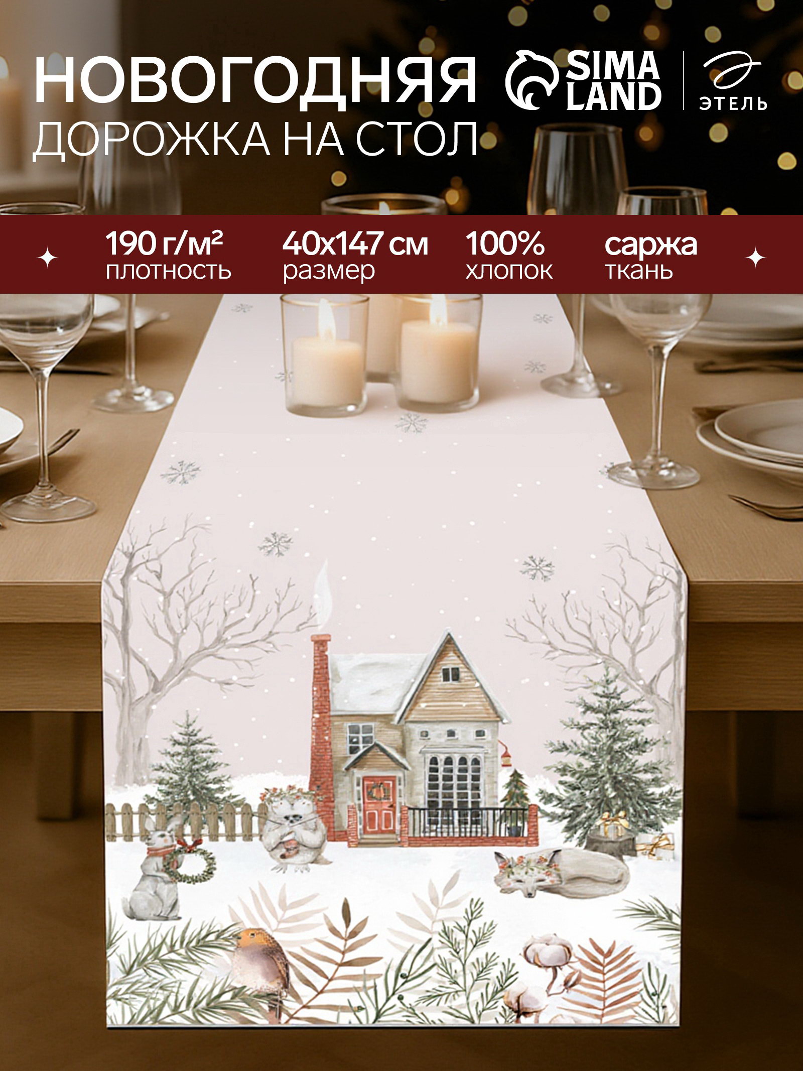Цвет: Бежевый, Белый Рекомендации по уходу: Барабанная сушка при низкой температуре, Глажка при 110 ℃, Не отбеливать, Стирка при 30 ℃ Сезон: Весна, Зима, Лето, Осень Размер упаковки: 13 x 1 x 23 см. Форма: Прямоугольник tnved: 6302510000 Ткань: Саржа Тематика: Новогодняя Размер, см: 40 x 147 Коллекция: Кухонный текстиль к Новому году Декоративные элементы: Без элементов Состав ткани: Хлопок Тематика праздника: Новый год Комплектация: Дорожка на стол Вид упаковки: Пакет В подарочной упаковке: Нет Рисунок: Да Температурное ограничение: Нет Плотность, г/?2: 190 Фактура материала: Гладкий Назначение: Взрослым Честный знак: Честный знак Тип принадлежности к праздникам: Новый год Новогодняя скатерть-дорожка с городскими животными создаёт праздничное настроение за обеденным столом. Её плотный хлопковый материал приятен на ощупь и устойчив к частому использованию. Прямоугольная форма и нейтральная цветовая гамма гармонично сочетаются с любой посудой и декором, позволяя легко менять стиль сервировки. Особенности