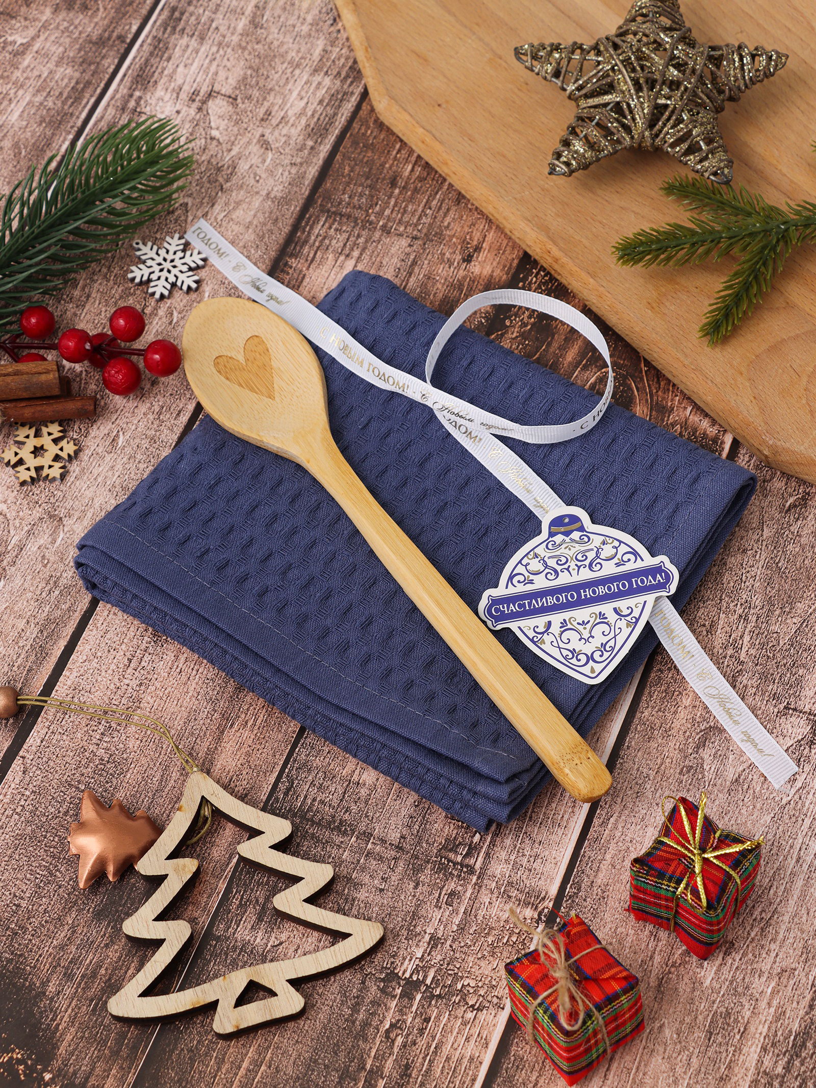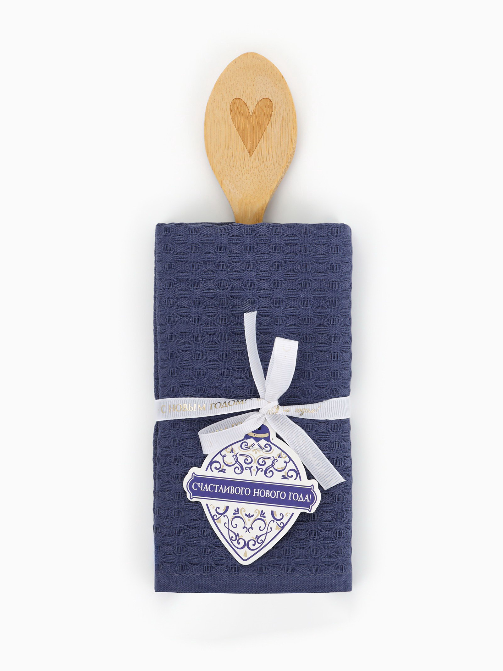 Набор подарочный Winter: синее полотенце 35x60 см, хлопок 100%, вафля 220 г/?2, деревянная ложка, Доляна, Россия