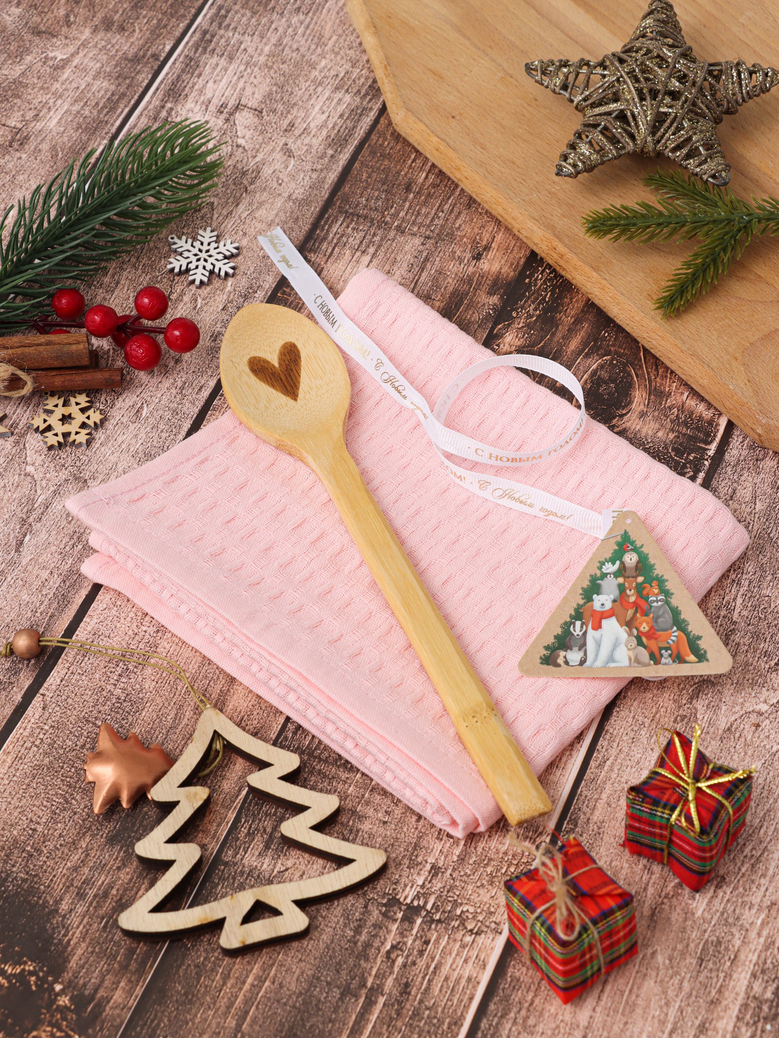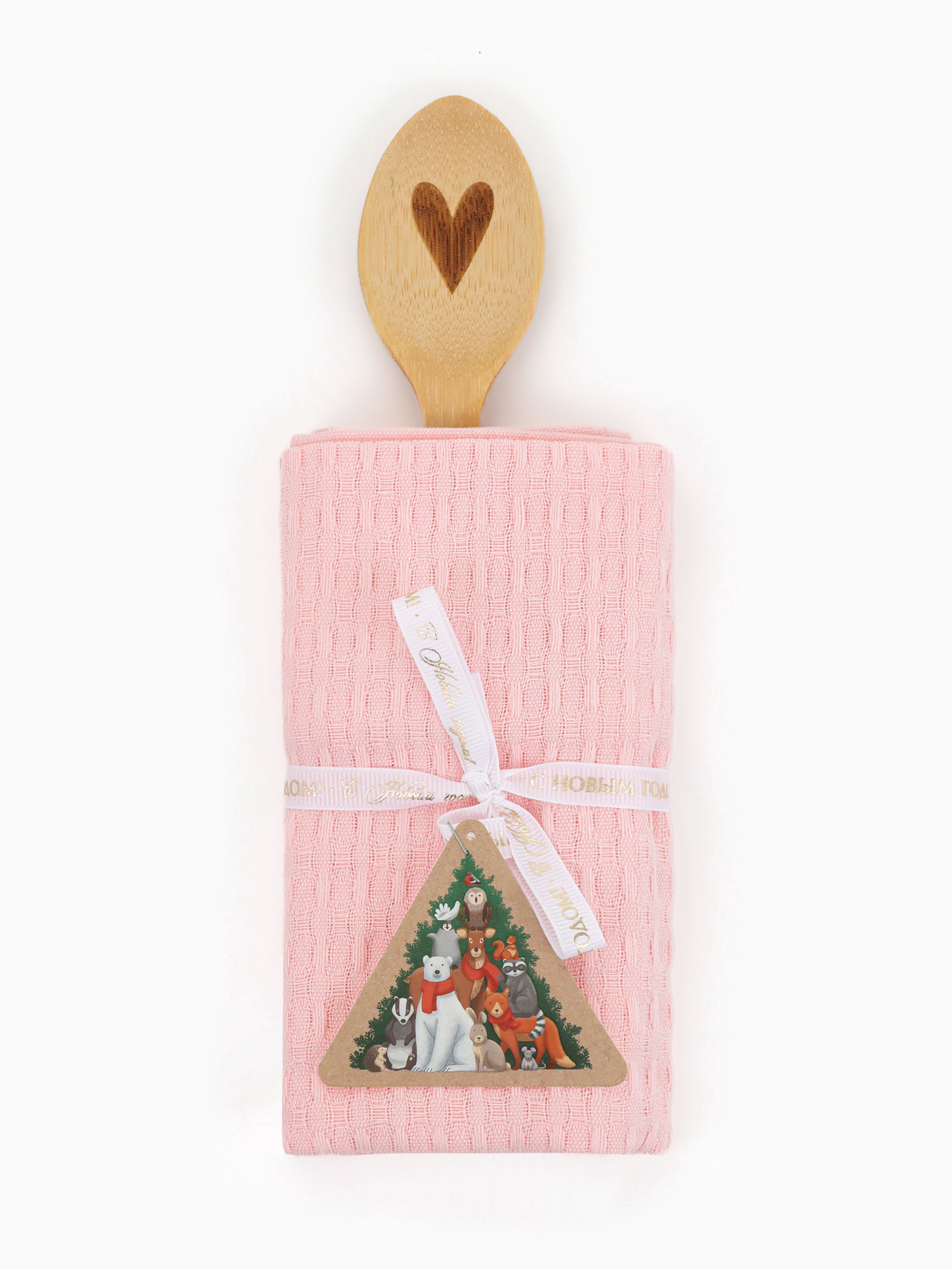 Набор подарочный Winter: розовое полотенце 35x60 см, хлопок 100%, вафля 220 г/?2, деревянная ложка, Доляна, Россия