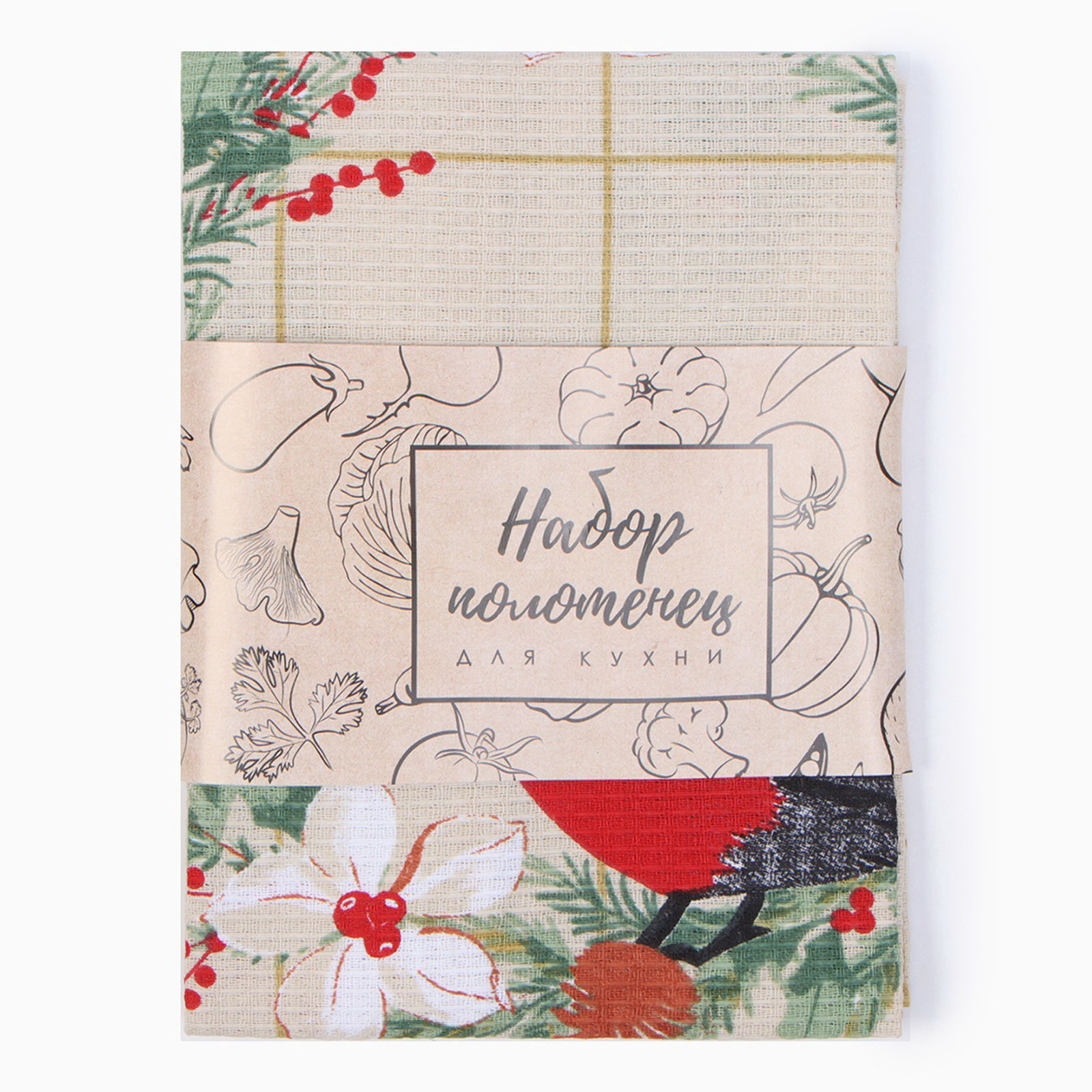 Набор новогодних полотенец "Рождественские цветы" 28x46 см - 2 штуки, 100% хлопок, вафля 160 г/?2, Доляна, Россия