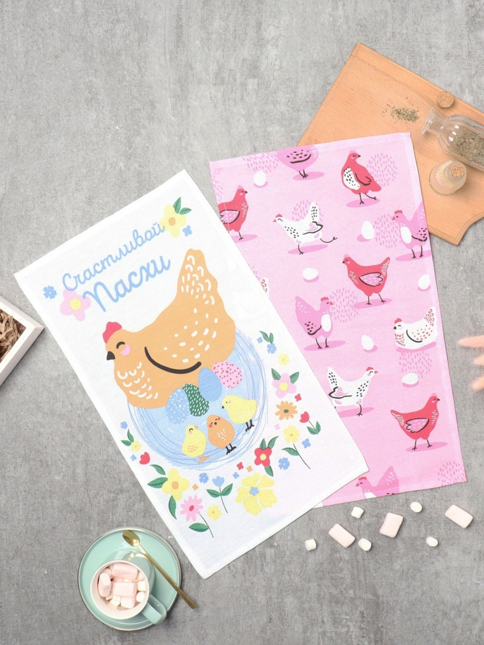 Набор полотенец кухонных "Доляна. Счастливой пасхи", 28x46 см - 2 шт., рогожка, хлопок 100%, 160 г/?2, Доляна, Россия