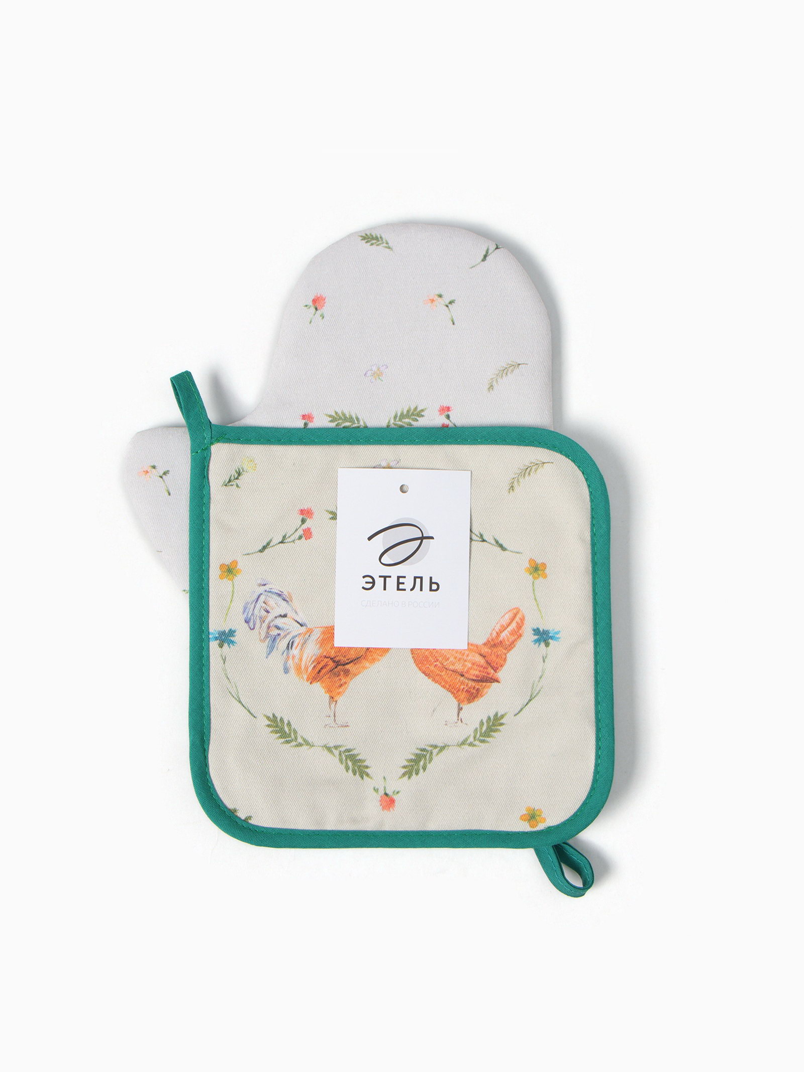 Набор кухонный "Этель. Курочка и петух": варежка-прихватка 20x28 см, прихватка 19x19 см,100% хлопок, Этель, Россия